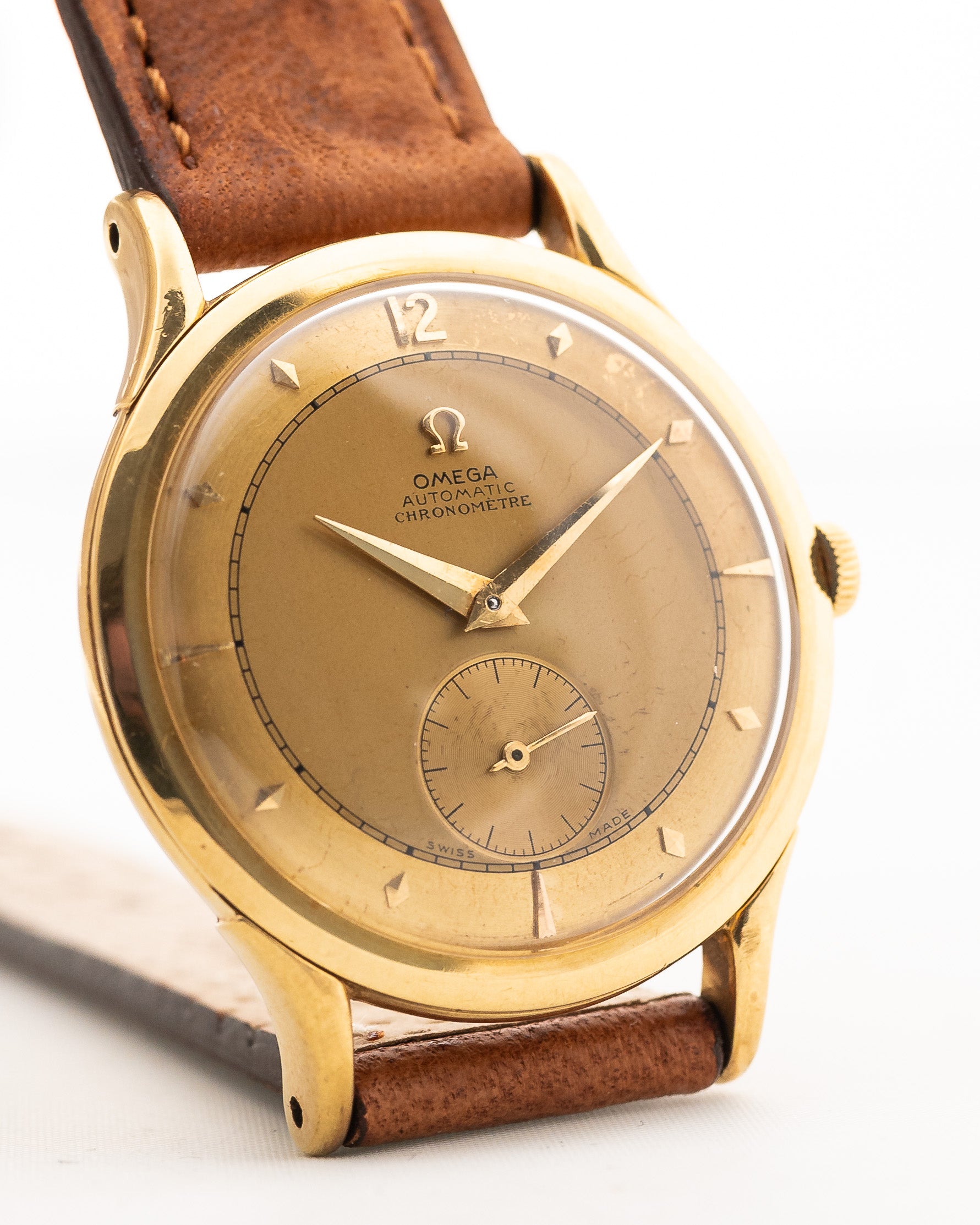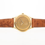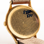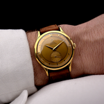 Ausgestattet mit einem 35 mm großen Gehäuse aus 18 Karat Gelbgold, nach unten gedrehten Bandanstößen und einem wunderschönen Railroad-Zifferblatt, ist diese Uhr wirklich unschlagbar. Das Zifferblatt ist wunderschön gealtert und verfügt über eine arabische Zwölf am oberen Rand und diamantförmige Stundenmarkierungen. Ein Hilfszifferblatt für die Sekunde macht diese Uhr zu einem echten Hingucker.
