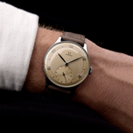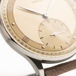 Diese Schönheit besticht durch ein schlichtes Gehäusedesign mit einem fantastischen cremefarbenen Zifferblatt, Blattzeigern, arabischen Stundenmarkierungen und dem zuverlässigen Kal. 30T2 - es stammt aus dem Jahr 1944.