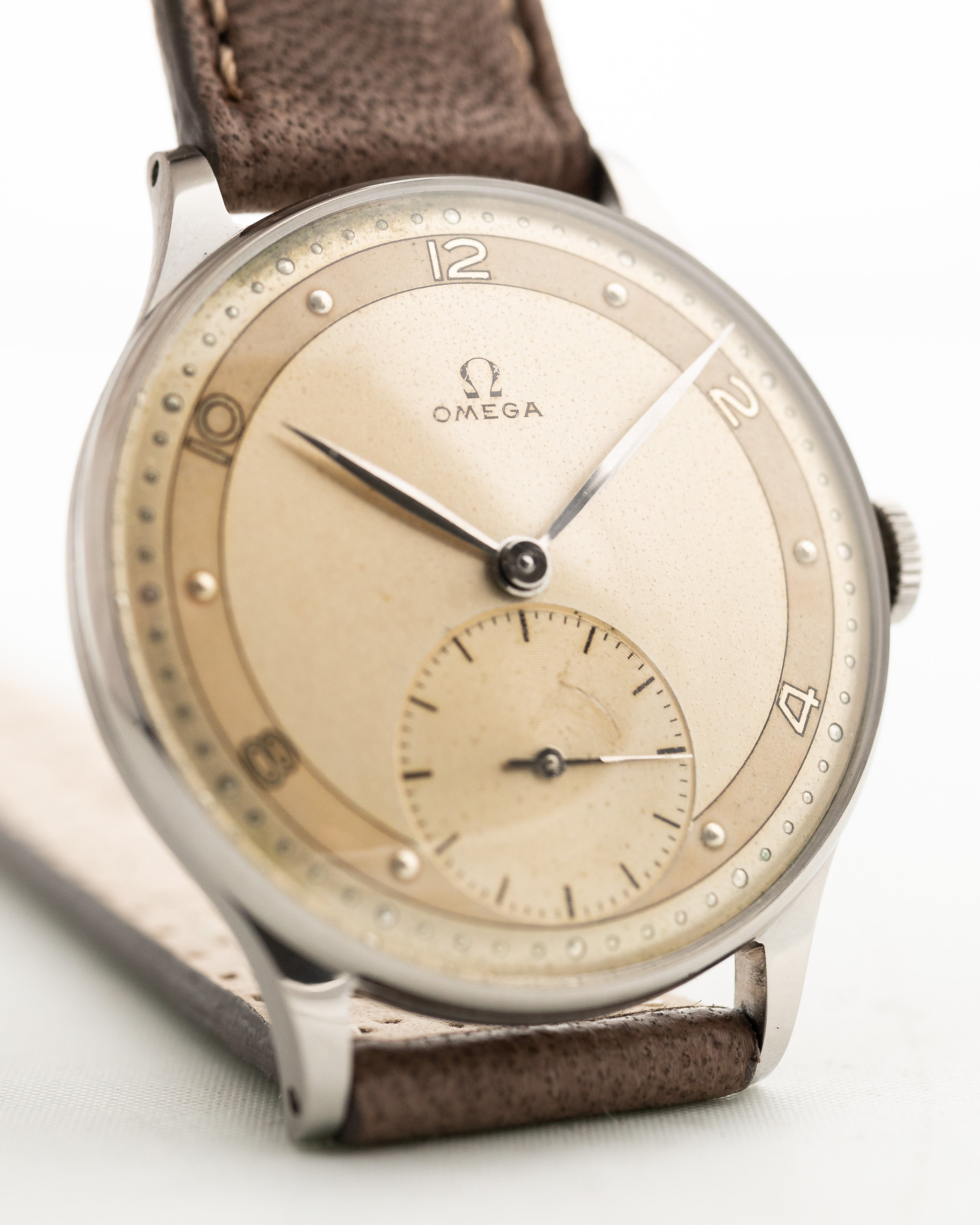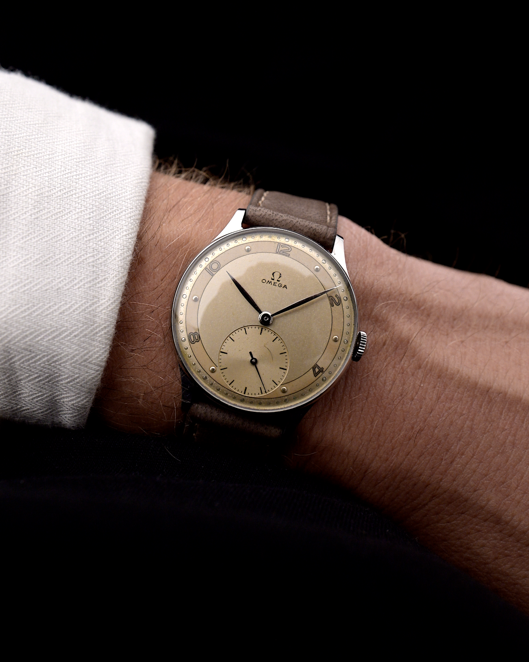 Eine Omega aus den 40er Jahren in gut erhaltenem Zustand zu finden, ist ziemlich schwierig. Aber eine mit einem so gut gestalteten, cremefarbenen Art Deco-Zifferblatt mit einer schönen kleinen Sekunde zu finden, ist fast unmöglich.
