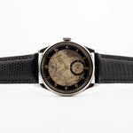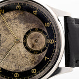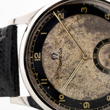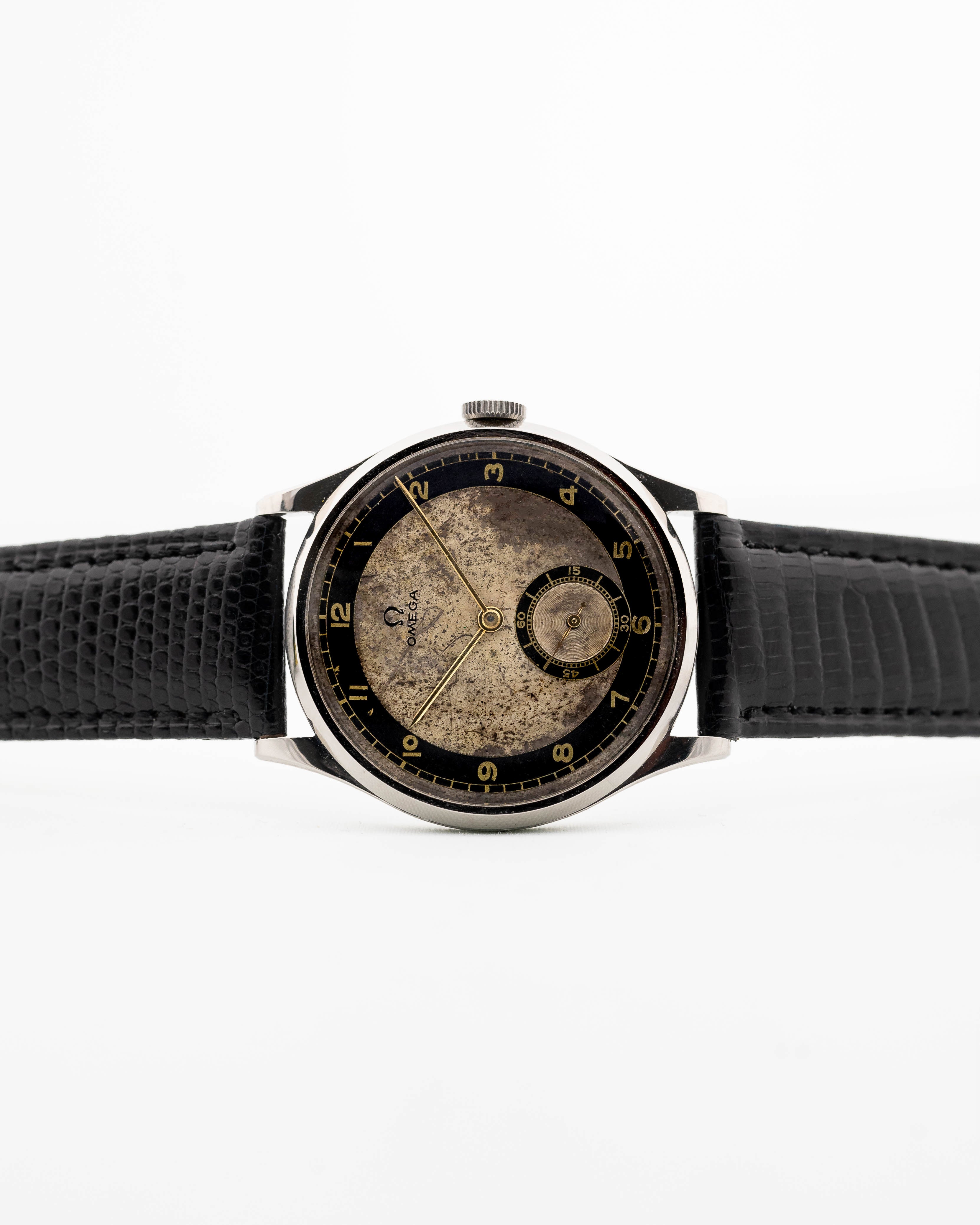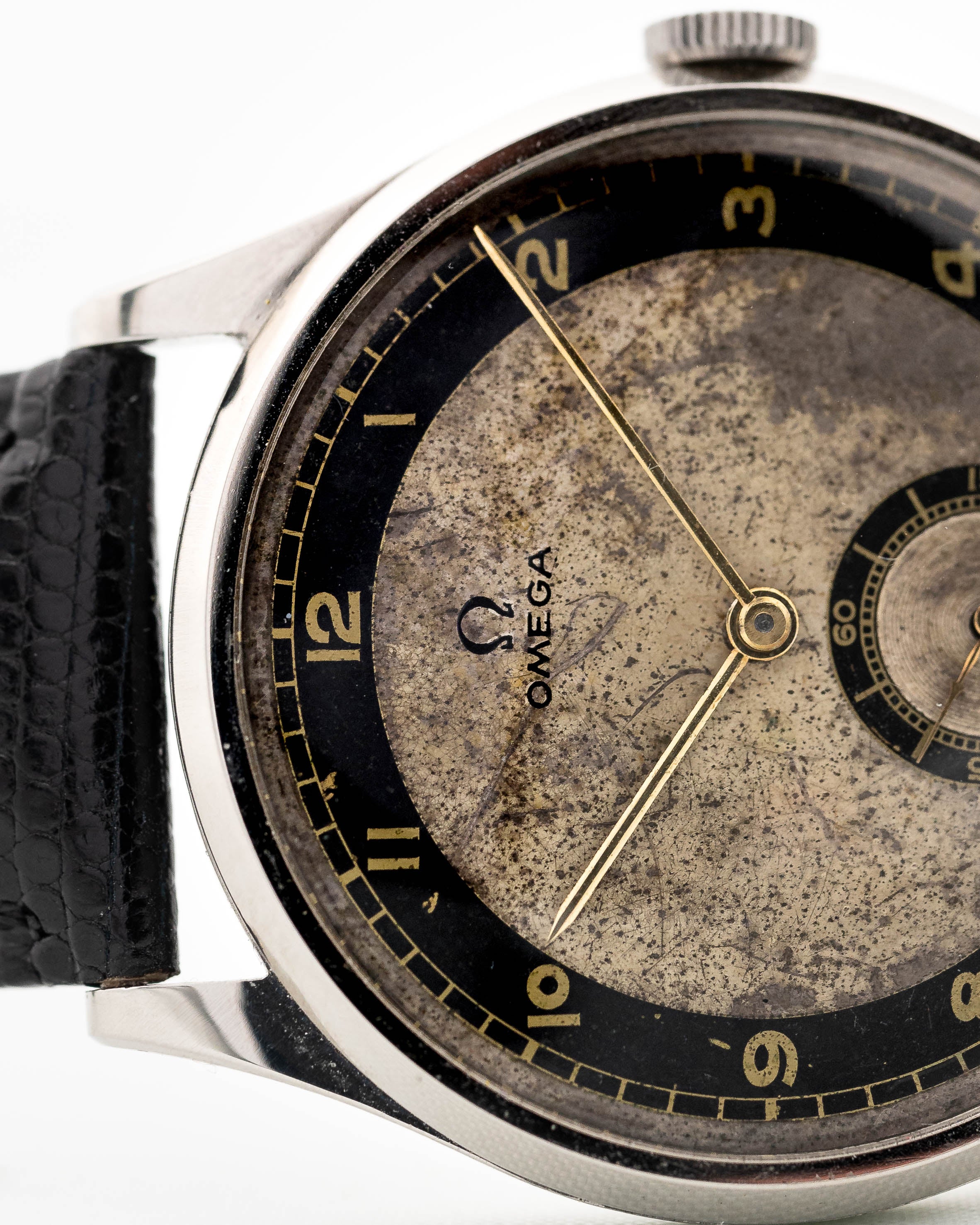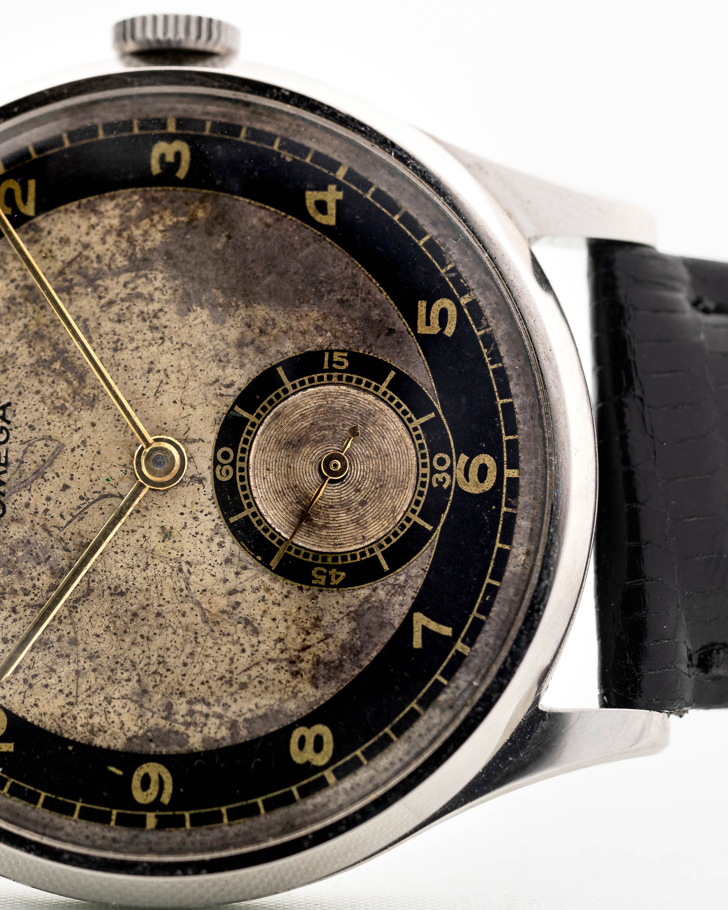 Eine Omega mit einem Jumbo-Gehäuse aus dem Jahr 1939 in gutem Zustand zu finden, ist ziemlich schwierig. Aber eine mit einem auffälligen zweifarbigen Zifferblatt mit einer einzigartigen "Mond"-Patina und einem makellosen Uhrwerk zu finden, ist fast unmöglich.