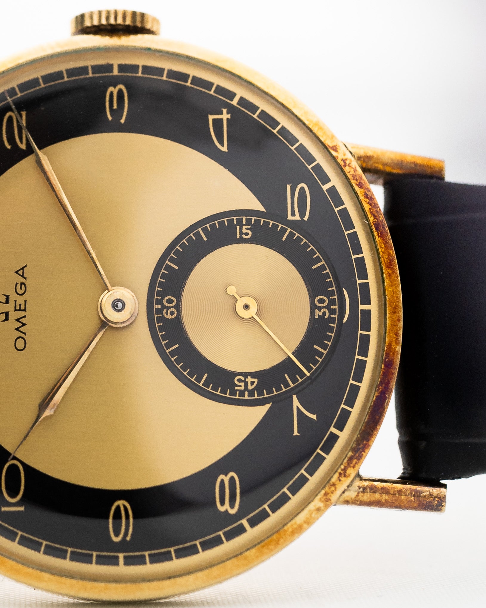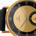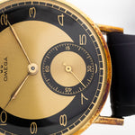 Eine Omega aus den 40er Jahren im Zustand Nos zu finden, ist ziemlich schwierig. Aber eine mit einem erstaunlichen zweifarbigen Art-déco-Zifferblatt und einer schönen Subsekunde zu finden, ist fast unmöglich.
