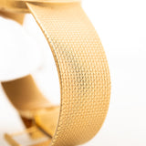 Unser Modell verfügt über ein 34,5 mm großes Gelbgoldgehäuse ohne Bandanstöße, ein atemberaubendes 18k Clous de Paris-Zifferblatt und ein erstaunlich integriertes 18k Gelbgoldarmband mit Patek Philippe Schließe. Das Besondere an dieser Uhr ist, dass sich die Krone auf dem Gehäuseboden befindet, was für einen noch eleganteren und symmetrischeren Look am Handgelenk sorgt.