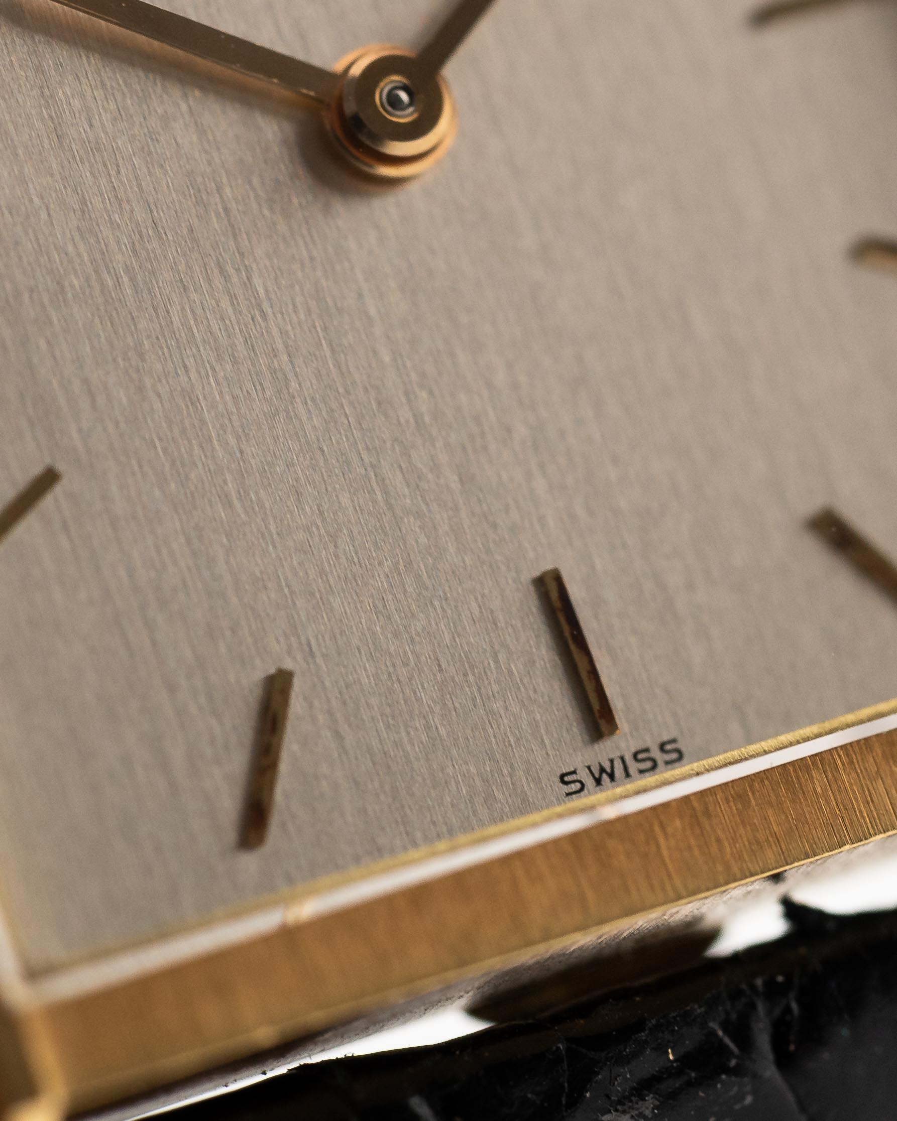 Hier haben wir eine exzellente Darstellung der Patek Philippes Dress Watches, diese Ref. 3519 trifft alle hohen Töne mit einem rechteckigen Gehäuse aus 18 Karat Gelbgold, kurzen abgewinkelten Bandanstößen, einem wunderbar sauberen farbigen Zifferblatt mit vertikalem Pinsel, Strichindizes und Zeigern.