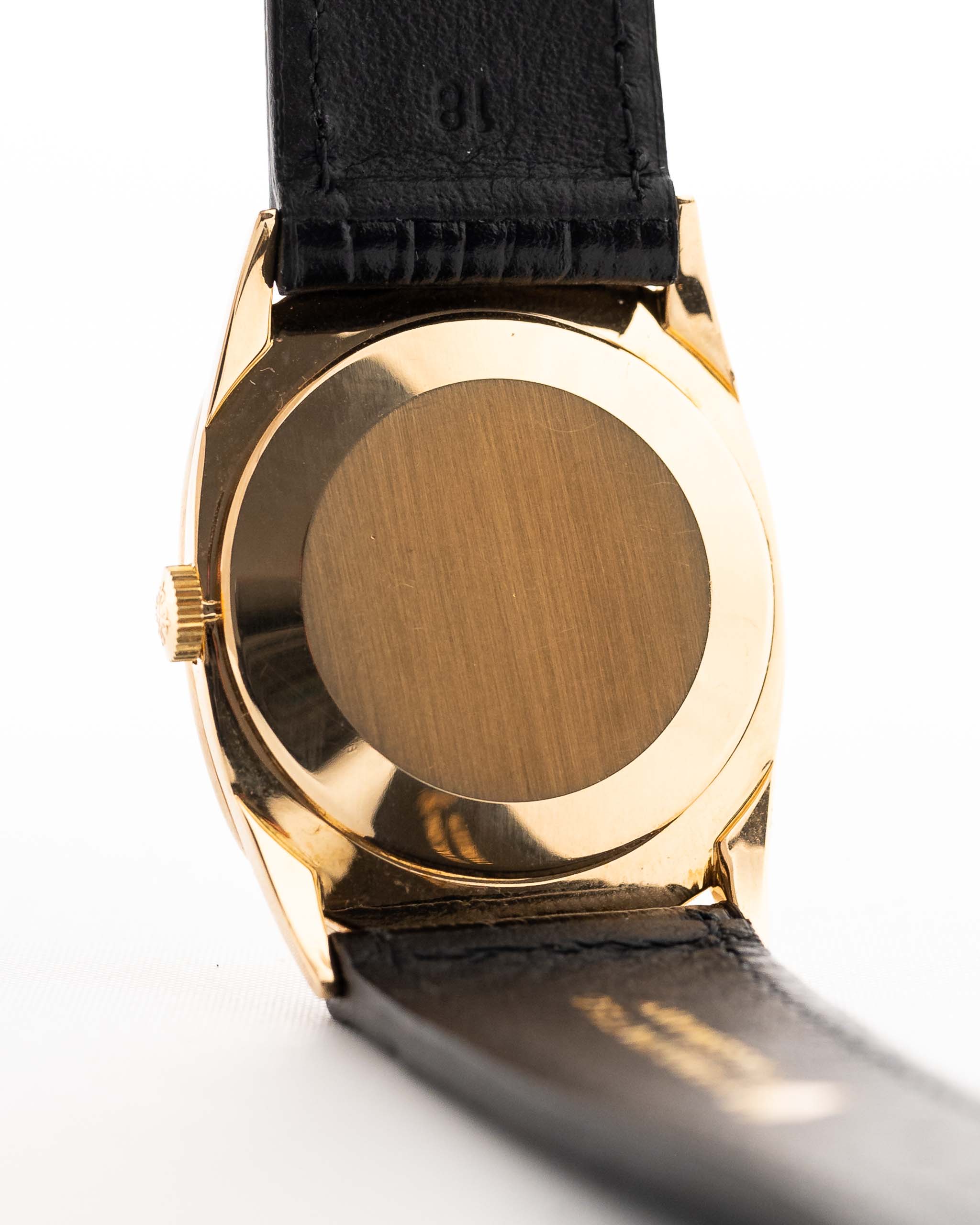 Goldene Vintage Patek Philippe Ellipse 3546 Uhr an einem Handgelenk aus den 1970er Jahren. 27 mm, Gehäuse aus 18 Karat Gelbgold, Handaufzugskaliber 23-300, makelloses goldenes Zifferblatt mit Sonnenschliff und schwarzes Lederarmband.