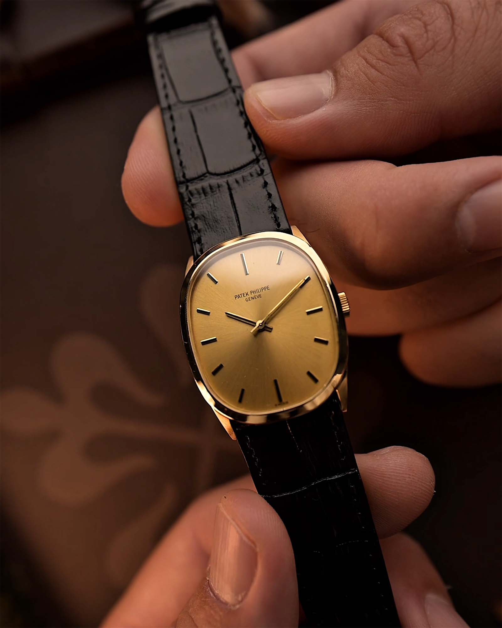 Goldene Vintage Patek Philippe Ellipse 3546 Uhr an einem Handgelenk.