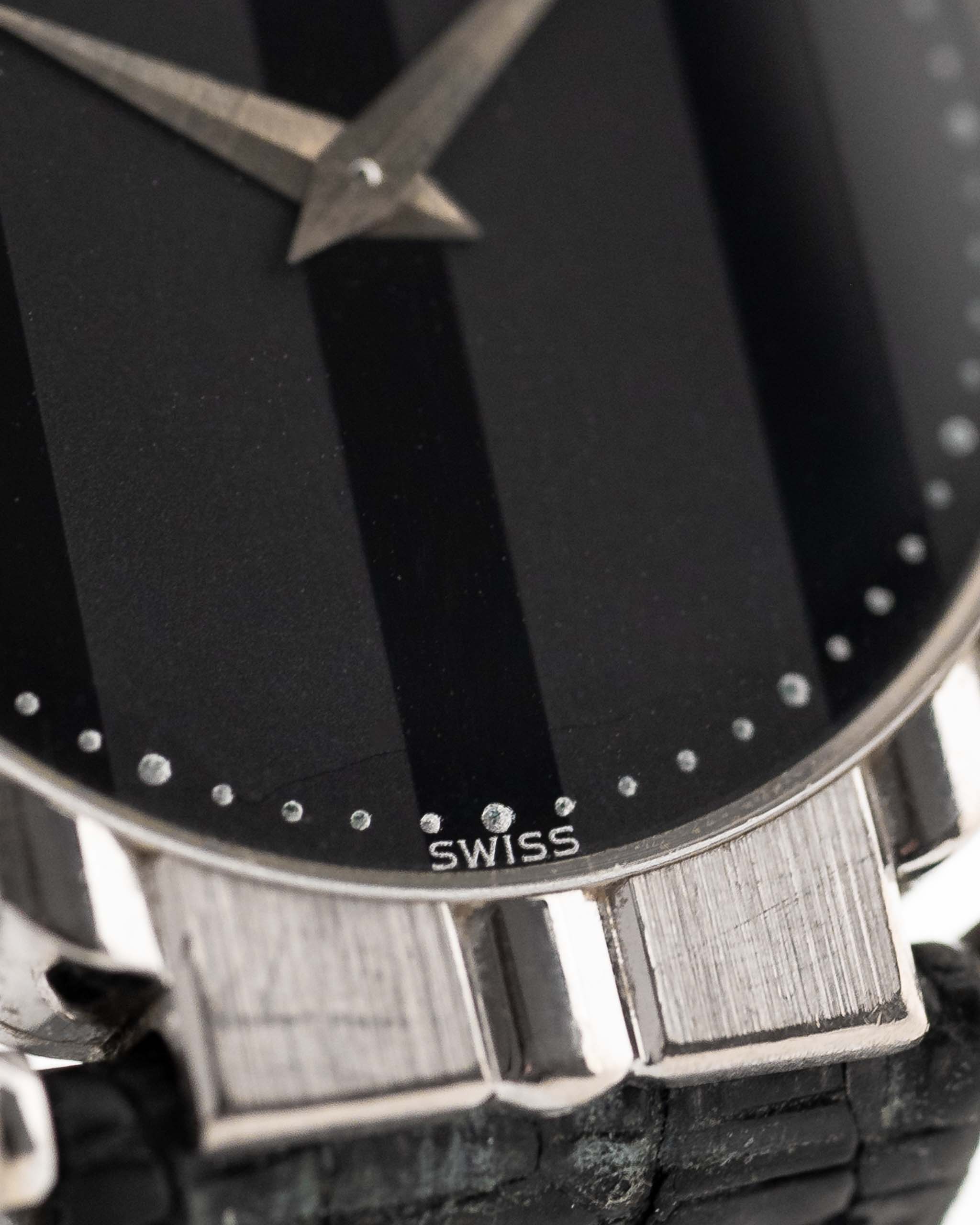 Diese Piaget Polo Referenz 7273 ist aus Weißgold gefertigt. Das Gehäuse dieser Uhr aus 18 Karat Weißgold hat glatte, abgerundete Kanten, die einen schönen Kontrast zu den scharfen, geometrischen Bandanstößen bilden und ein ebenso kühnes wie elegantes Profil ergeben. Es ist schwer, die richtigen Worte für das gestreifte Onyx-Zifferblatt zu finden. Weißgold ist das seltenste Metall, das bei Vintage-Piaget verwendet wird. Nur etwa 10% der Vintage-Piaget wurden in Weißgold hergestellt!