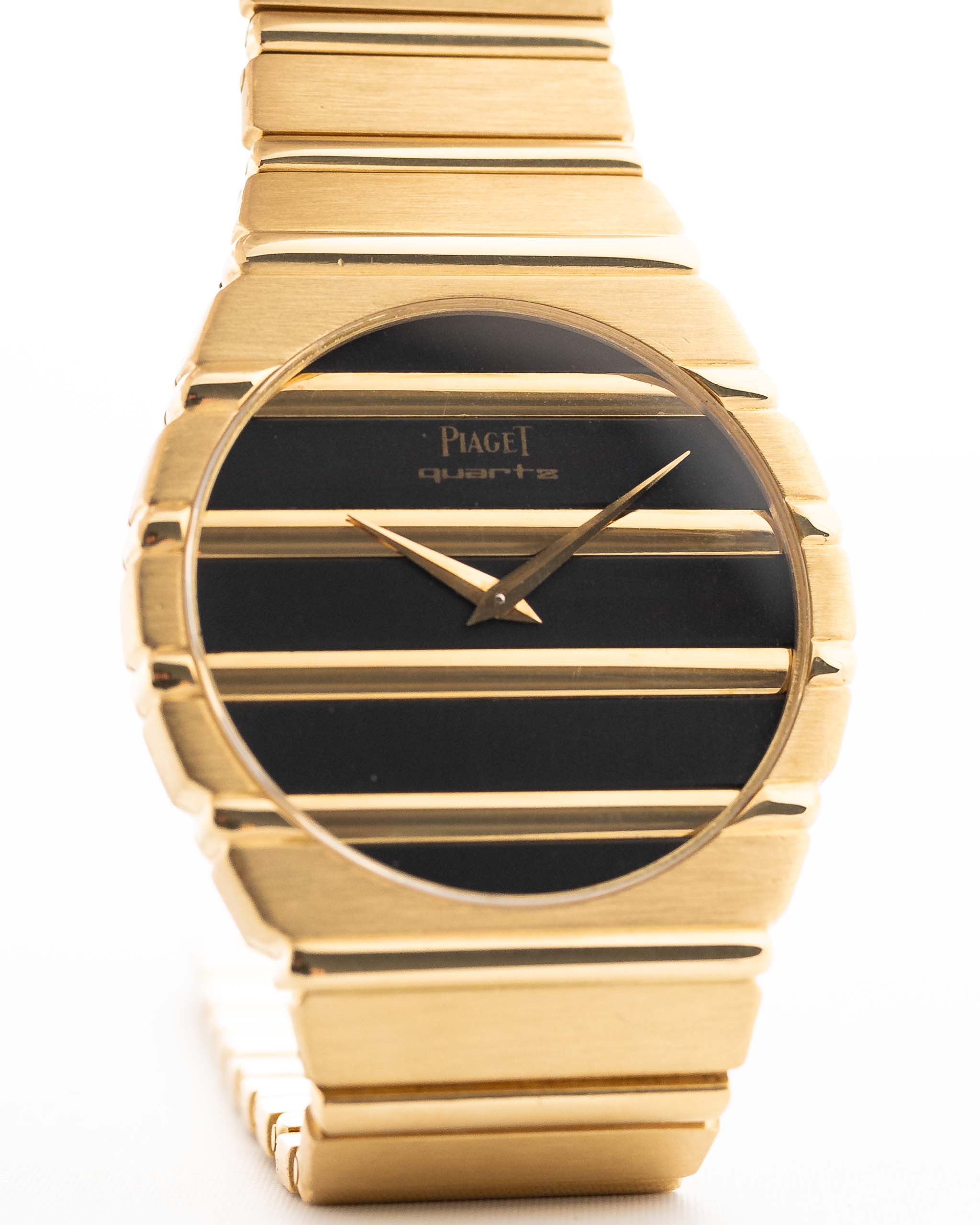 Die Piaget Polo Ref. 7661 C 701 ist der kühnste Ausdruck des Luxus der 1980er Jahre: eine 34 mm große Jumbo-Version, komplett aus 18 Karat Gelbgold gefertigt, mit einem makellosen Zifferblatt aus Onyx-Steinen, das selbst unter den Polo-Modellen eine seltene Opulenz ausstrahlt.