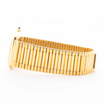 Das Zifferblatt ist ein minimalistischer Traum: ein makelloses goldenes Sonnenschliff-Finish mit einer klaren äußeren Minutenanzeige, gepaart mit schlanken Zeigern und einer Krone mit Saphir-Cabochon. Aber was dieses Modell wirklich auszeichnet, ist das integrierte Armband aus 18 Karat Gelbgold im "Bambus-Stil" - ein selten gesehenes und sehr begehrtes Detail, das die gesamte Uhr zu einer tragbaren Skulptur macht.