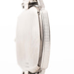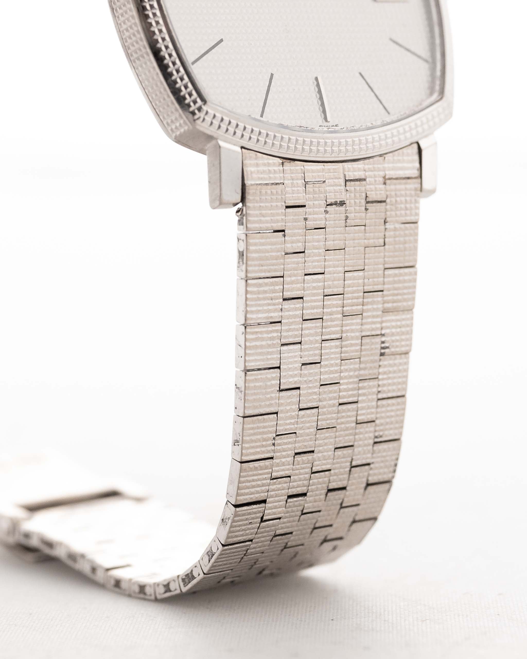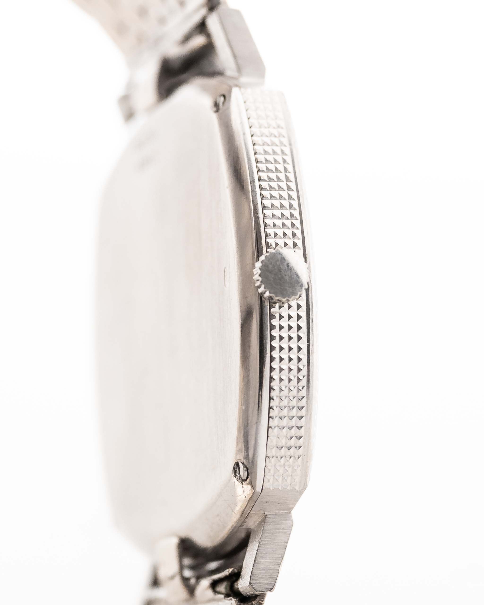 Unser Exemplar befindet sich in einem fantastischen Zustand. Das Armband aus 18 Karat Weißgold, das weißgoldene Cloud de Paris-Zifferblatt mit Stabindexen und blauen Stabzeigern ist in makellosem Zustand. Die Gesamterscheinung mit der quadratischen TV-Gehäuseform ist ein Kunstwerk.