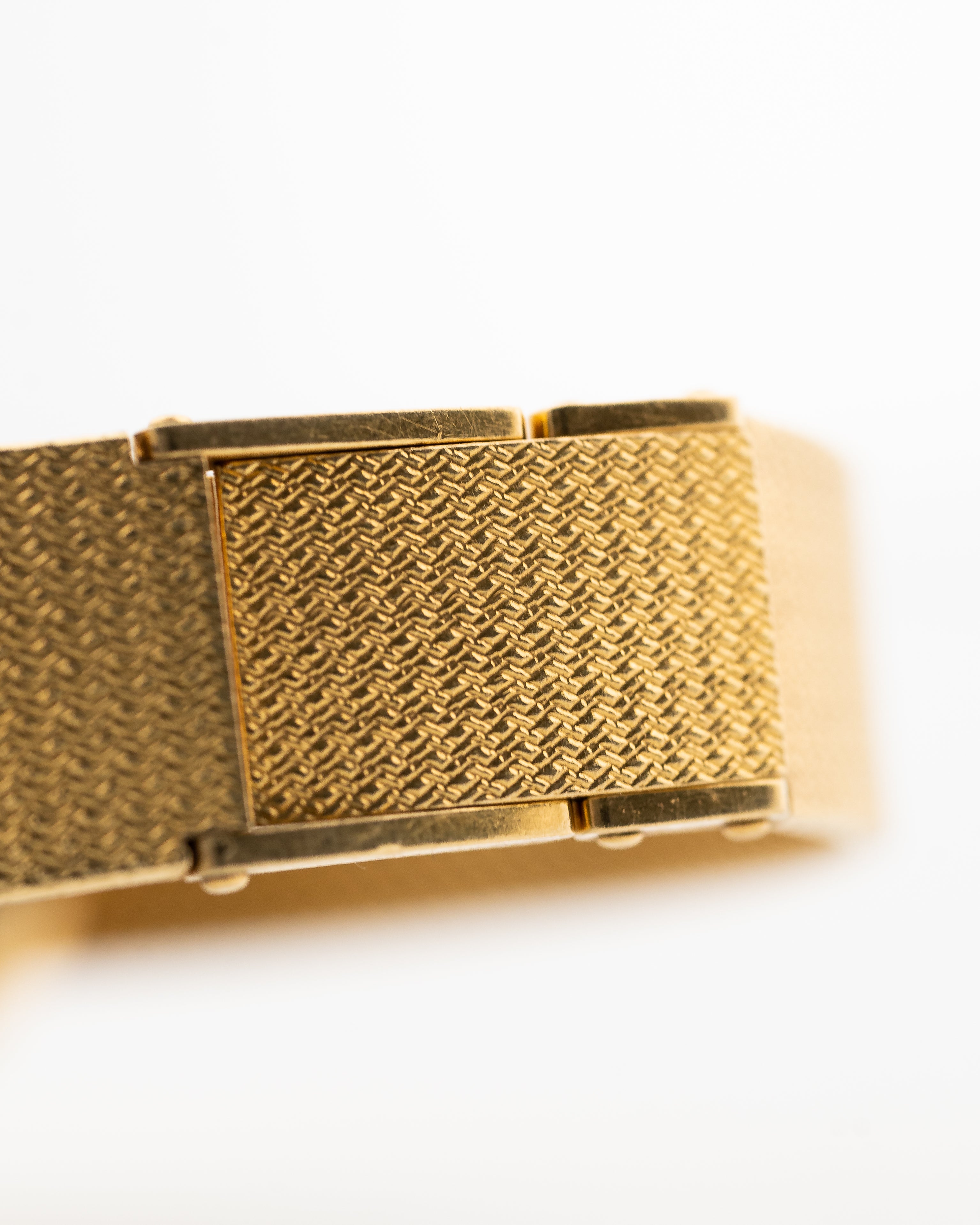 Das Zifferblatt ist aus Gelbgold, einer beliebten Farbe für Armbanduhren aus dieser Zeit (wie bei dem zeitgenössischen Modell Ellipse von Patek Philippe), und wird mit einem integrierten Armband aus 18 Karat Gelbgold im Neuzustand geliefert.
