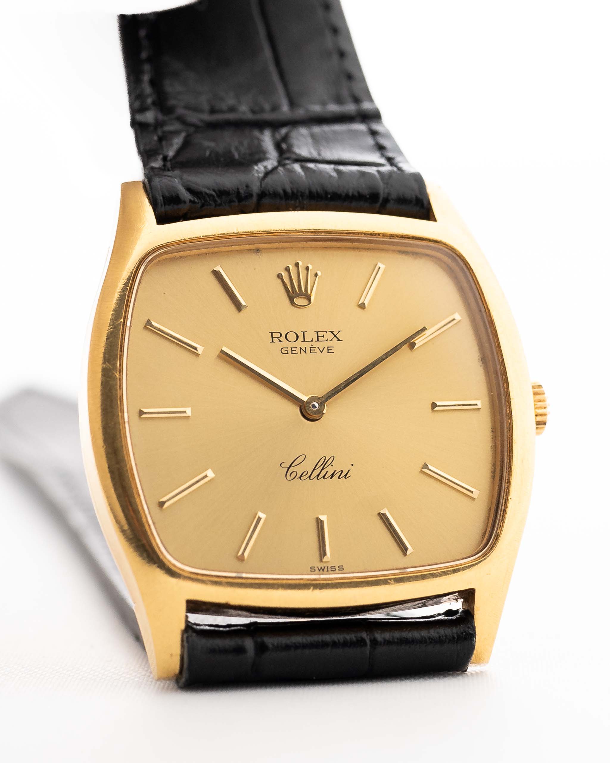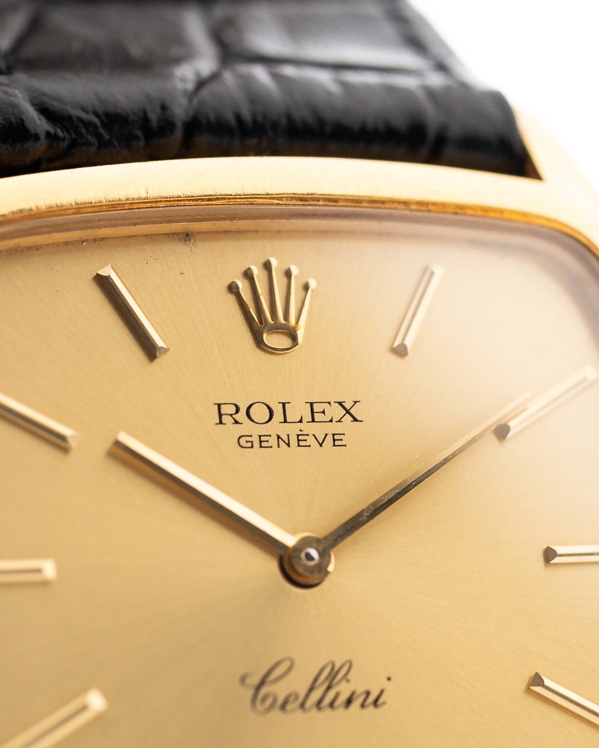 Das goldene Zifferblatt mit Sonnenschliff schimmert mit zurückhaltender Eleganz, ergänzt durch die originalen goldenen Zeiger und die Krone. Mit ihrem minimalistischen Layout und ihrem schlanken Profil geht diese Cellini nahtlos von legerer Raffinesse zu formeller Finesse über.