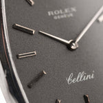 Vintage Rolex Cellini 3807 Tonneau 18k Weißgold dunkelgrau Zifferblatt Nahaufnahme mit Markierungen Zeiger und Krone Logo Cellini Signatur