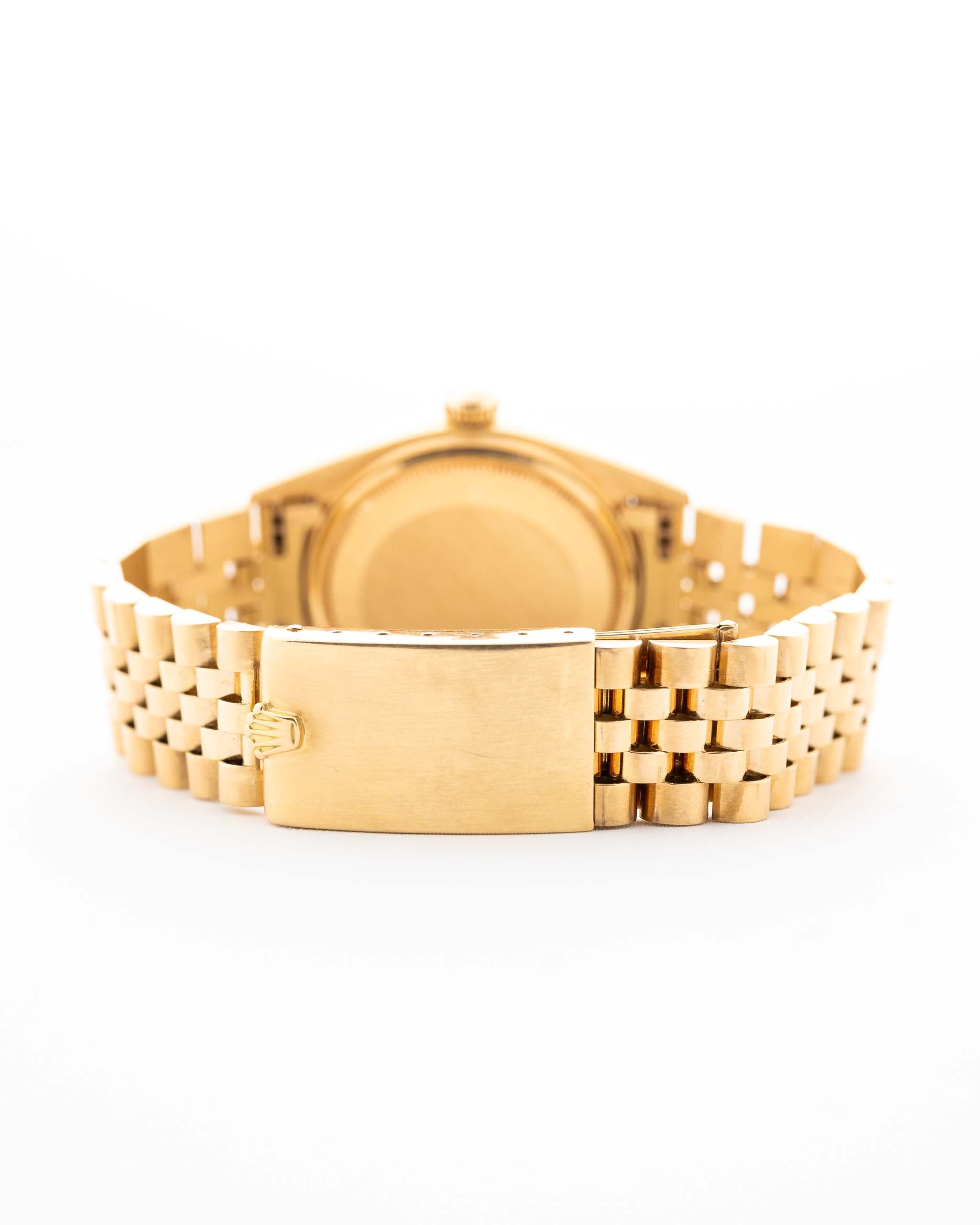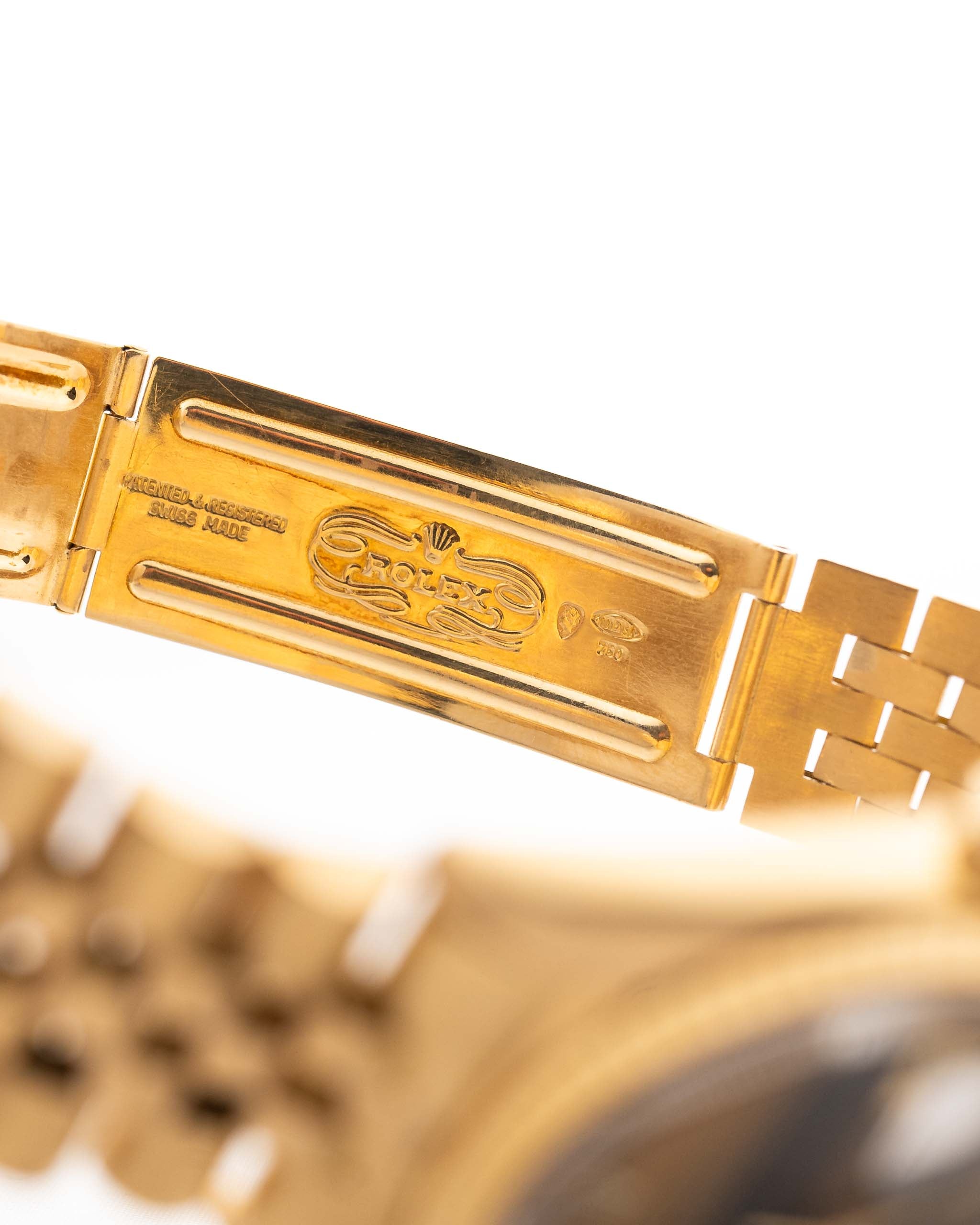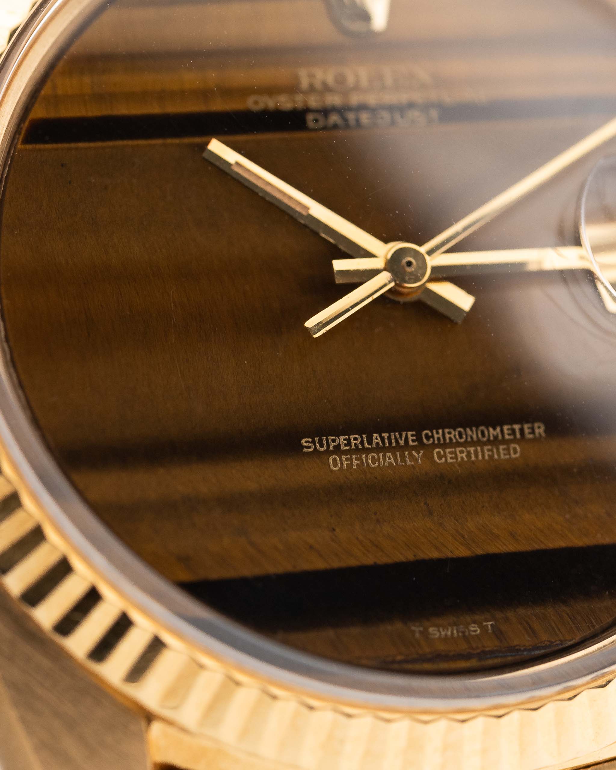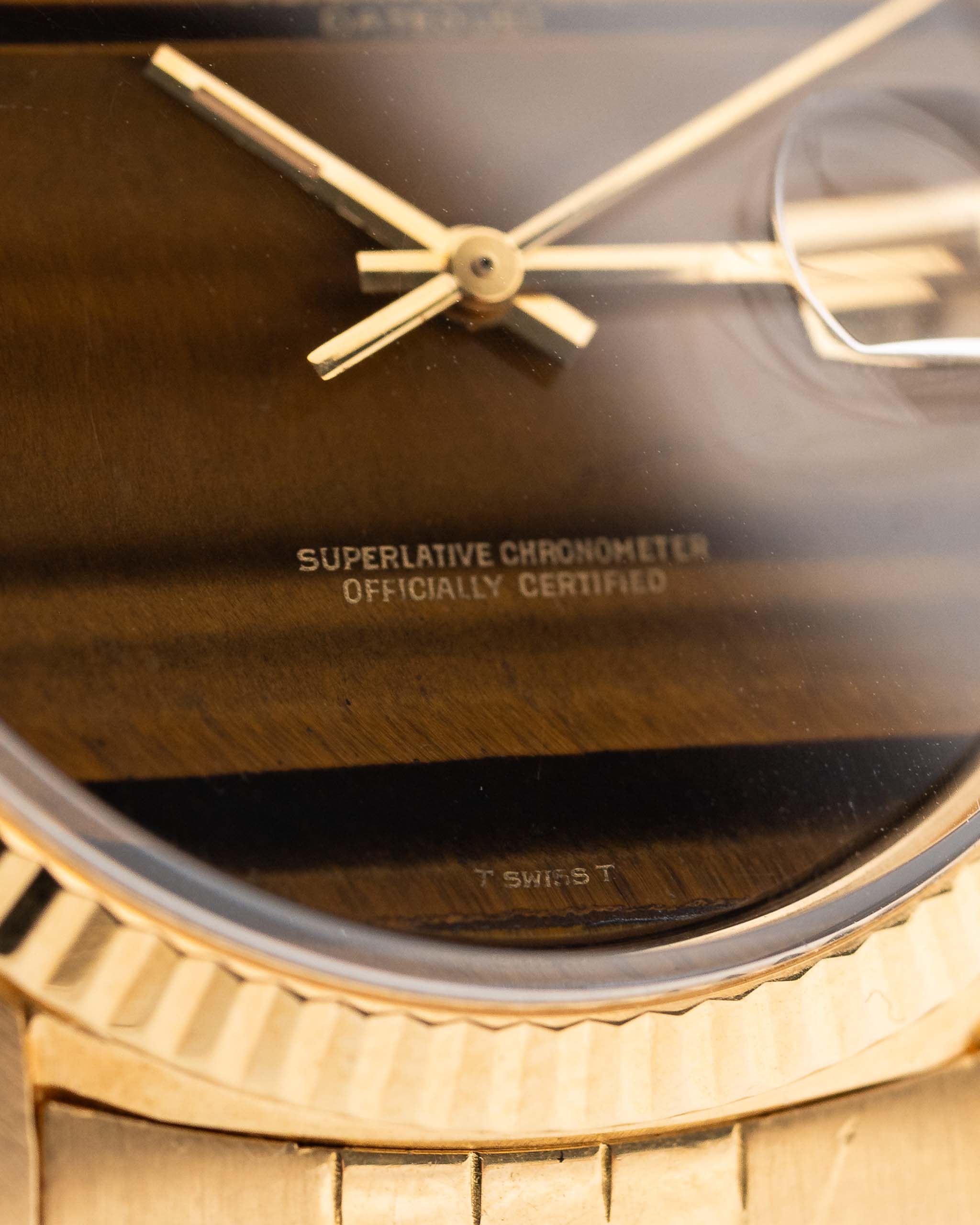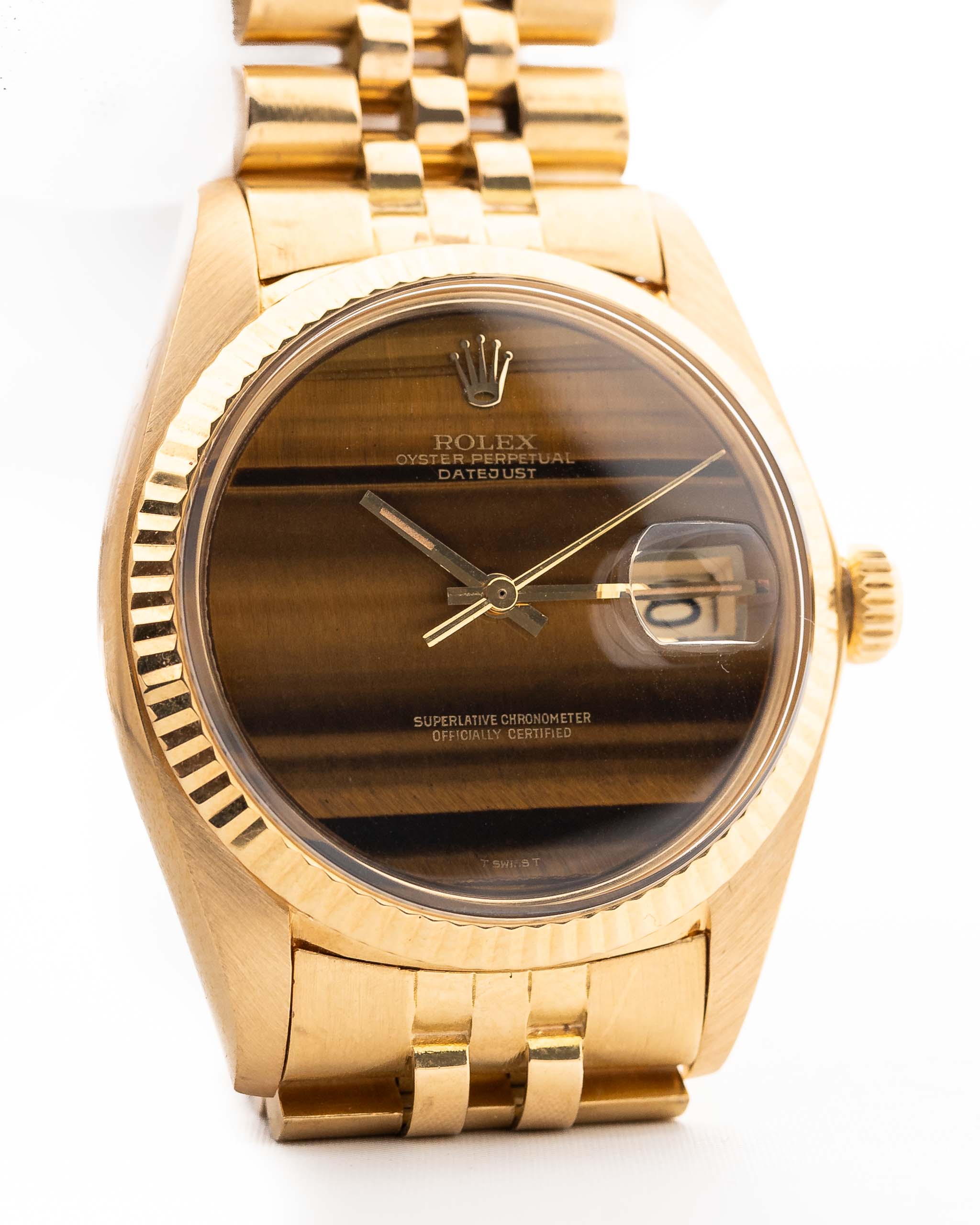 Entdecken Sie die unvergängliche Anziehungskraft der Rolex Datejust 1601, einer kultigen Vintage-Uhr aus massivem 18 Karat Gelbgold. Dieses klassische 36-mm-Modell besticht durch sein außergewöhnlich seltenes Tigerauge-Zifferblatt, das für seine warmen Brauntöne und einzigartigen natürlichen Muster geschätzt wird - jedes Zifferblatt ist ein echtes Unikat.