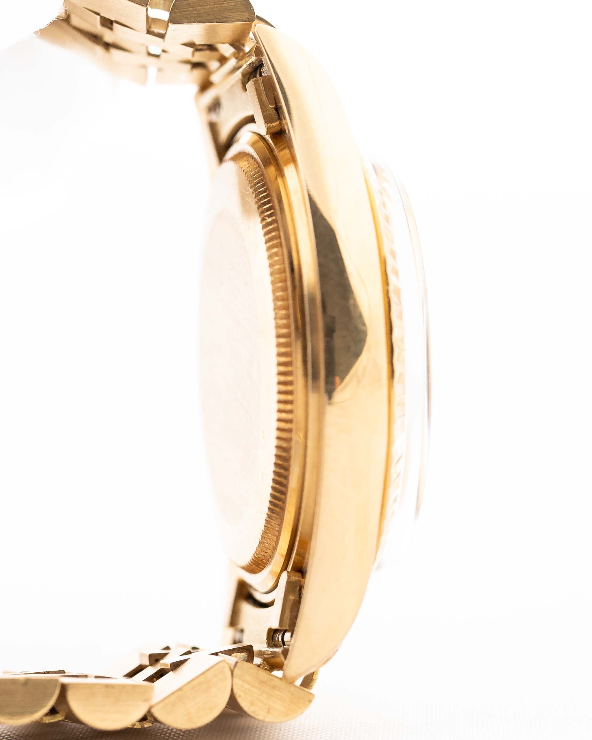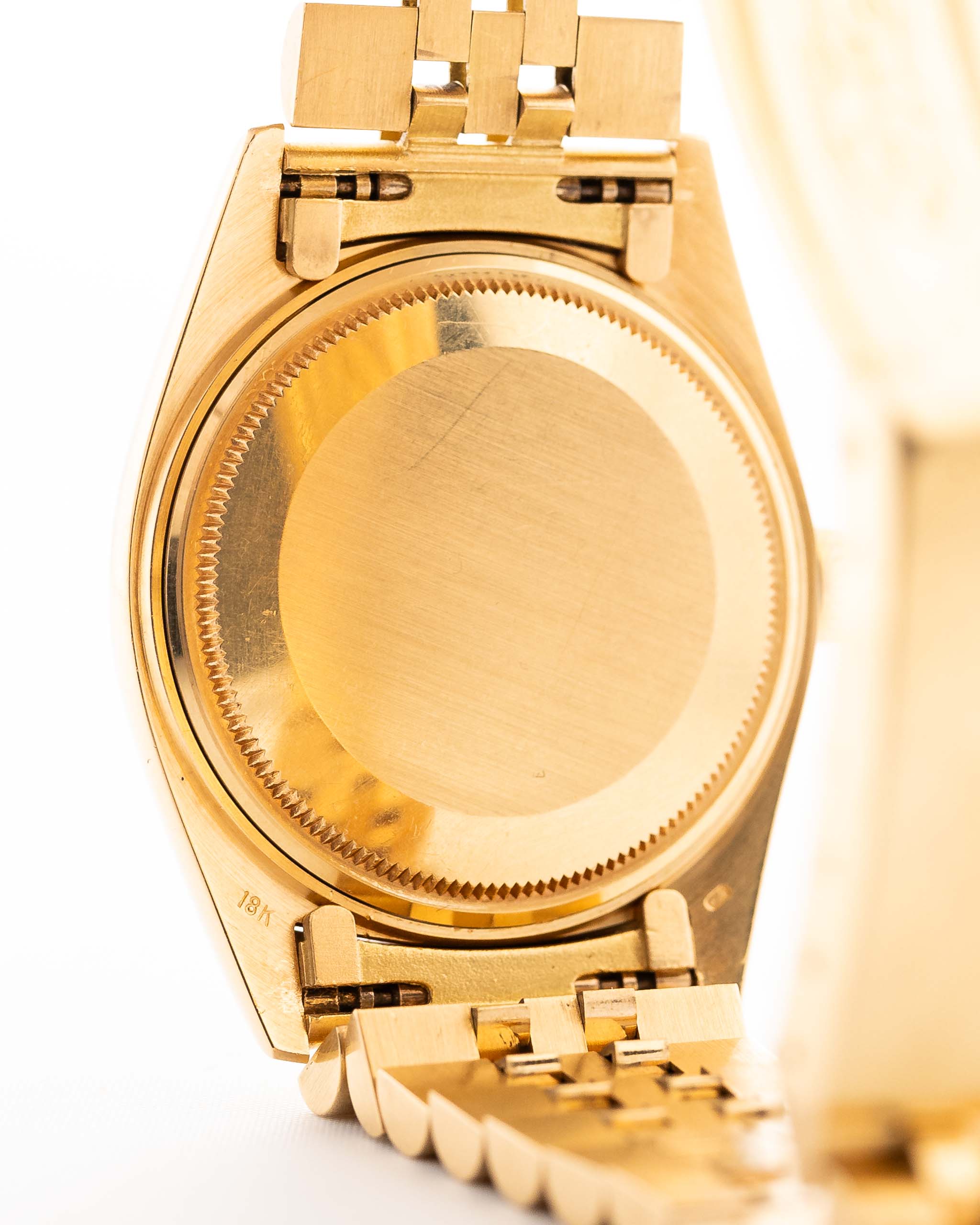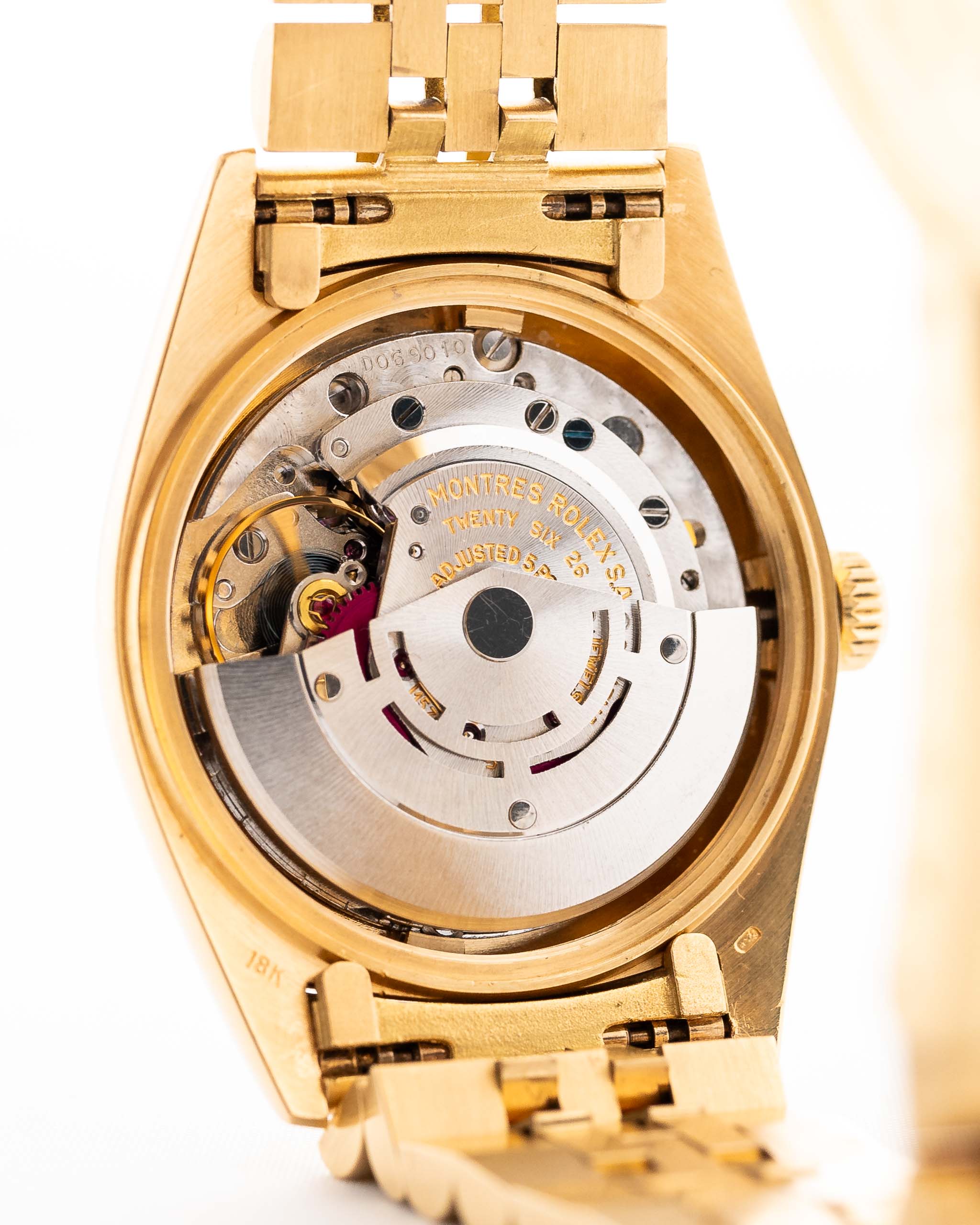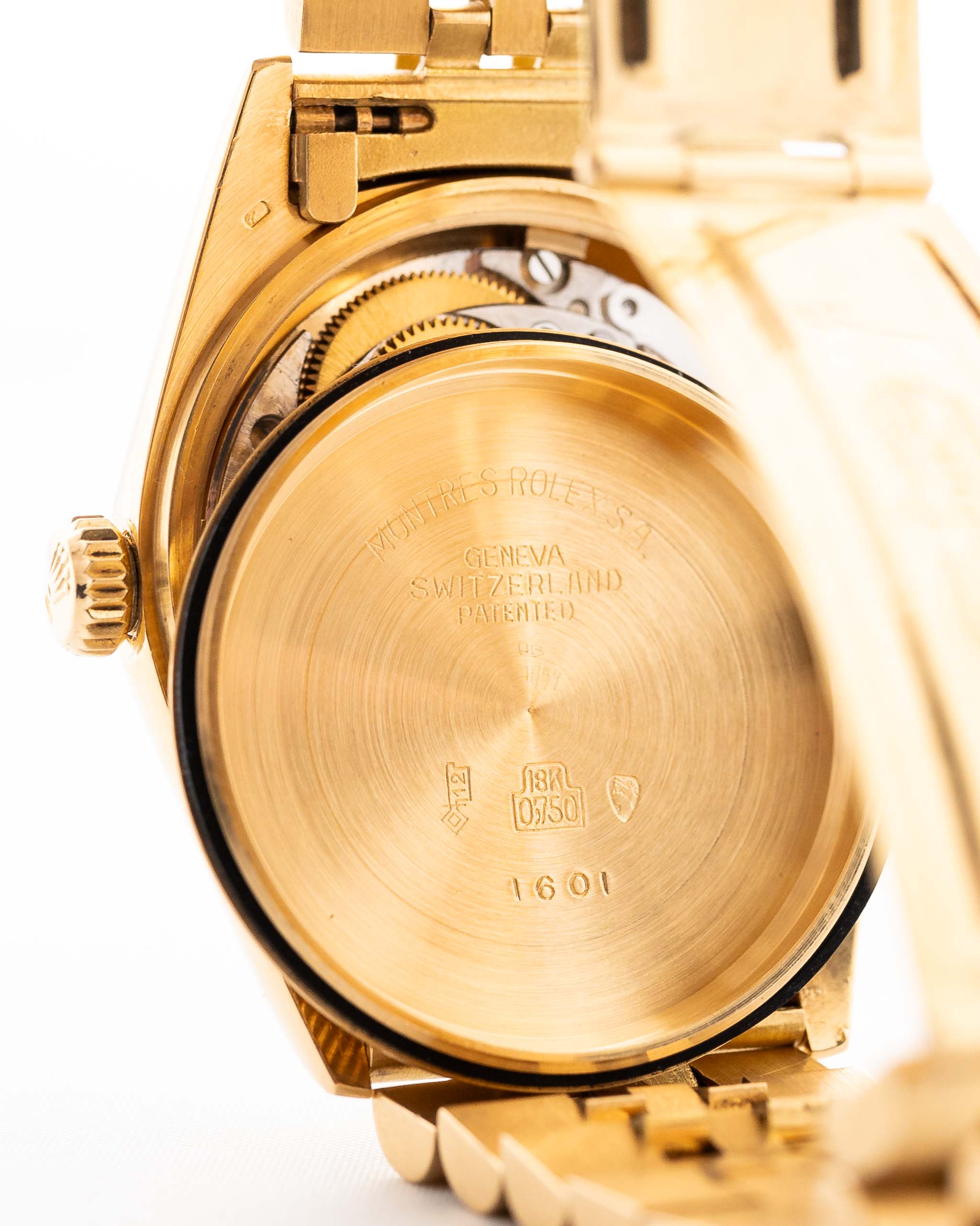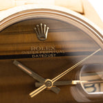 Entdecken Sie die unvergängliche Anziehungskraft der Rolex Datejust 1601, einer kultigen Vintage-Uhr aus massivem 18 Karat Gelbgold. Dieses klassische 36-mm-Modell besticht durch sein außergewöhnlich seltenes Tigerauge-Zifferblatt, das für seine warmen Brauntöne und einzigartigen natürlichen Muster geschätzt wird - jedes Zifferblatt ist ein echtes Unikat.