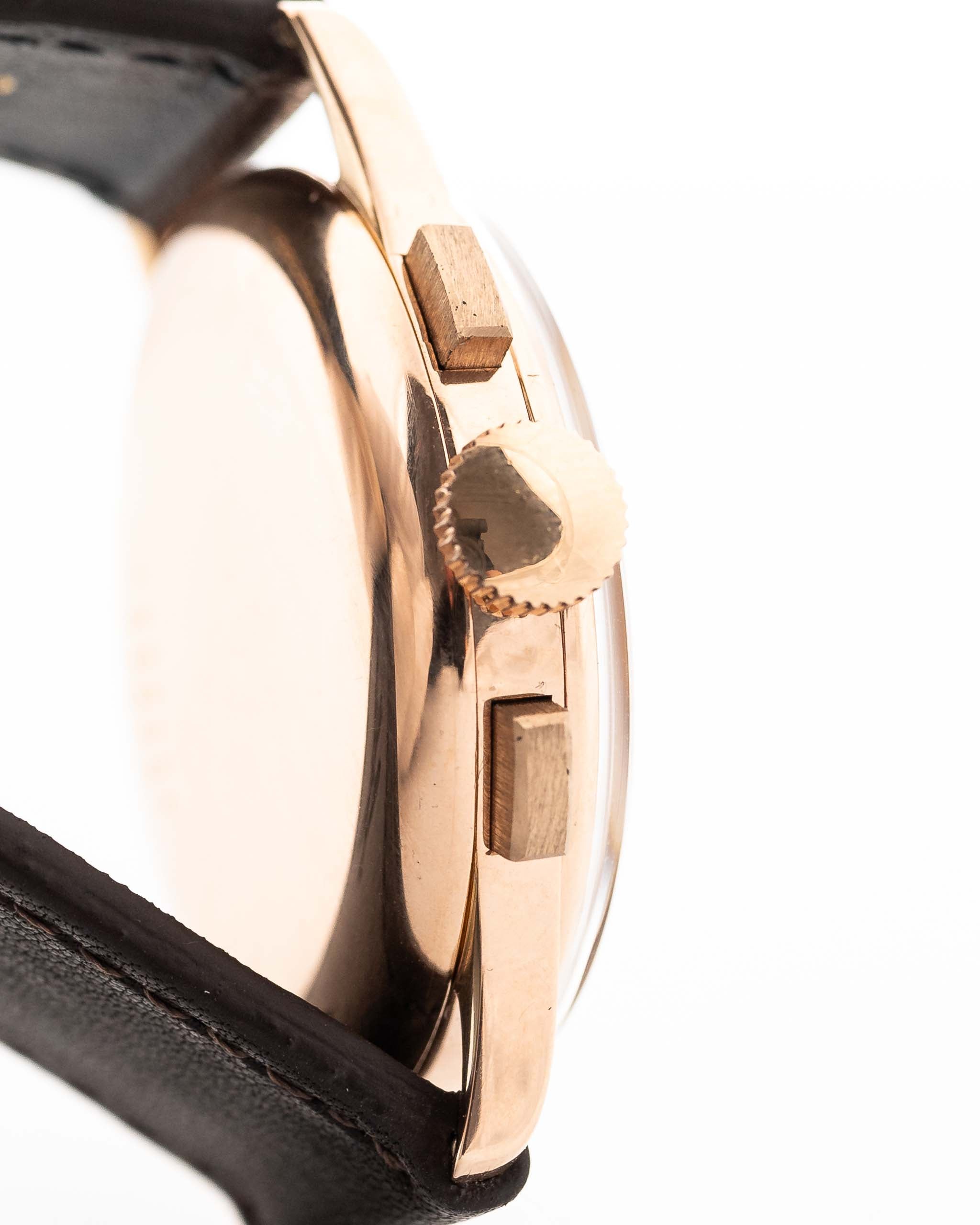Sie ist einer der elegantesten Vintage-Chronographen, und dieses Prachtexemplar in unglaublichem Zustand ist nicht anders. Sie ist ausgewogen, dezent und funktionell in einem 34,5 mm Roségoldgehäuse.