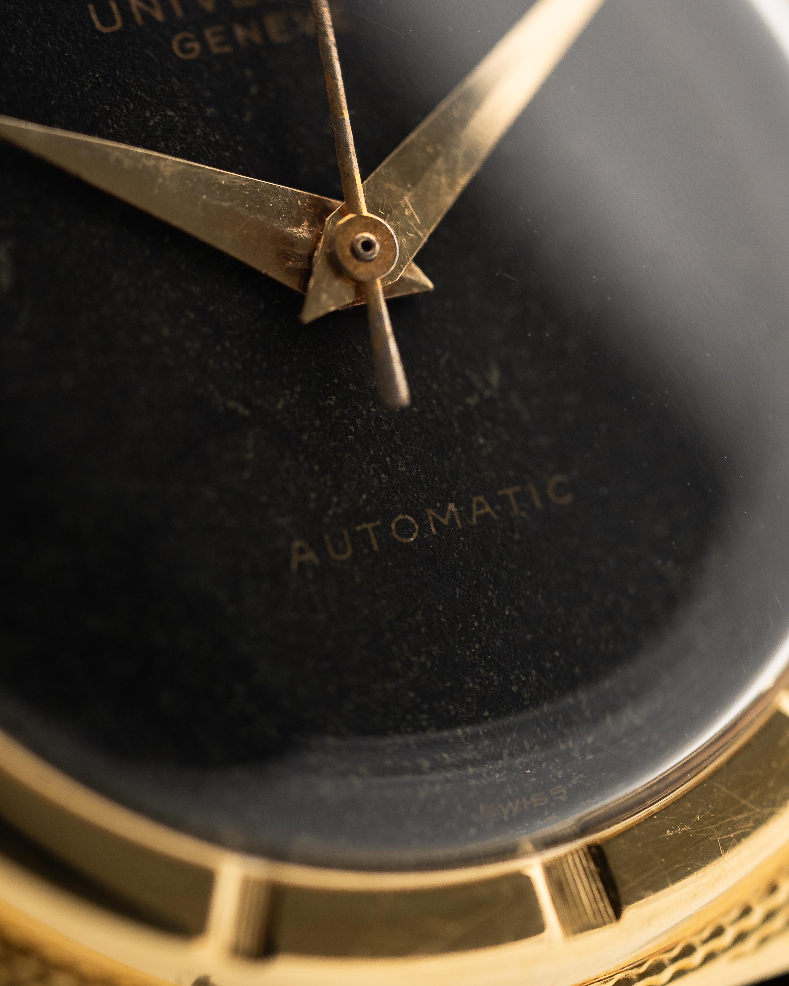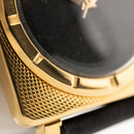 Diese Universal Genéve Square aus 18k Gelbgold ist etwas ganz Besonderes, das Sie nicht oft an anderen Handgelenken sehen werden. Sie wurde nur über einen Zeitraum von 7 Jahren Mitte der 1950er Jahre hergestellt. Sie weist einige Elemente der Polerouter auf, wie zum Beispiel die Lünette, die nicht wie üblich auf dem Zifferblatt triumphiert, sondern auf dem quadratischen Gehäuse aus 18k Gelbgold mit seiner filigranen Hobnail-Verarbeitung. Dieses Designdetail verströmt eine andere Art von Magie und schafft eine überraschende Präsenz am Handgelenk.