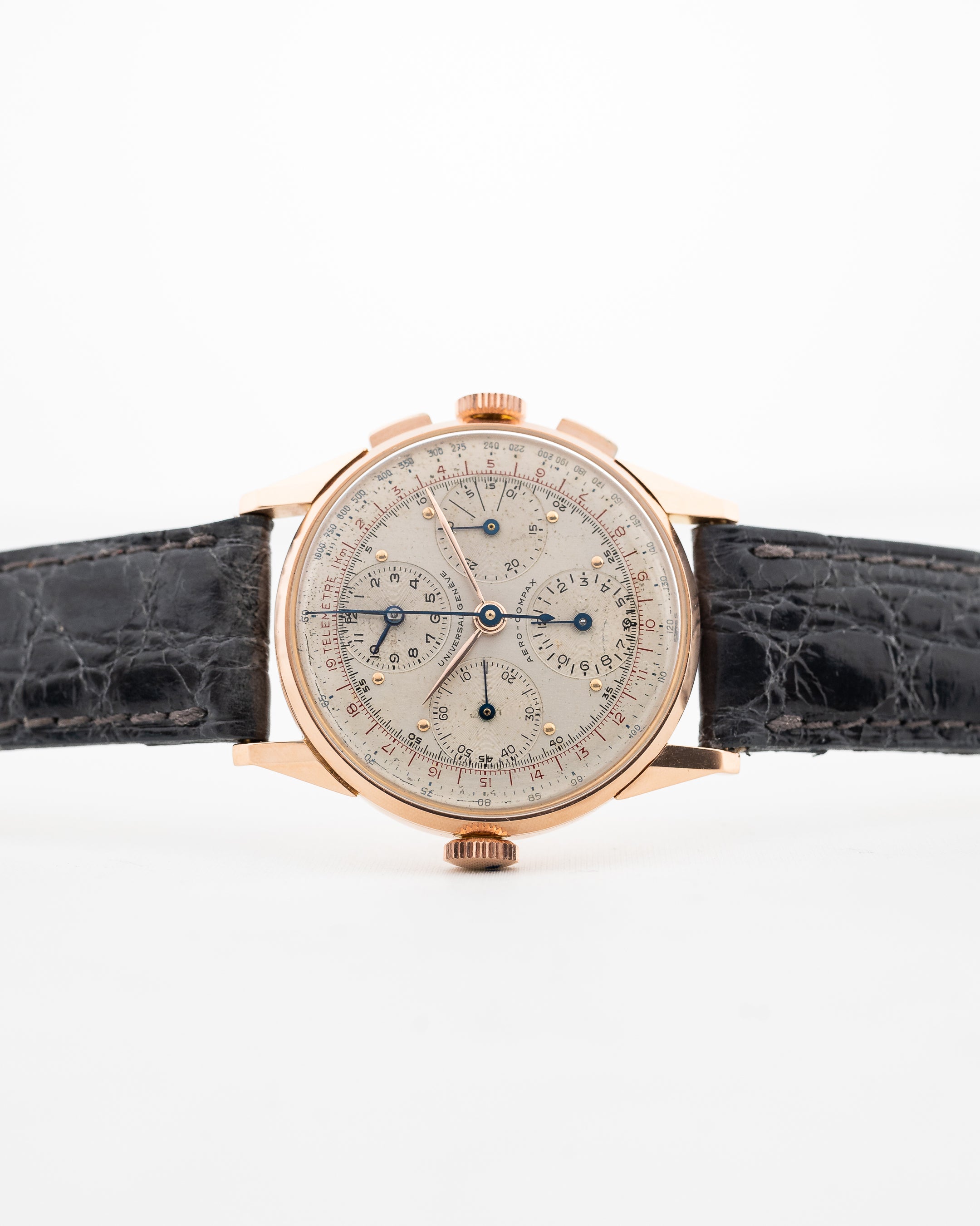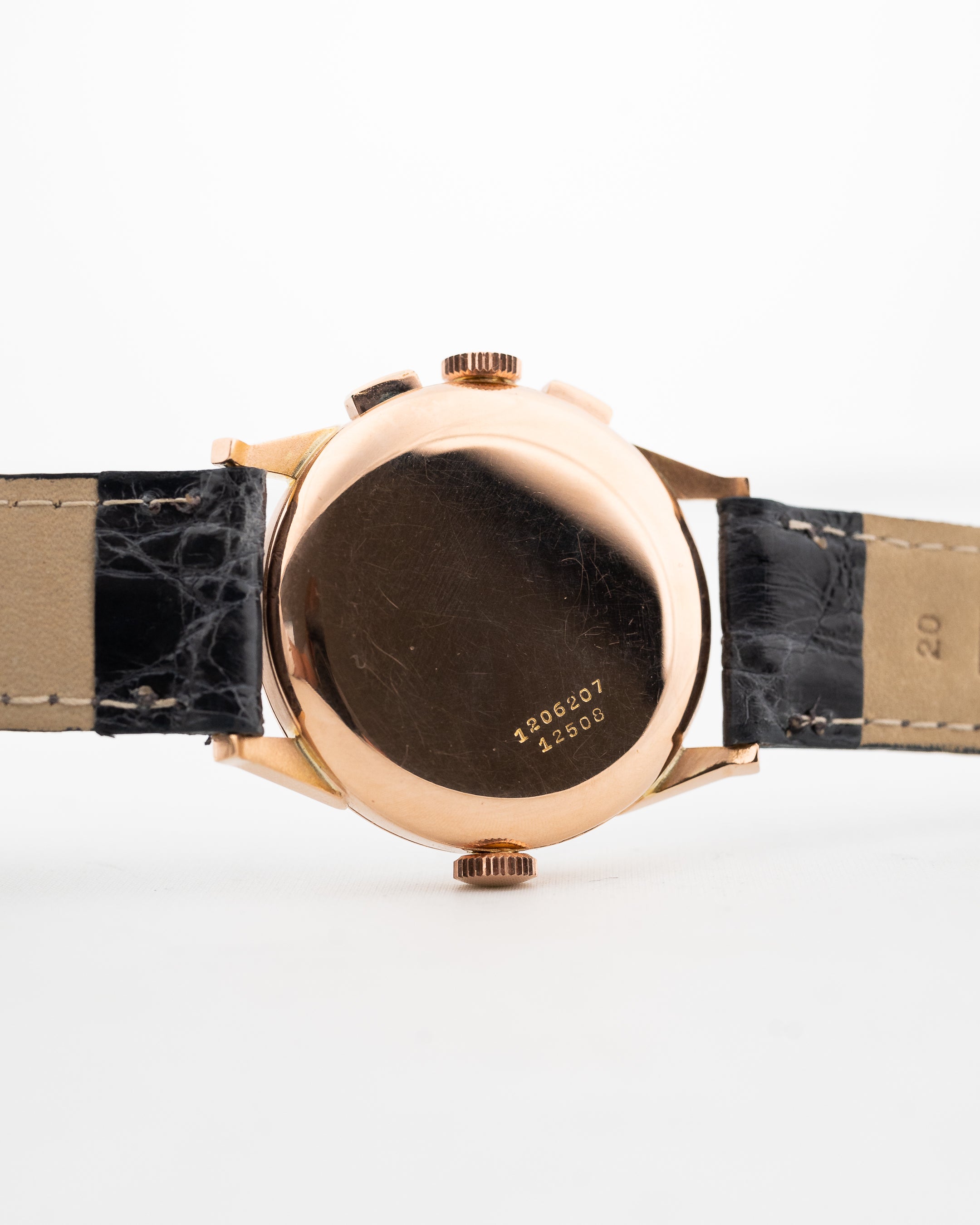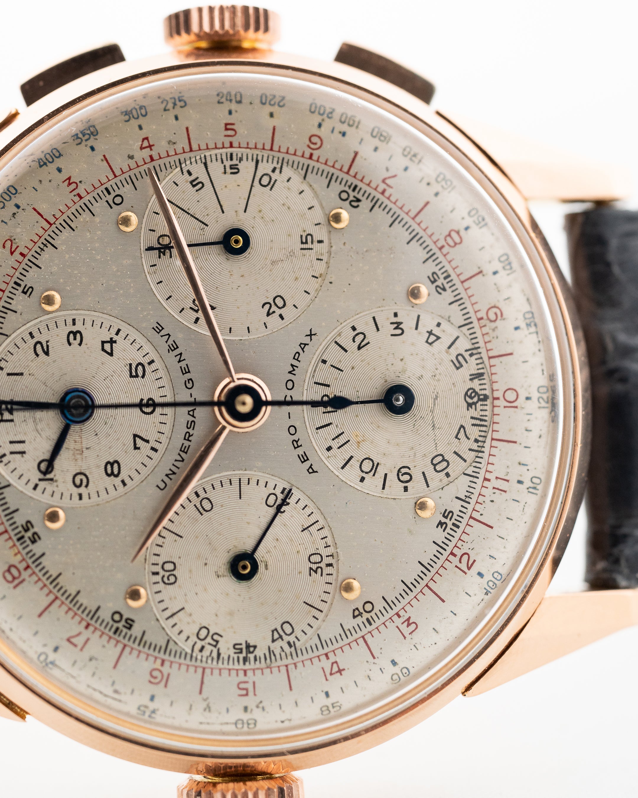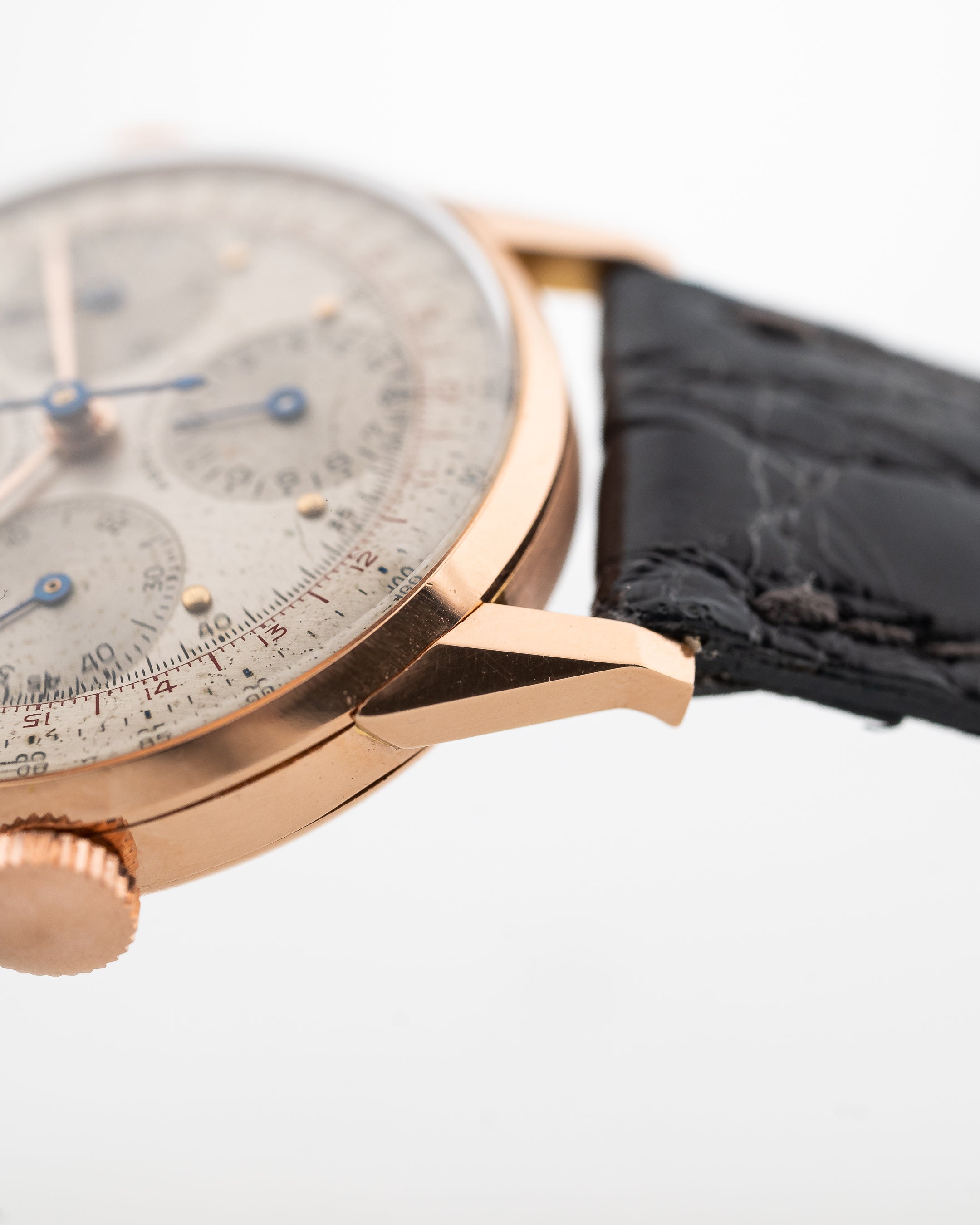 Es sind über 20 Referenzen für die Aero Compax bekannt, aber unser Exemplar aus Roségold ist eine der seltensten von allen. Sie besitzt ein riesiges 37,5 mm großes Gehäuse aus 18k Roségold und es ist fast unmöglich, sie in diesem Originalzustand zu finden.