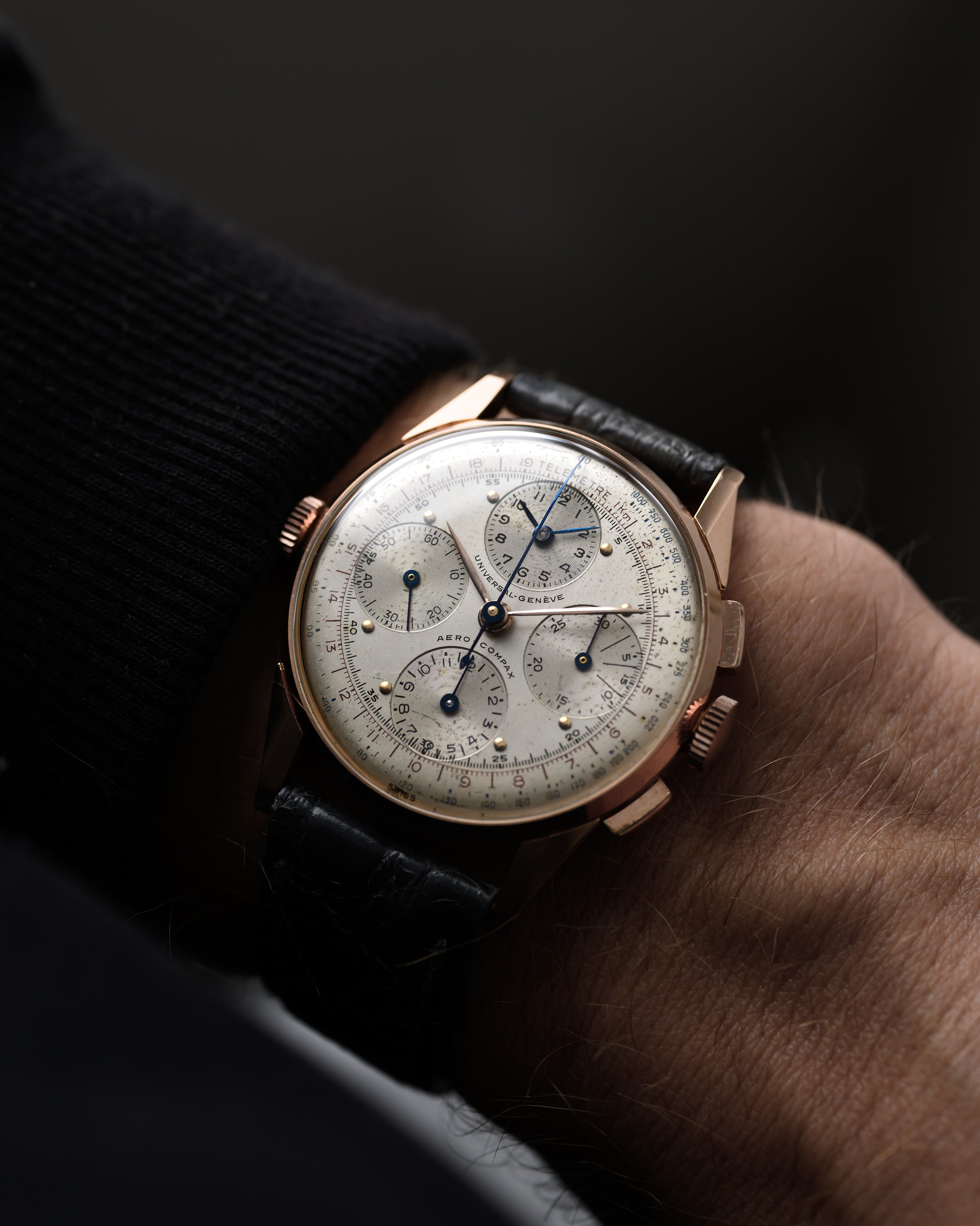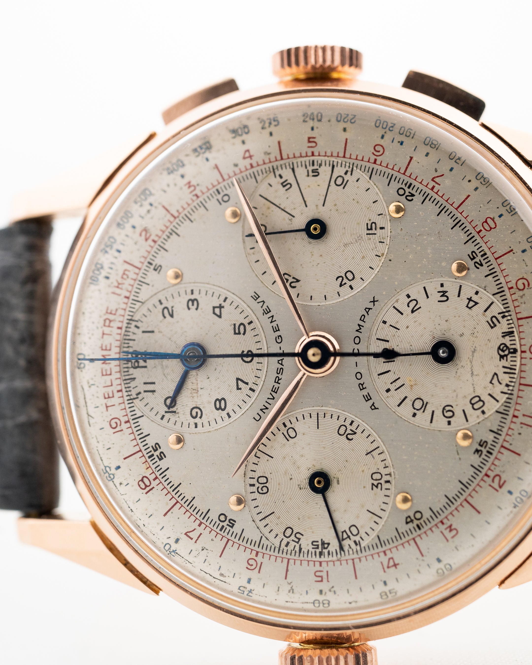 Die Universal Geneve Aero-Compax ist ganz einfach eine der begehrtesten und sammelwürdigsten Uhren auf dem heutigen Vintage-Markt. Unsere Version mit der Referenz 12508 aus dem Jahr 1945 ist nicht nur ein großartiges Beispiel für dieses Modell - sie ist auch ein großartiger Beweis dafür, warum die Aero-Compax so begehrt ist.