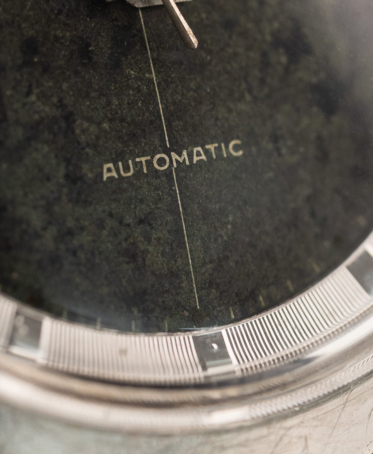 • der Stundenzeiger hat eine dickere Leuchtmasse als der Minutenzeiger (in der Regel die gleiche Dicke). Ein Zeiger könnte in der Vergangenheit ersetzt worden sein, aber sie haben genau die gleiche Leuchtmassefarbe und den gleichen Alterungsprozess des Stahls
