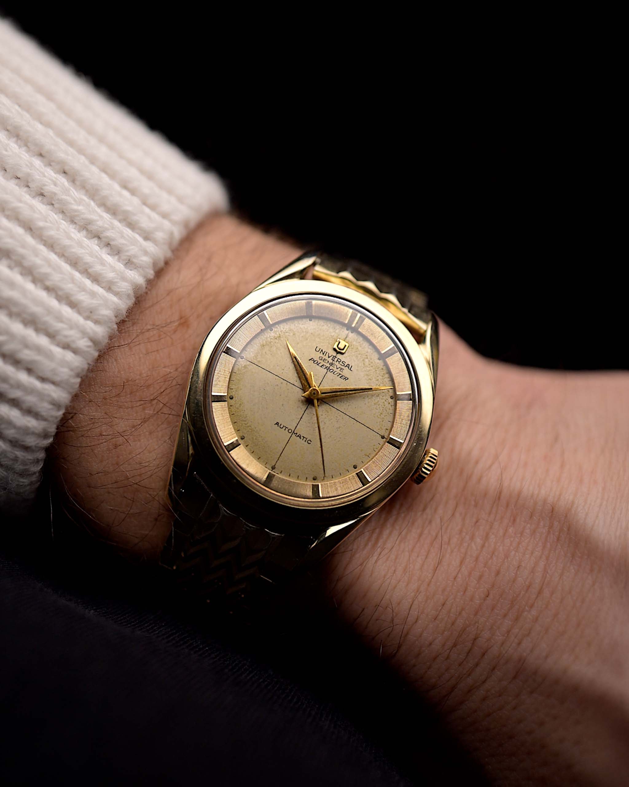 Universal Genève Polerouter 20214 Herringbone 1950s - vergoldetes Edelstahlgehäuse - goldfarbenes Zifferblatt - goldenes Armband Nahaufnahme