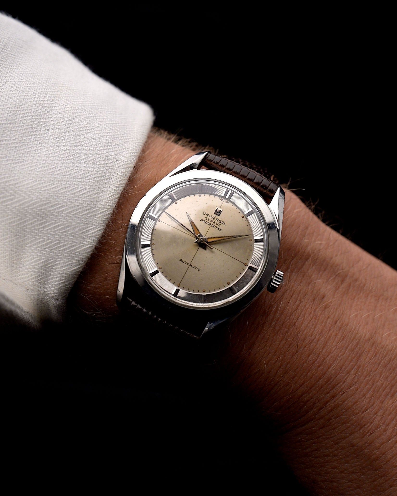 Der Polerouter wurde 1954 von Universal Genève in Zusammenarbeit mit Scandinavian Airline System (SAS) von dem damals 24-jährigen Gerald Genta hergestellt. Universal Genève entwickelte den automatischen Polerouter, um gegen die starken Magnetfelder an den Nord- und Südpolen resistenter zu sein.