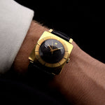 Diese Universal Genéve Square aus 18k Gelbgold ist etwas ganz Besonderes, das Sie nicht oft an anderen Handgelenken sehen werden. Sie wurde nur über einen Zeitraum von 7 Jahren Mitte der 1950er Jahre hergestellt. Sie weist einige Elemente der Polerouter auf, wie die Lünette, die nicht wie üblich auf dem Zifferblatt, sondern auf dem quadratischen Gehäuse aus 18k Gelbgold triumphiert. Dieses Designdetail verströmt eine andere Art von Magie und schafft eine überraschende Präsenz am Handgelenk.