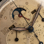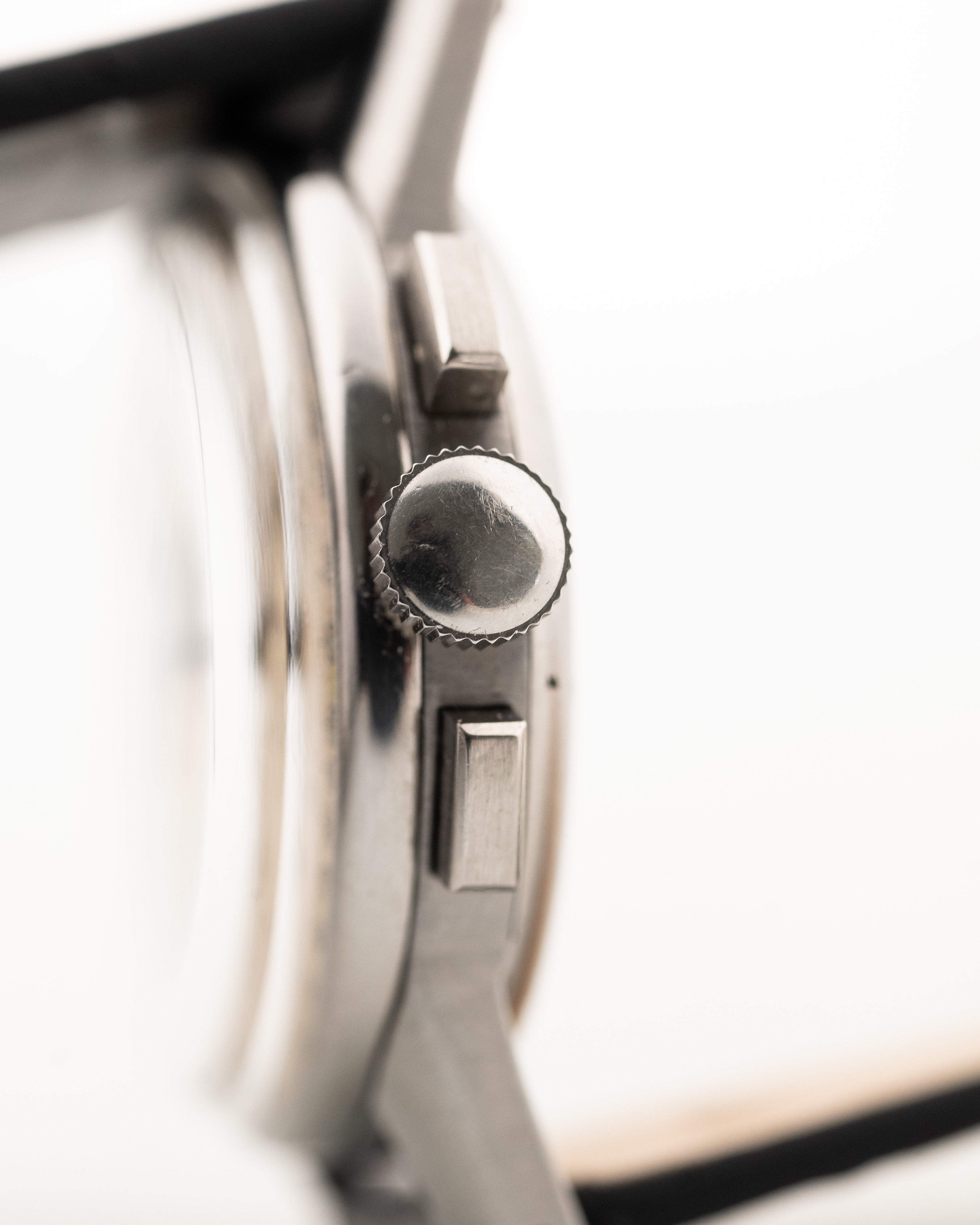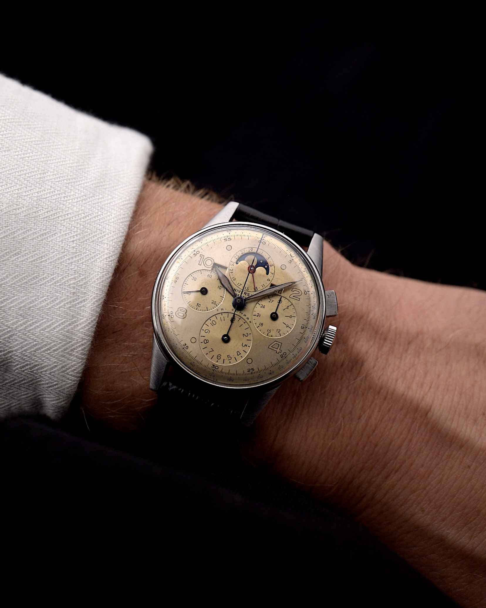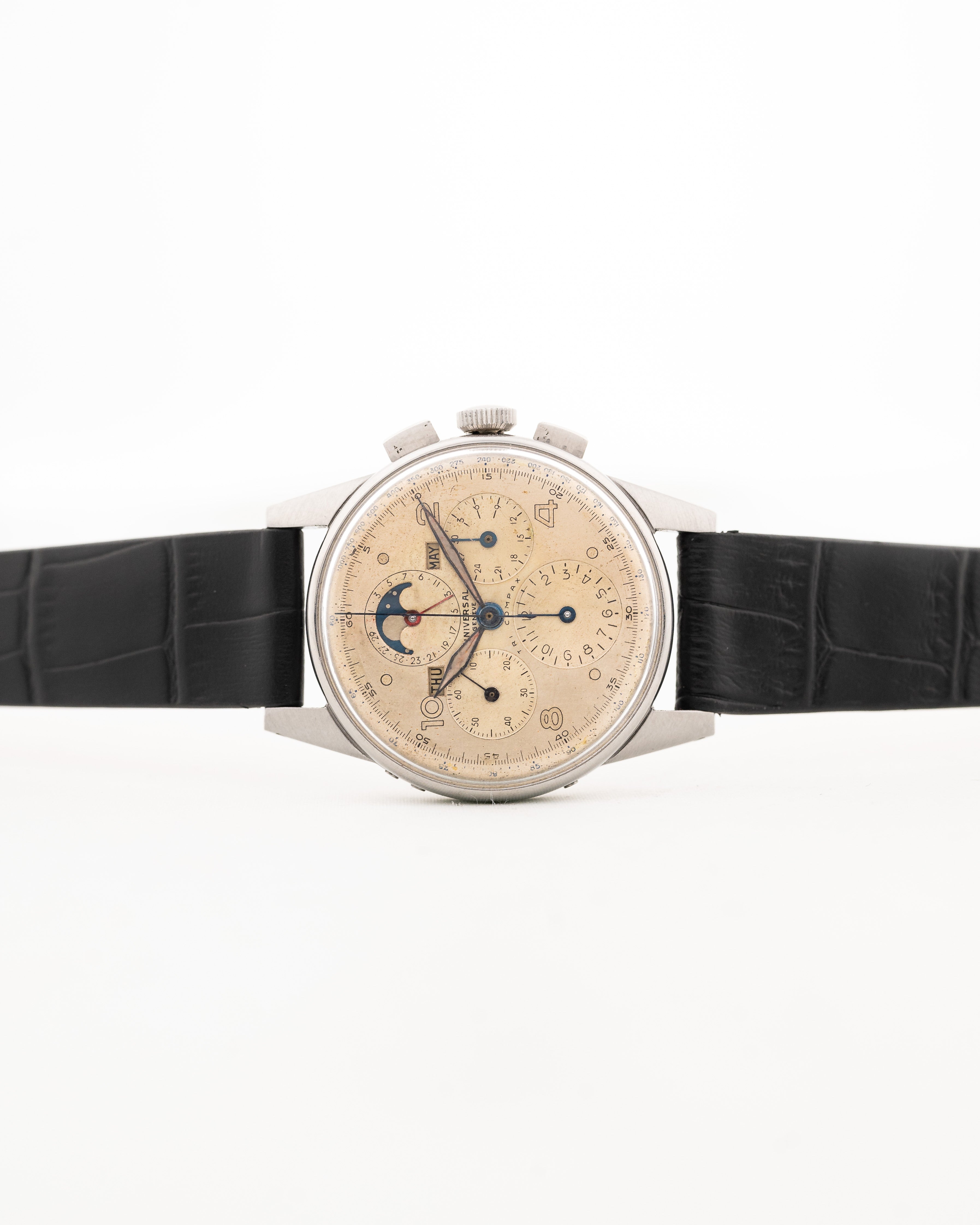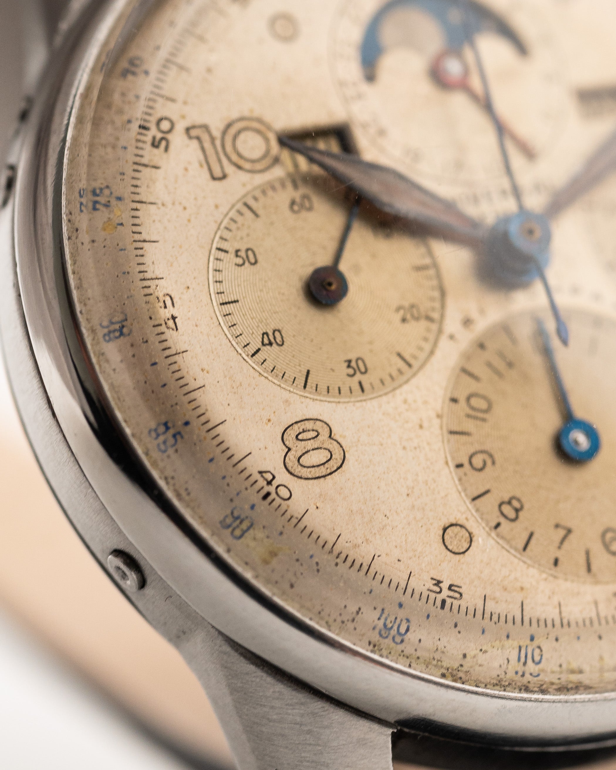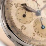 Unsere Version mit der Referenz 22258 aus den 1950er Jahren ist nicht nur ein großartiges Beispiel für dieses Modell - sie ist auch ein großartiger Beweis dafür, warum die Tri Compax so begehrt ist. Sie verfügt über ein wunderschönes Edelstahlgehäuse mit abgewinkelten Bandanstößen und ein Zifferblatt, das zum Sterben schön ist.