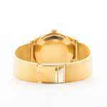 Eine Nahaufnahme einer Vintage Vacheron Constantin Gold Spillman Jumbo aus den 1950er Jahren an einem Handgelenk. In Gelbgold, 36,5 mm, Hammer-Automatikwerk mit originalem makellosem zweifarbigem Zifferblatt und originalem Goldarmband.