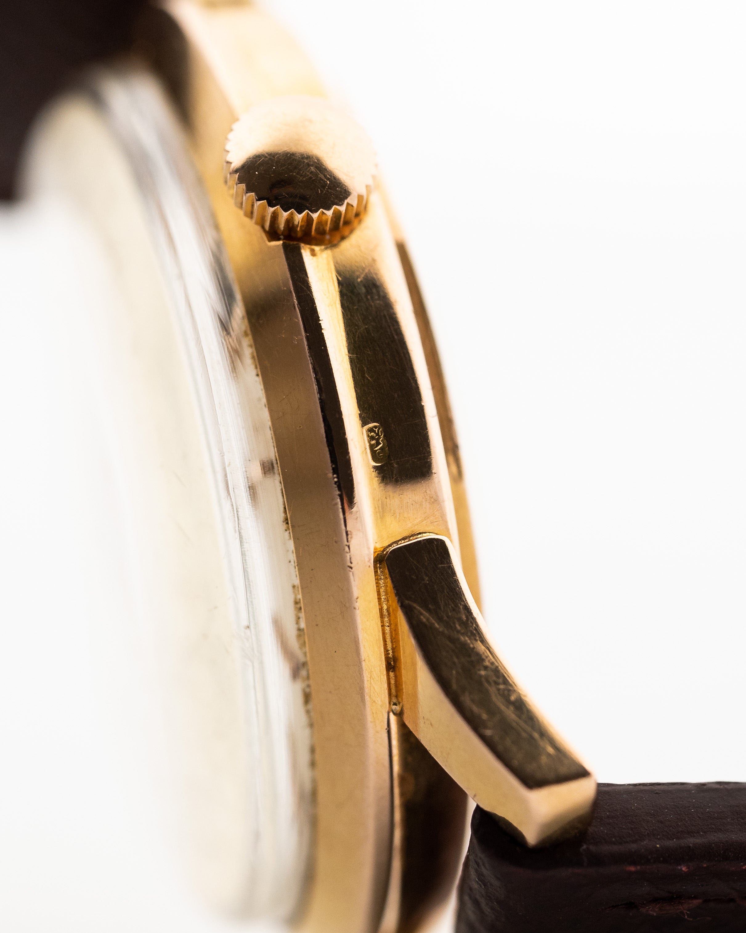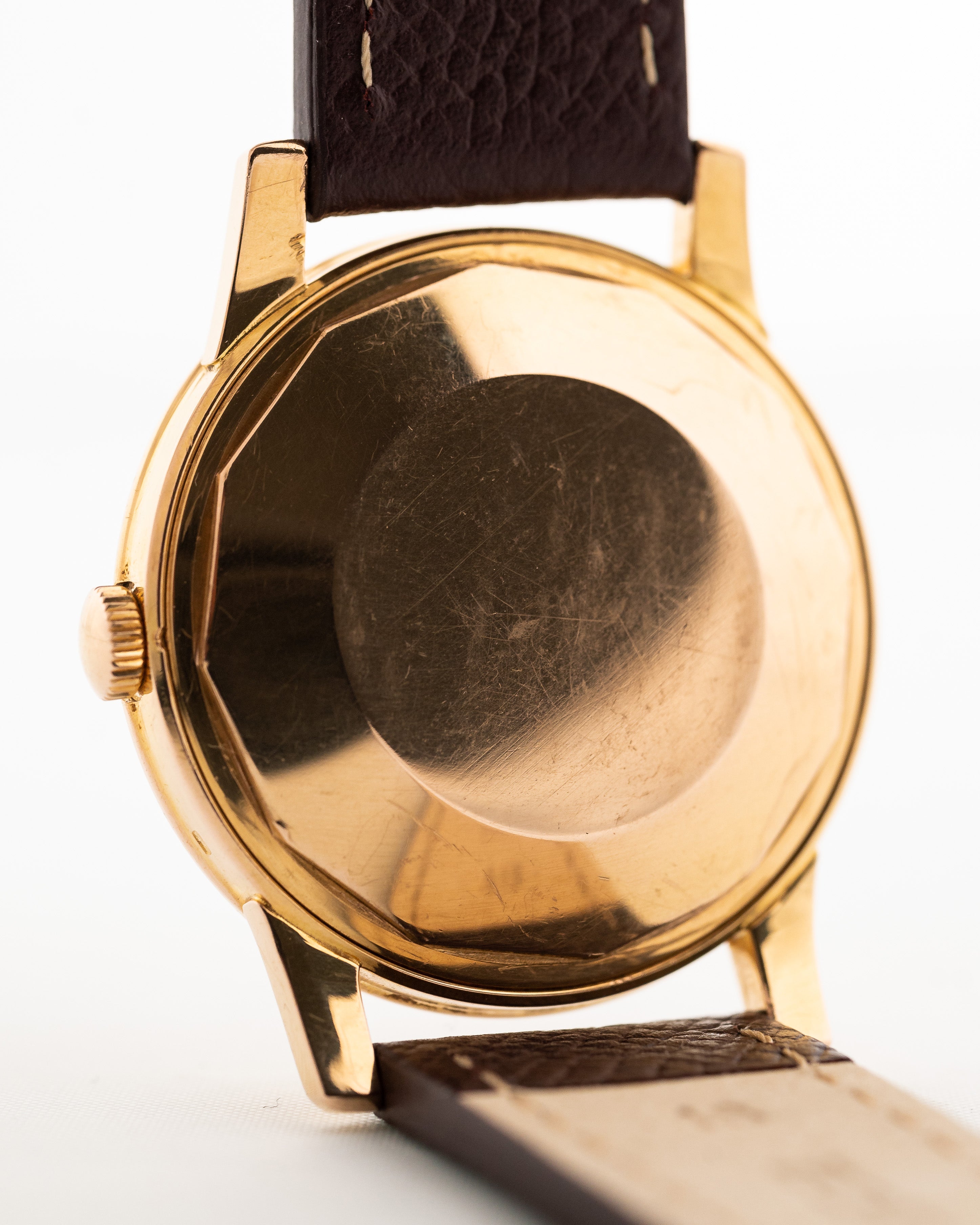 Das Gehäuse ist in einem sehr guten, unpolierten Zustand und der Schraubboden hat eine abgerundete Form, die an einen Blasenboden erinnert, darunter ein unglaublich gut verarbeitetes Vacheron Kal. K1072.