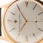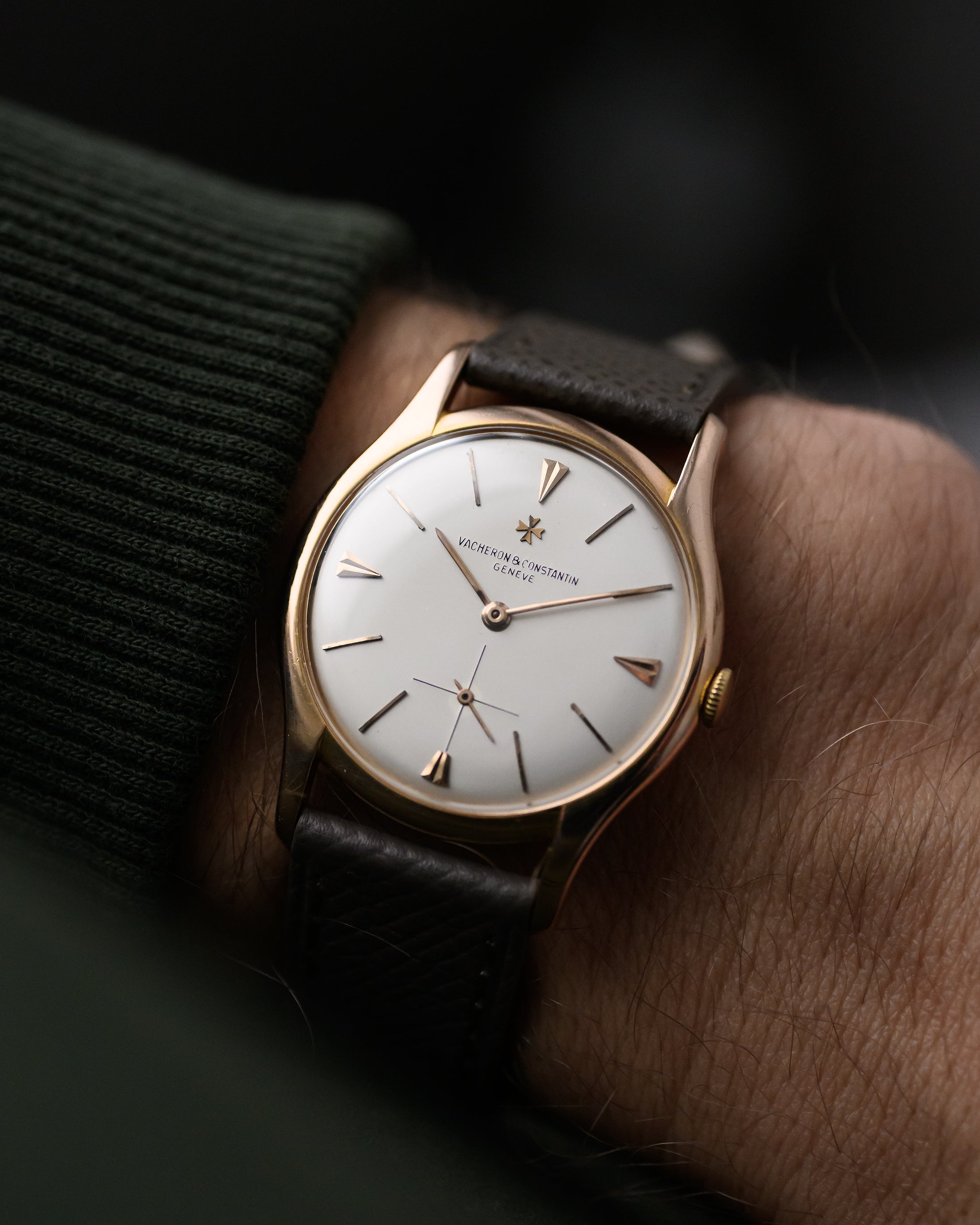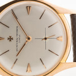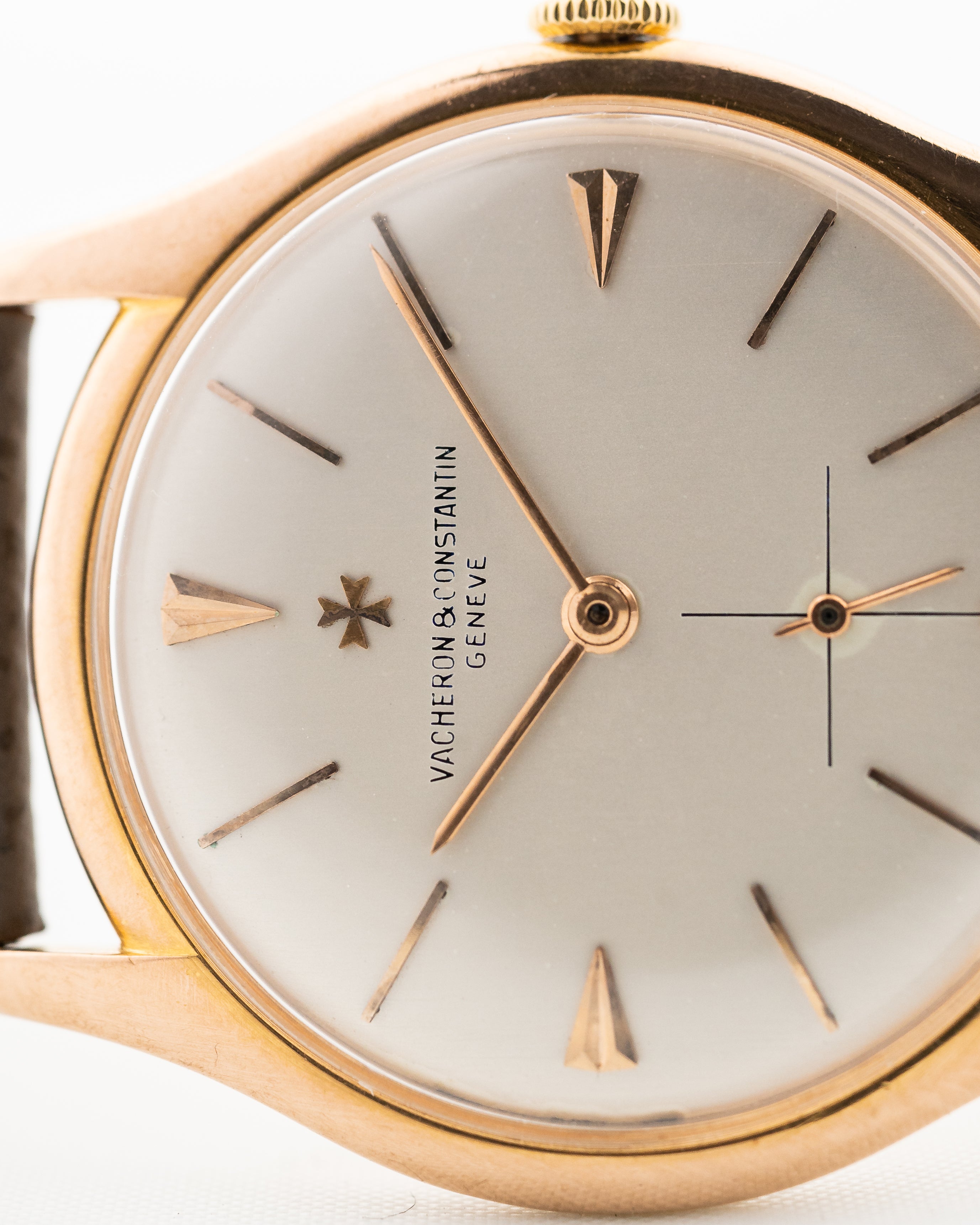 Hier haben wir eine wunderschön gearbeitete Vacheron Constantin-Kleideruhr aus den 1950er Jahren mit einem erstaunlich gestalteten Zifferblatt, einer kleinen Sekunde und filigranen Stundenmarkierungen und Zeigern aus Roségold.