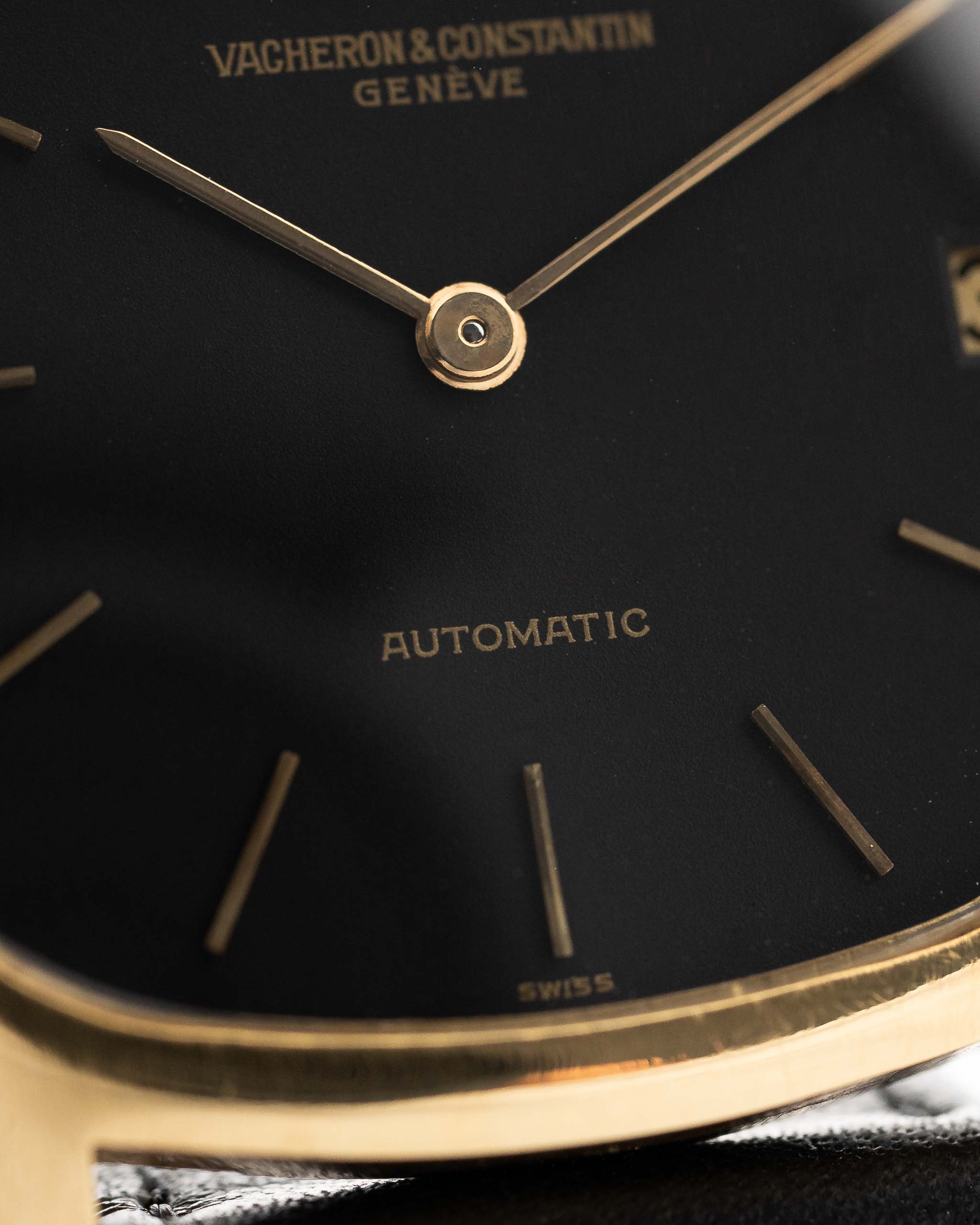 Diese Vacheron Constantin Ref. 2020 aus den 1950er Jahren fängt den Charme des Designs der Jahrhundertmitte mit einer kühnen Wendung ein: ein elegantes tonneauförmiges Gehäuse aus massivem 18k Gelbgold gepaart mit einem tiefmattschwarzen Zifferblatt - eine selten gesehene Kombination, die mühelos auffällt.
