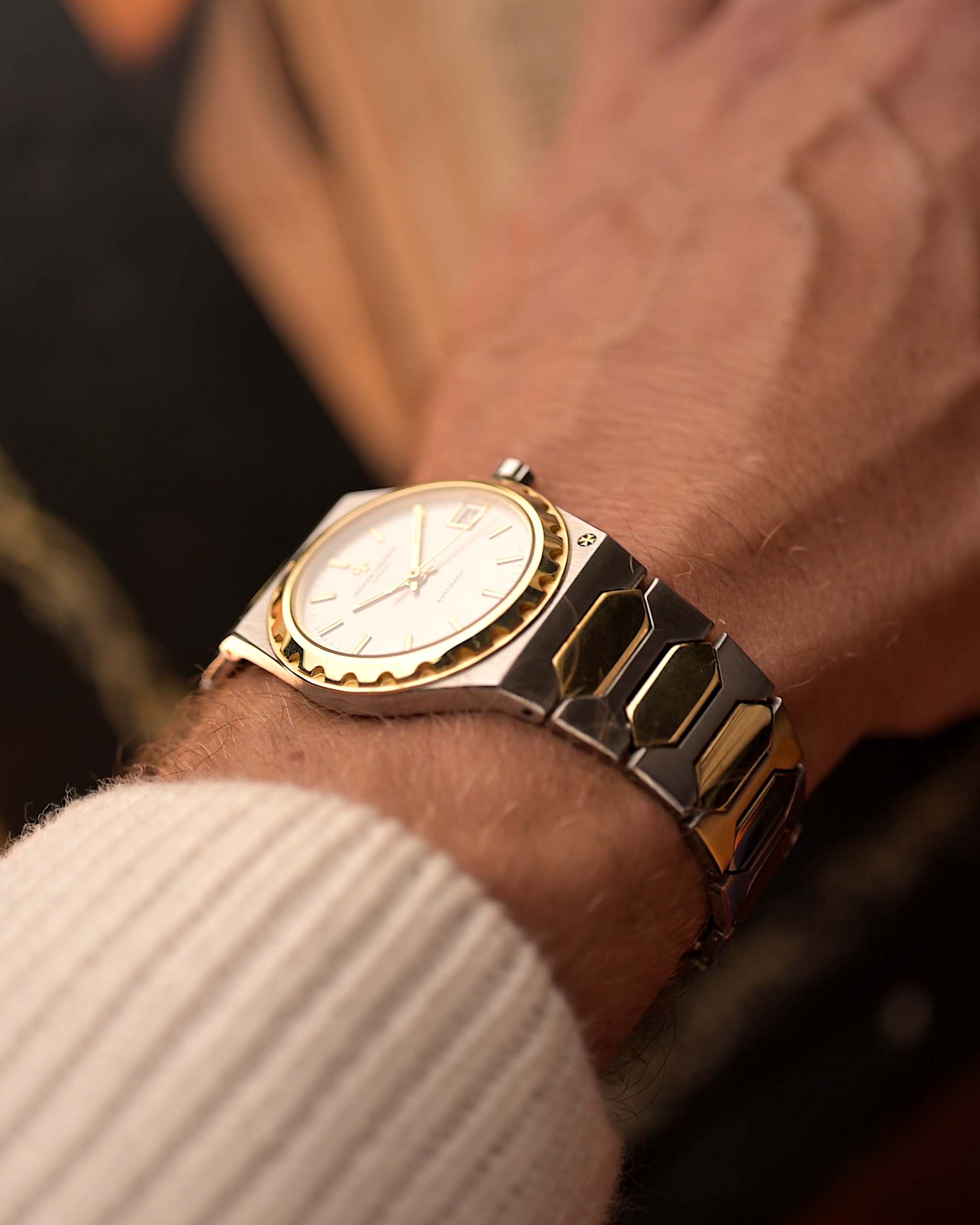 Vacheron Constantin 222 Two Tone 46003 aus den 1980er Jahren an einem Handgelenk. 33,5 mm aus Edelstahl und 18 Karat Gelbgold mit Automatikkaliber 1124, silbernem Zifferblatt und Iconig VC222 Two Tone Armband.