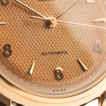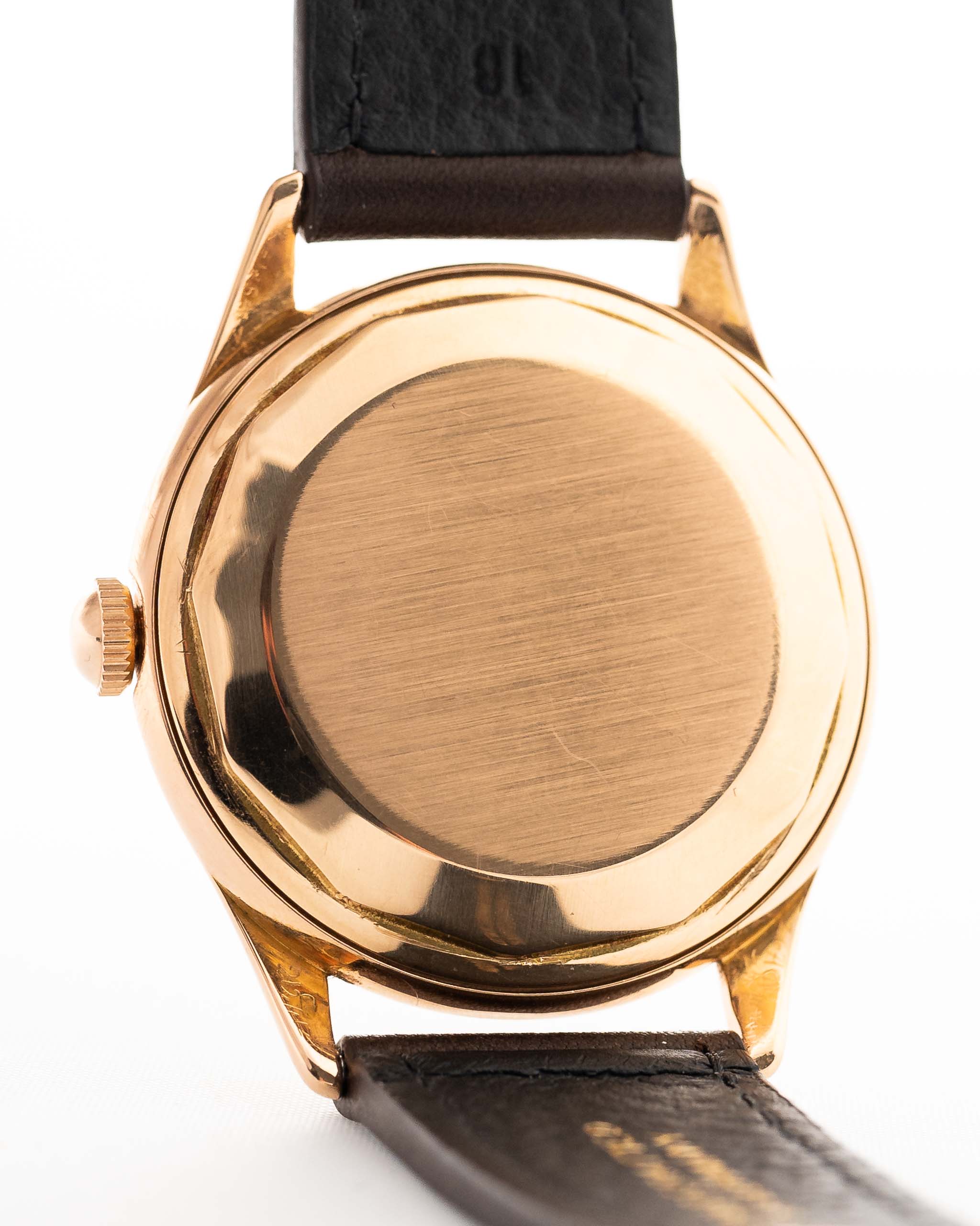 Vacheron Constantin Guilloche Rose 1950s an einem Handgelenk. 35 mm aus 18 Karat Roségold mit Automatik-Kal. 477/1, Guilloché-Zifferblatt und Lederarmband.