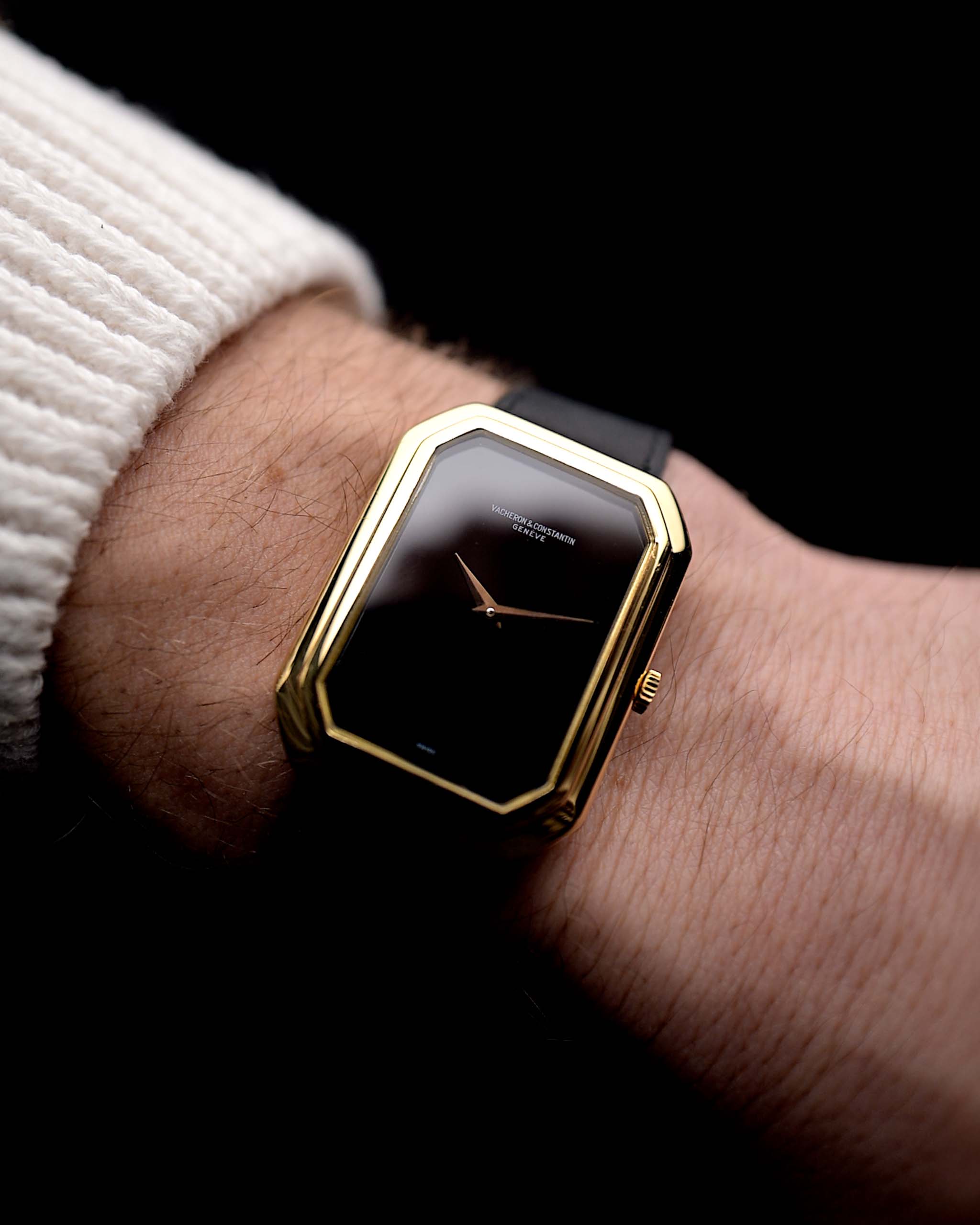 Dieses besondere Stück besticht durch seine einzigartige Kombination aus dem riesigen schwarzen Onyx-Zifferblatt und dem massiven, abgestuften Gehäuse aus 18k Gelbgold. Die goldenen Dauphine-Zeiger und der weiße VC-Schriftzug bilden einen tollen Kontrast zum schwarzen Zifferblatt. Diese Uhr bringt pure Klasse an jedes Handgelenk, das sie umarmt, und man sieht sie nur selten auf dem Markt.