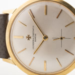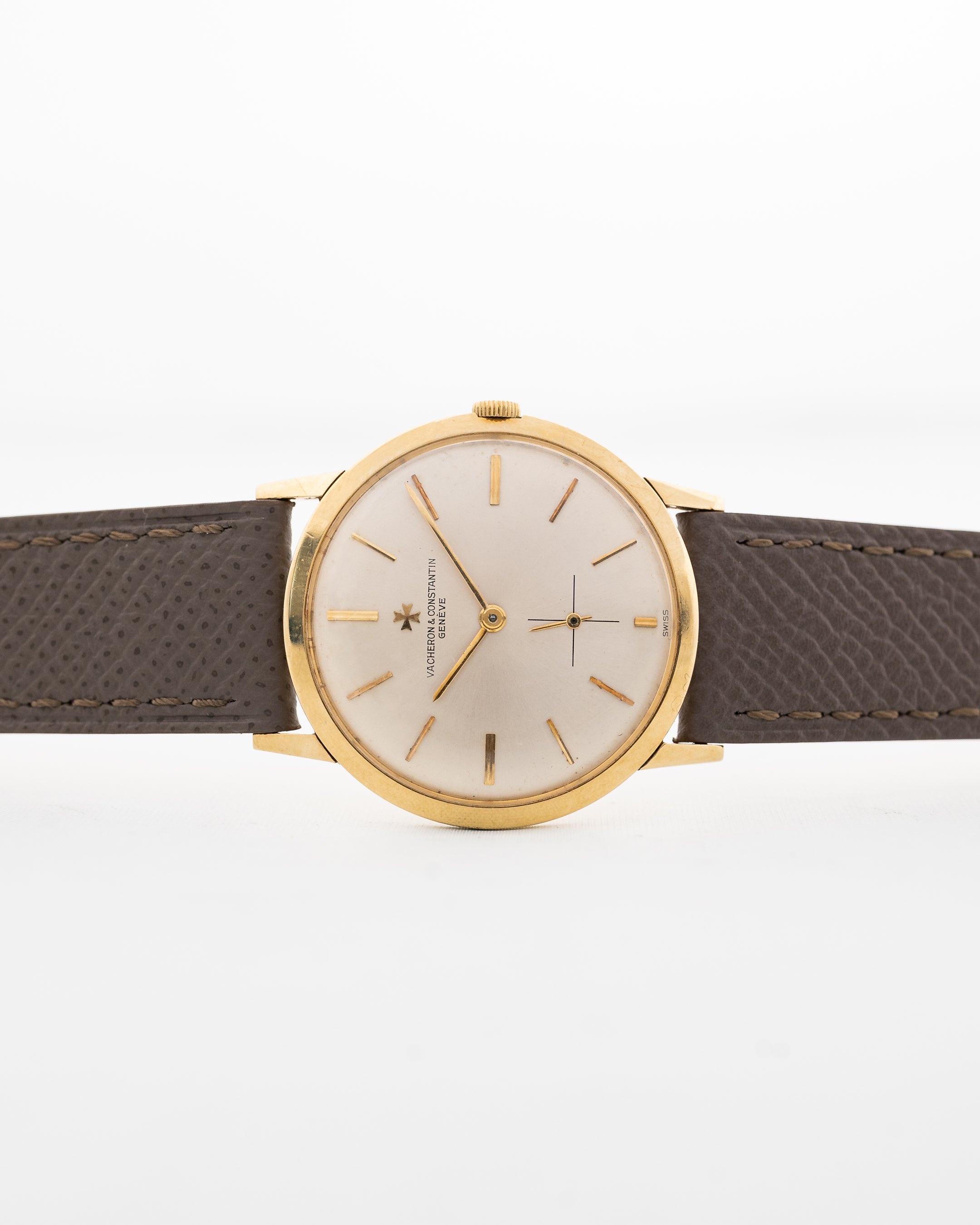Hier haben wir eine wunderschön gearbeitete Vacheron Constantin Armbanduhr aus 18k Gelbgold aus den 1960er Jahren. Dieses besondere Stück zeichnet sich durch sein schönes silbernes Sonnenschliff-Zifferblatt, das applizierte Vacheron-Logo, eine saubere kleine Sekunde und ein starkes unpoliertes 18k Gelbgoldgehäuse aus.