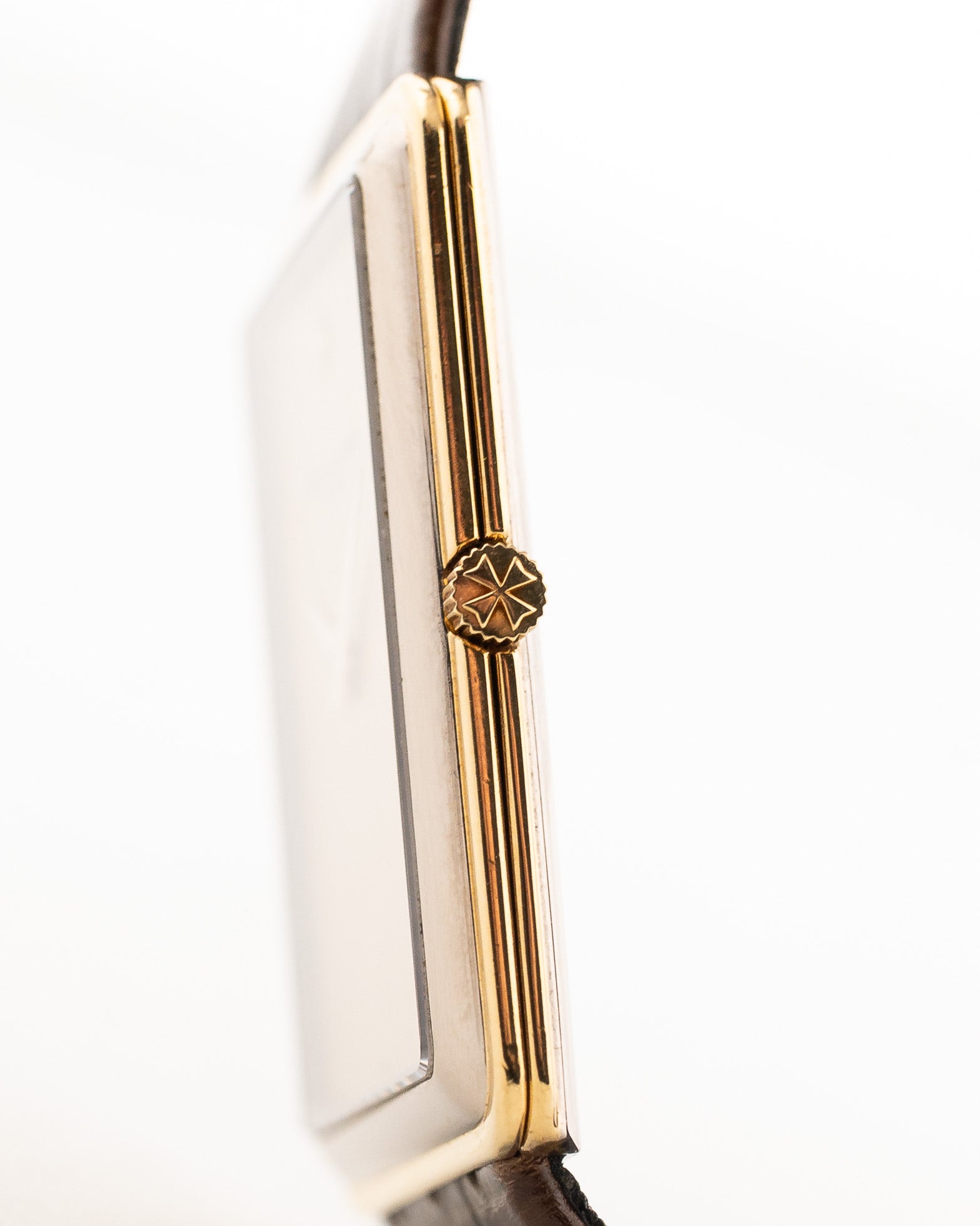 Unsere Vacheron Constantin Ref. 33212 zeichnet sich durch eine exquisite Kombination von Metallen aus. Die kantigen Linien und das rechteckige Design kontrastieren Weißgold und Gelbgold auf sehr harmonische Weise.