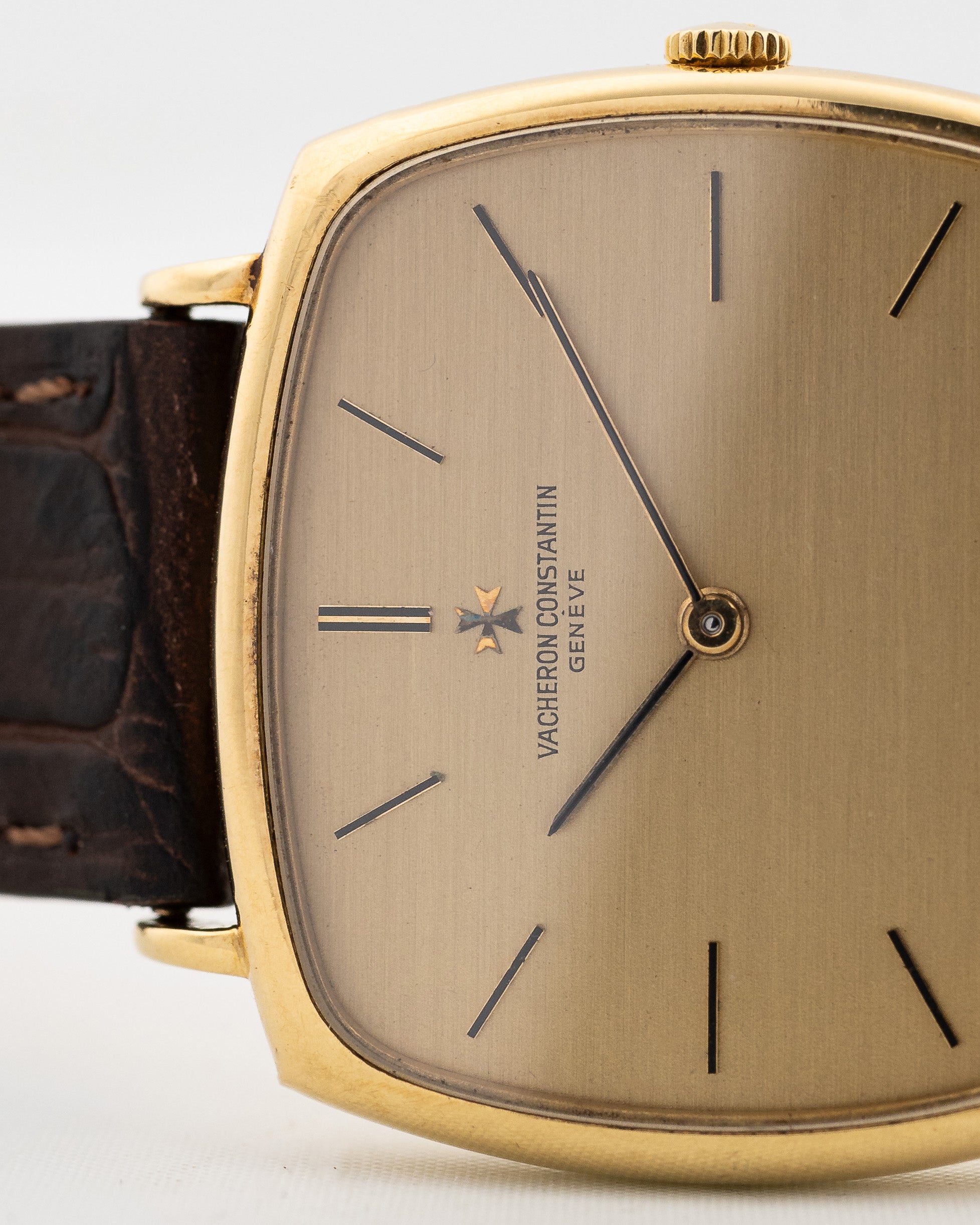 Hier haben wir eine wunderschön gearbeitete 18k Gelbgold Vacheron Constantin Kleideruhr in einem Panzerdesign aus den 1970er Jahren. Dieses besondere Stück zeichnet sich durch sein schönes 18k-Sigma-Zifferblatt, das applizierte Vacheron-Logo und ein robustes Gehäuse aus 18k-Gelbgold aus.