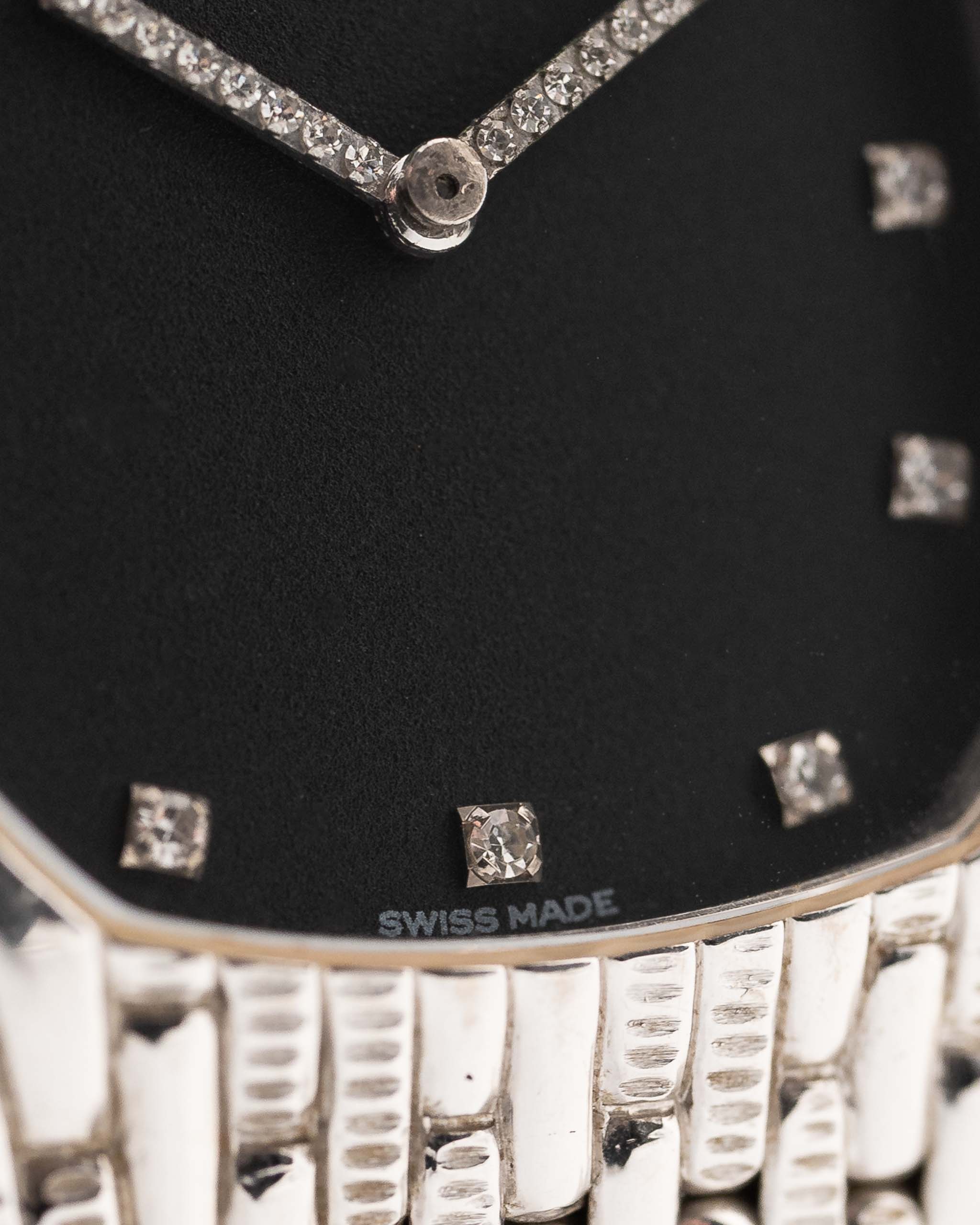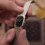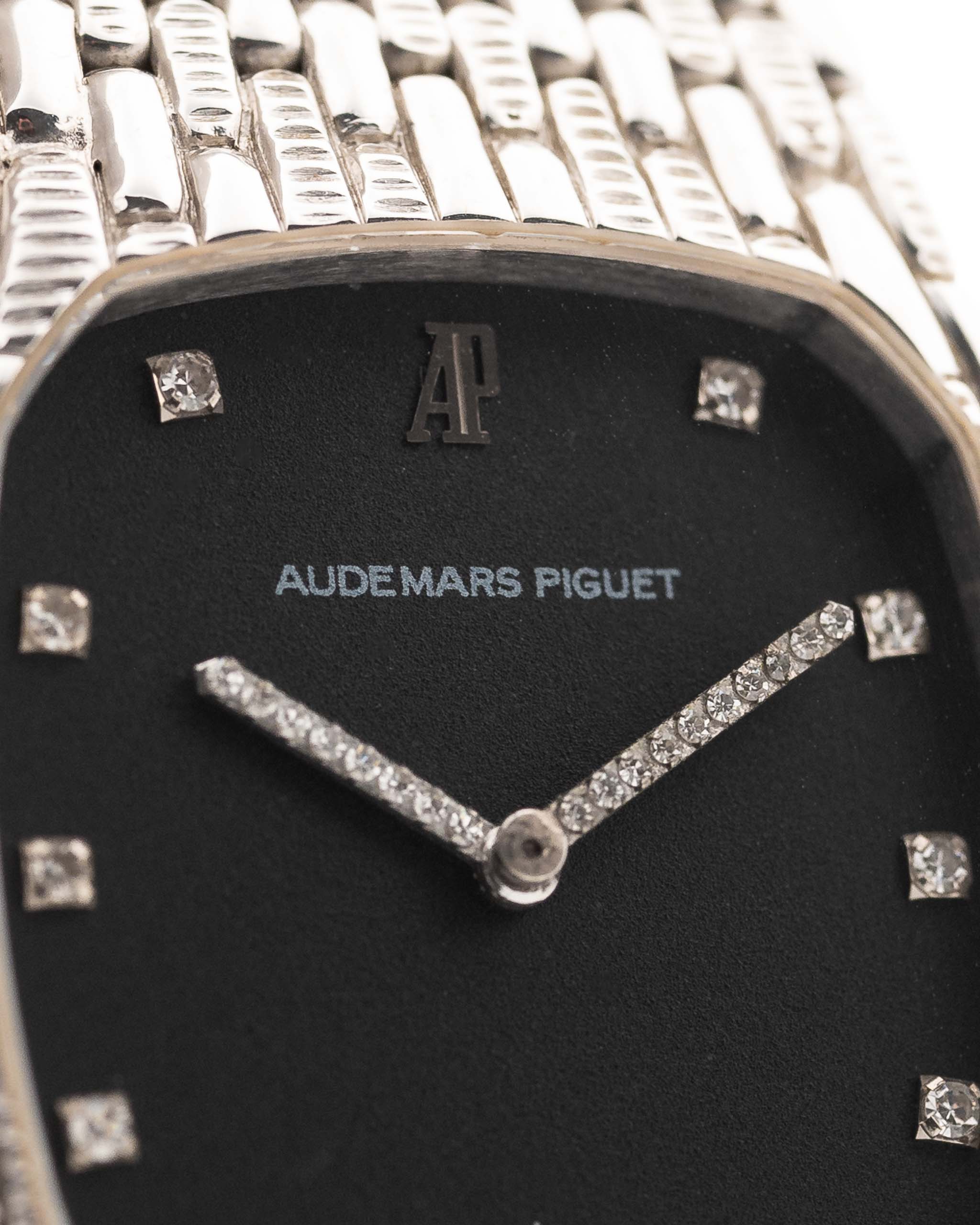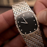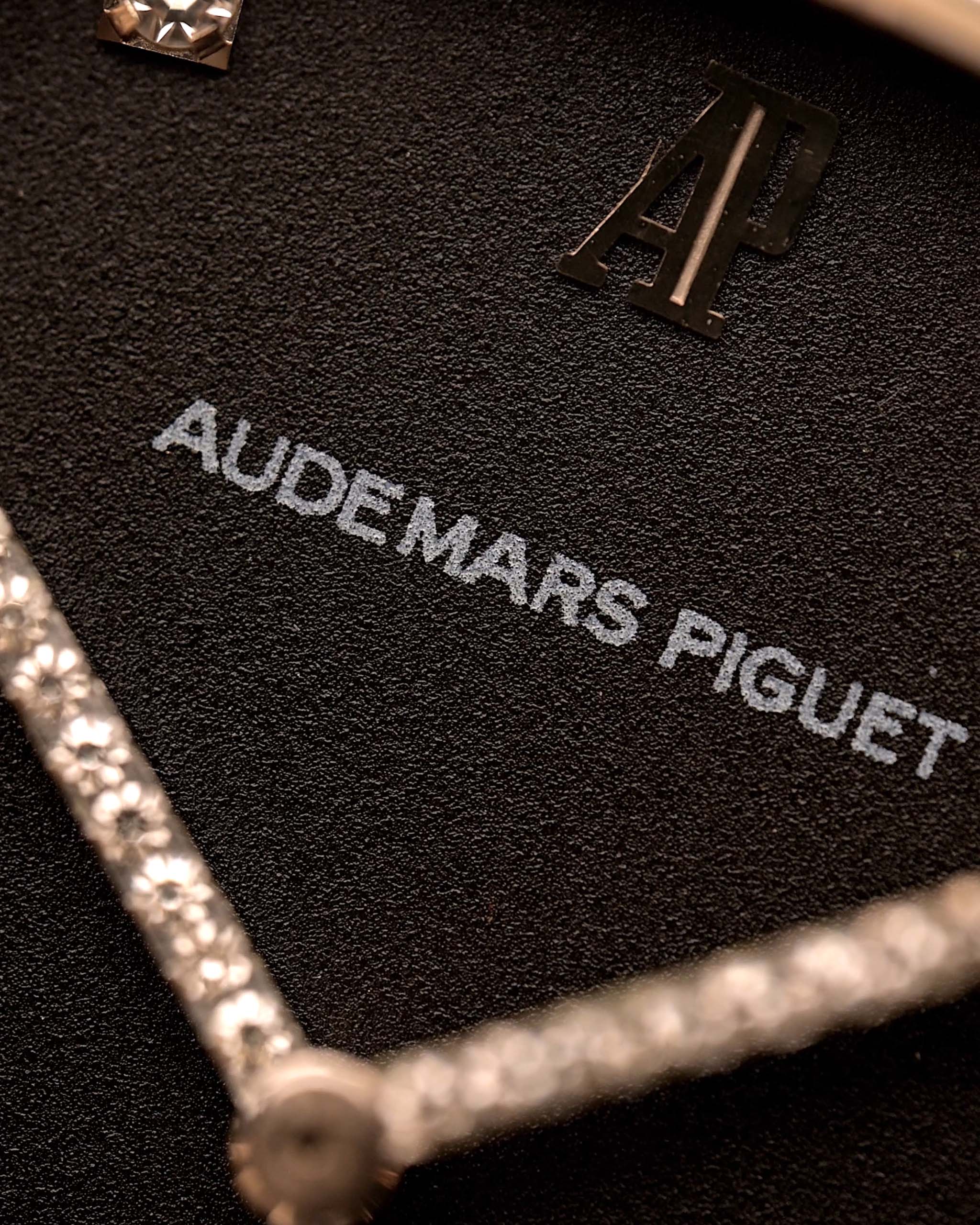 Das schwarze Zifferblatt ist ein echter Blickfang: 11 werkseitig gefasste Diamanten als Stundenmarkierungen und weitere 18 Diamanten, die die Zeiger zieren, sorgen für ein funkelndes Zusammenspiel vor dem dunklen Hintergrund. Der nahezu makellose Zustand und die raffinierten Proportionen machen dieses Stück zu einem tragbaren Schmuckstück mit unverkennbarem AP-Charakter.