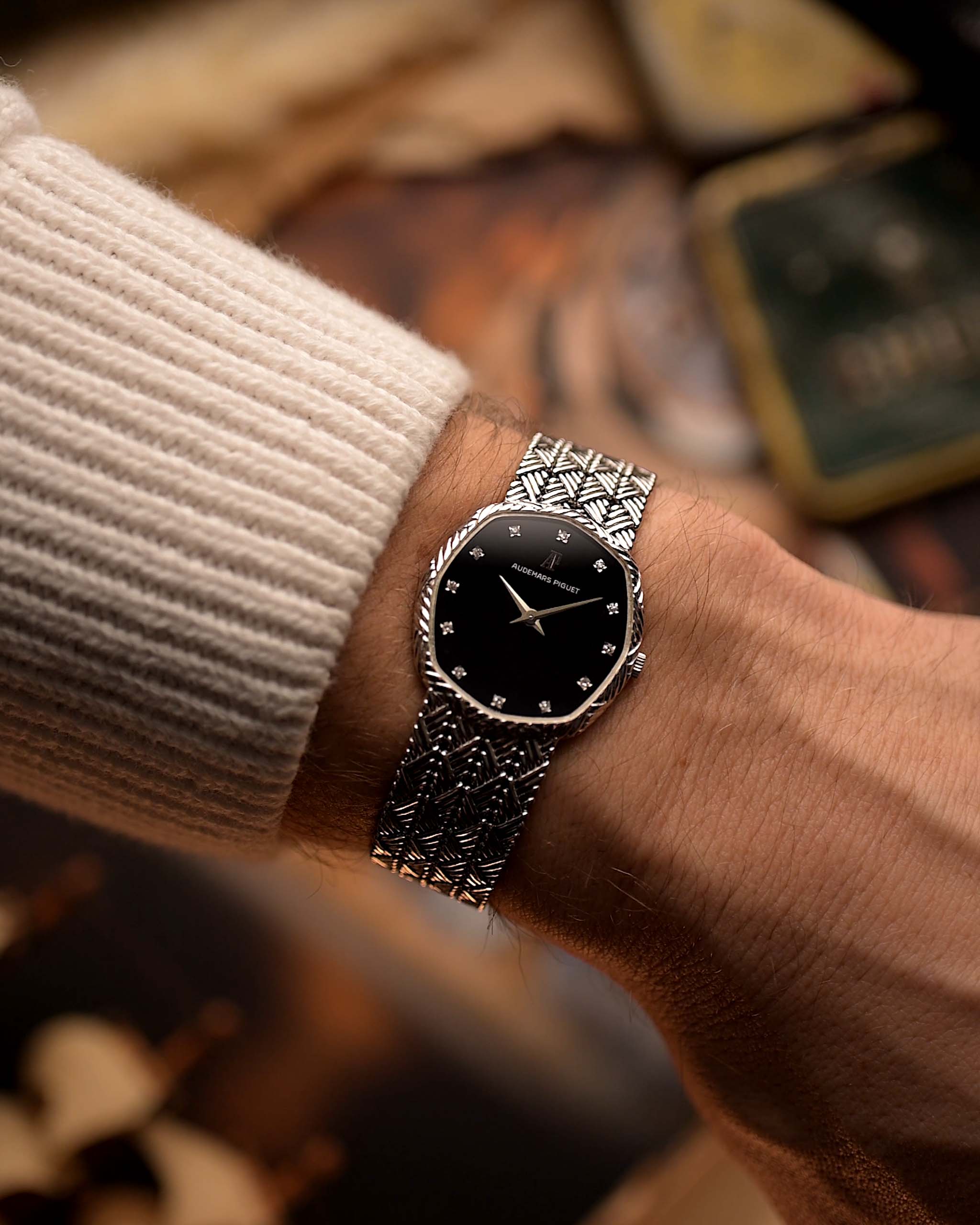 Diese seltene Audemars Piguet aus den späten 1970er Jahren ist eine Übung in stiller Opulenz. Ihr einzigartiges achteckig-elliptisches Gehäuse ist komplett aus 18 Karat Weißgold gefertigt und beherbergt ein makelloses schwarzes Onyx-Zifferblatt, das von zwölf werkseitig gefassten Diamantindexen unterstrichen wird - unaufdringlicher Luxus vom Feinsten.