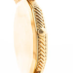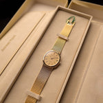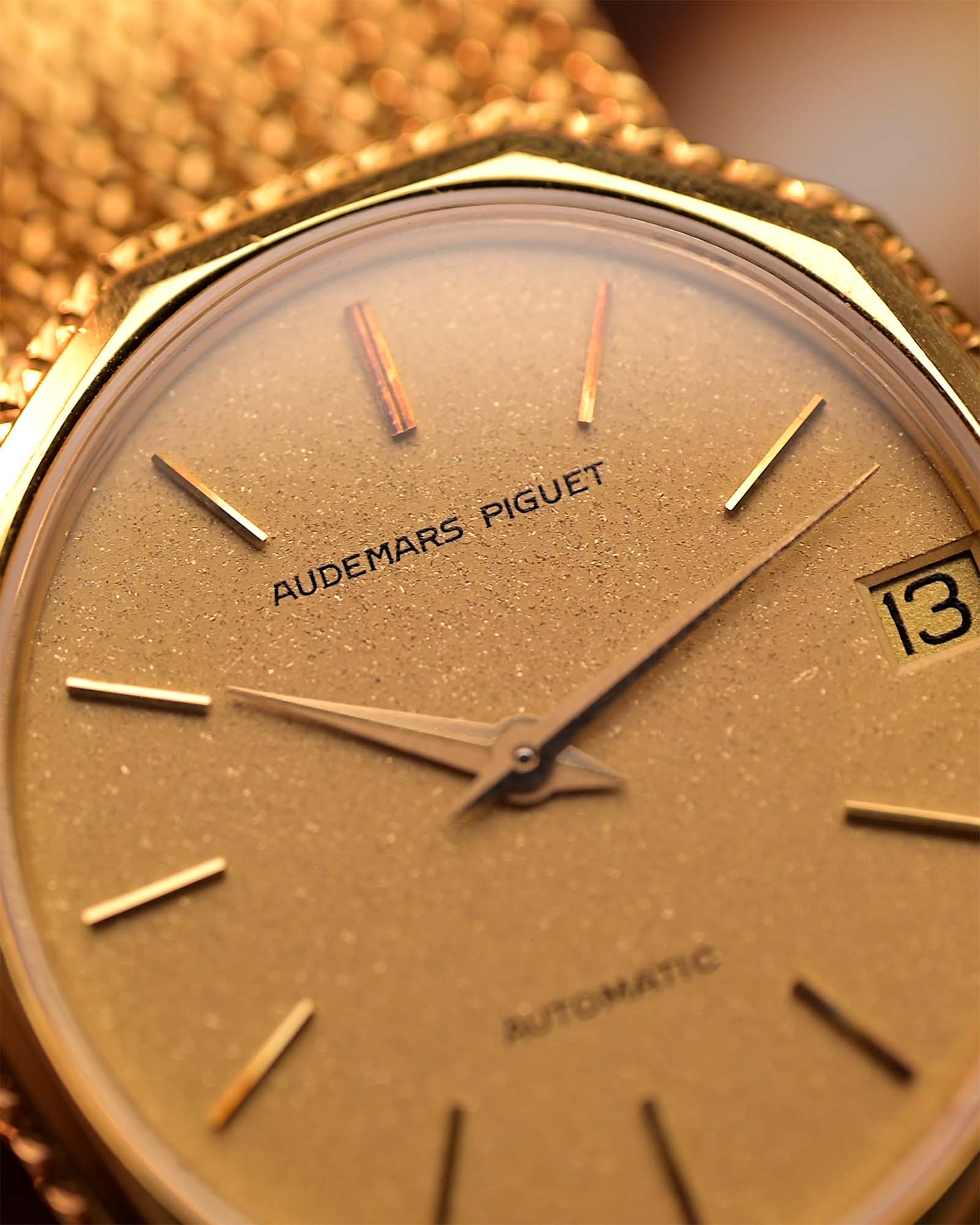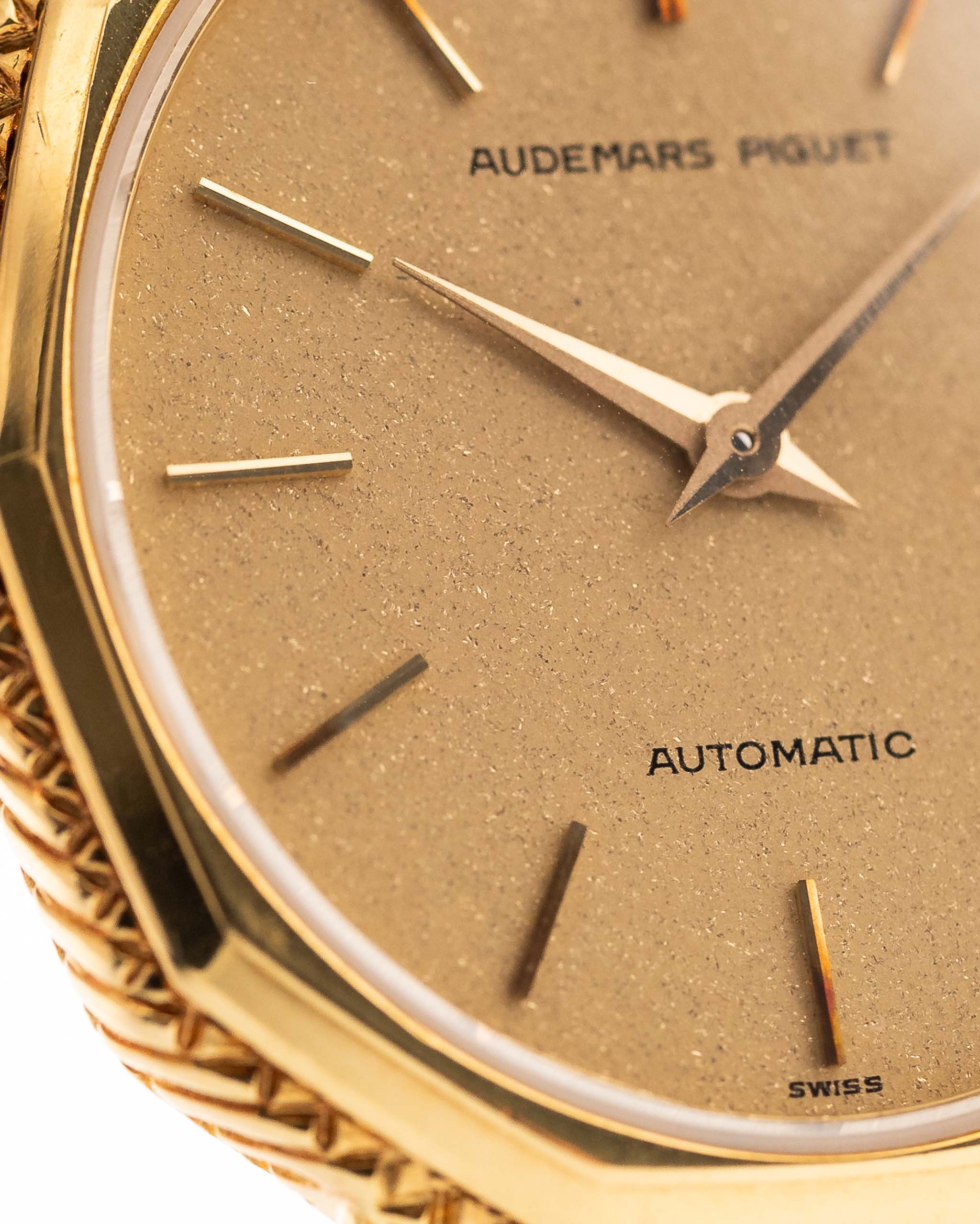 Diese Audemars Piguet-Kleideruhr aus den 1970er Jahren besticht durch ihr seltenes gestuftes dekagonales Gehäuse, das vollständig aus 18 Karat Gelbgold gefertigt ist. Das Zusammenspiel von Geometrie und Textur setzt sich auf dem ovalen, goldenen Zifferblatt fort, dessen dezent schimmernde Oberfläche bei jeder Bewegung das Licht einfängt.
