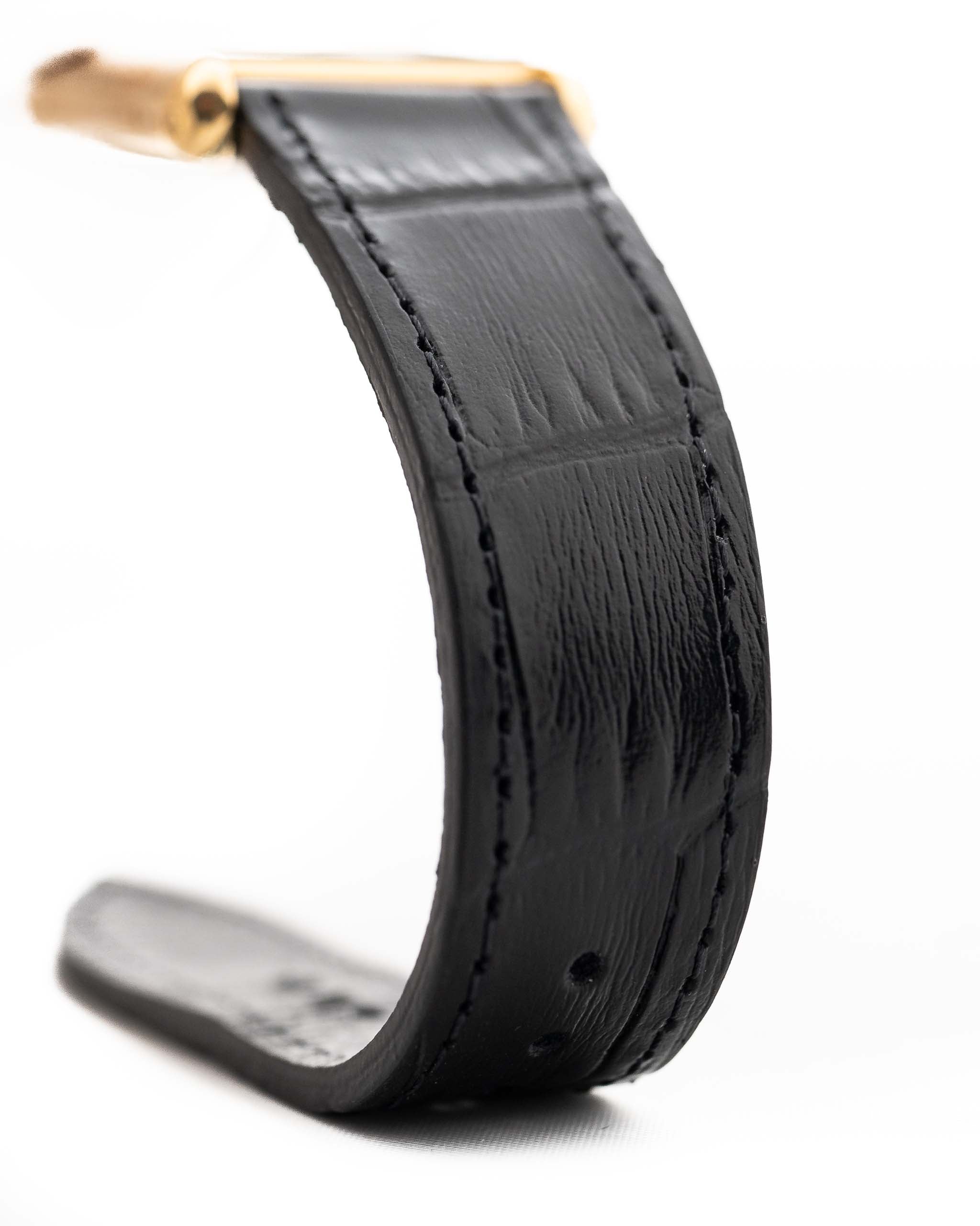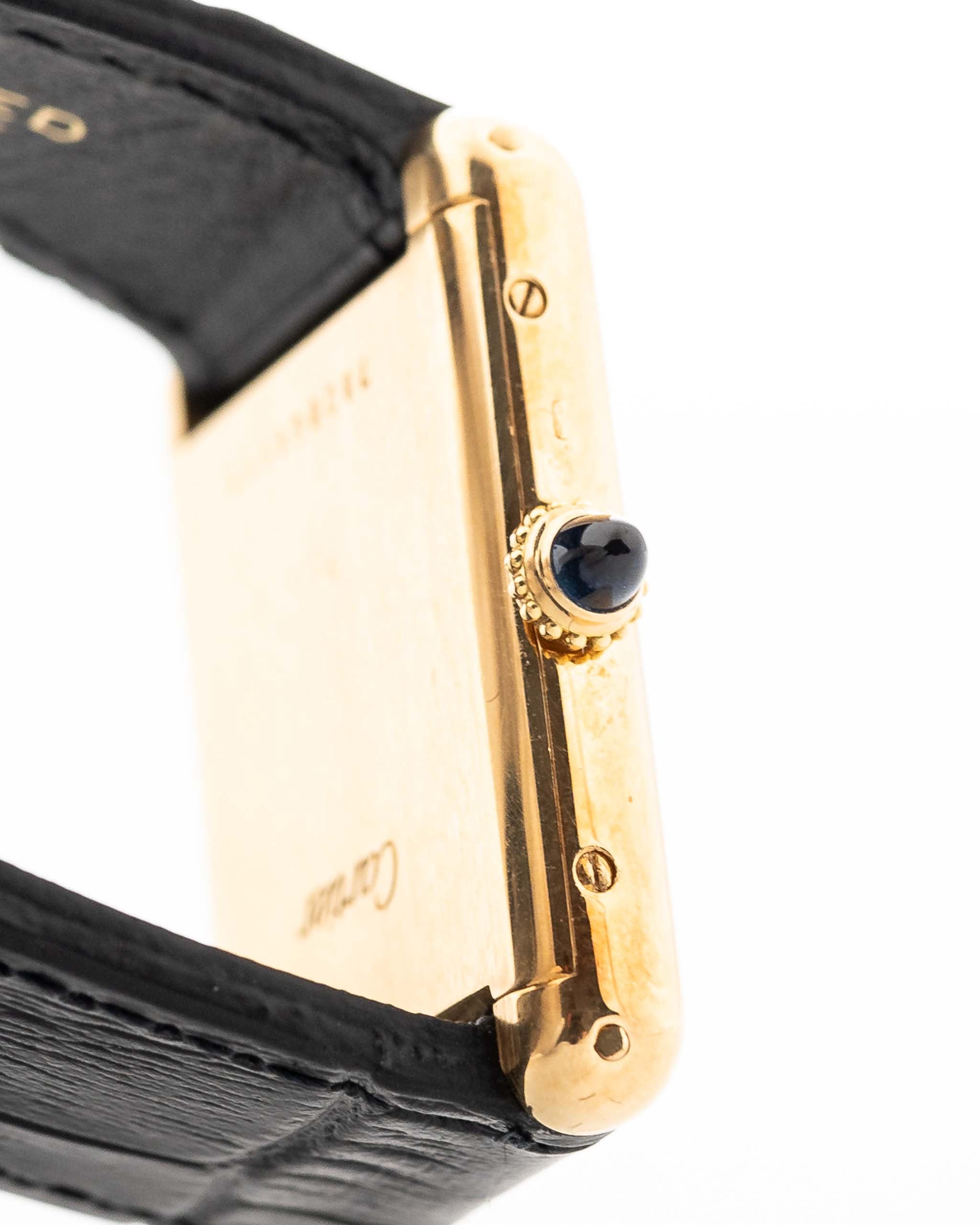 Housed in an elegant 18k yellow gold case with beautifully preserved lines, the 23.5 x 29.5 mm proportions make this a discreet yet undeniably stylish presence on the wrist. The dial is flawless: crisp Roman numerals, the “Paris” signature (sold at Cartier Paris) at 6 o’clock, and original blued sword hands — all wrapped in Cartier’s timeless visual harmony.