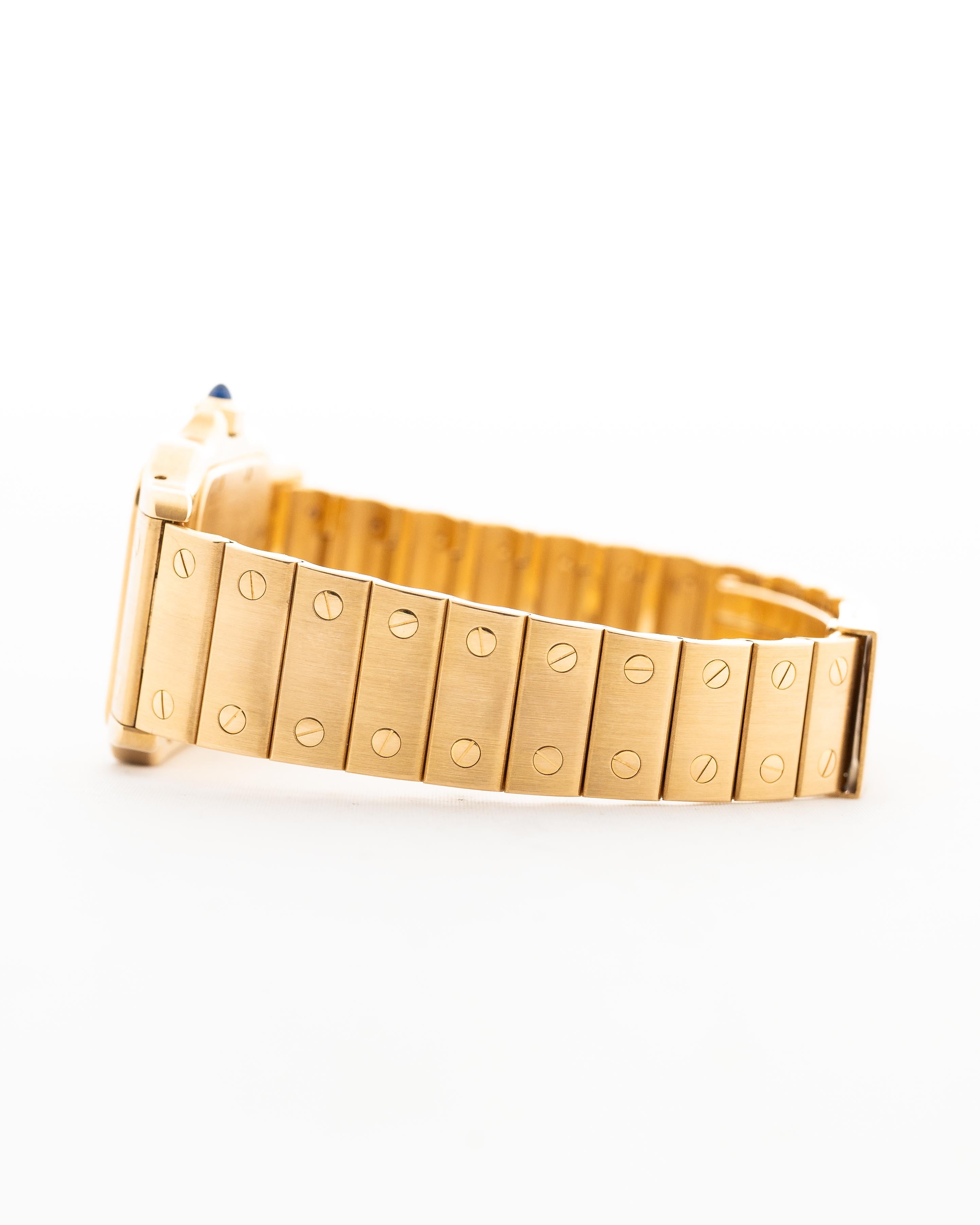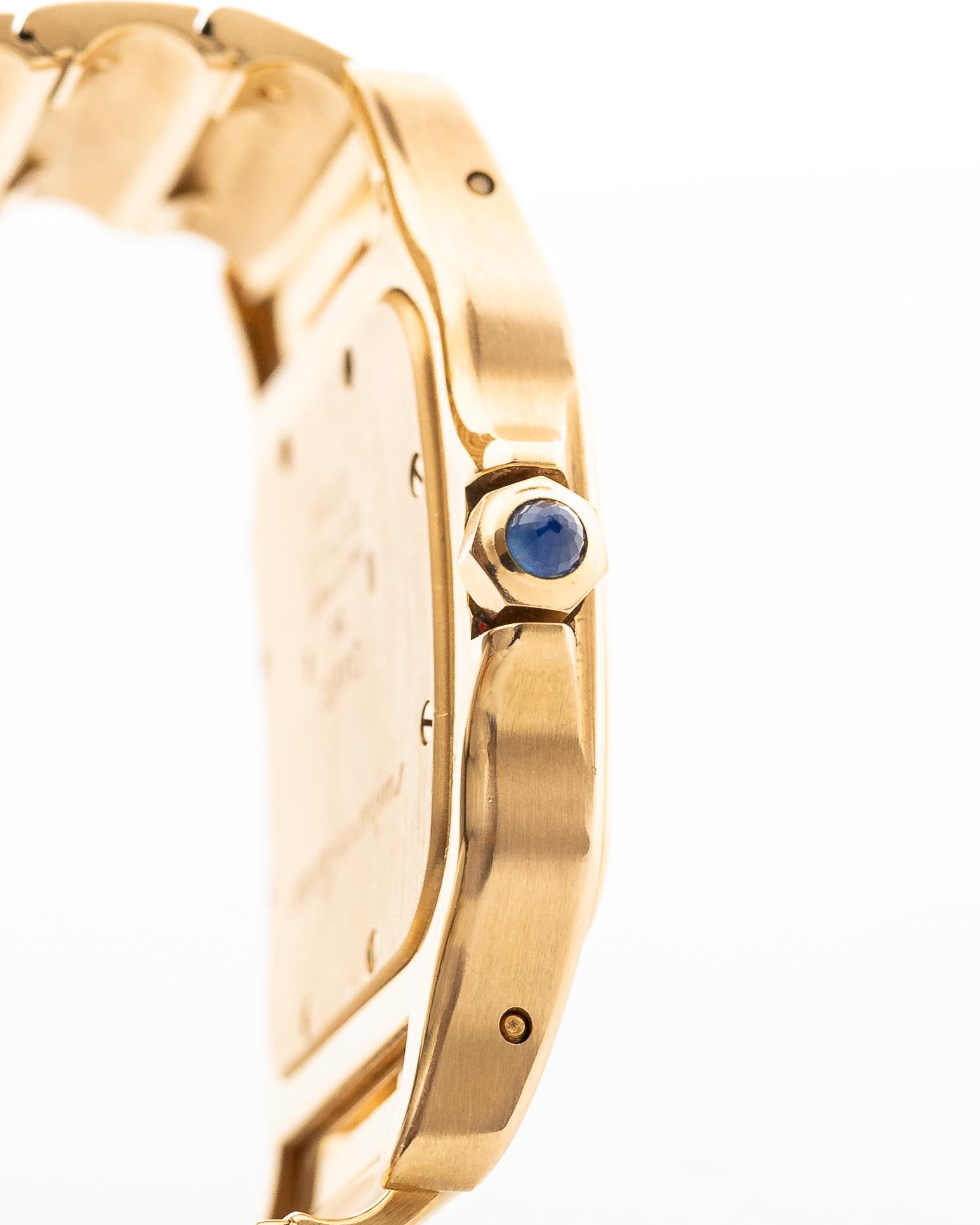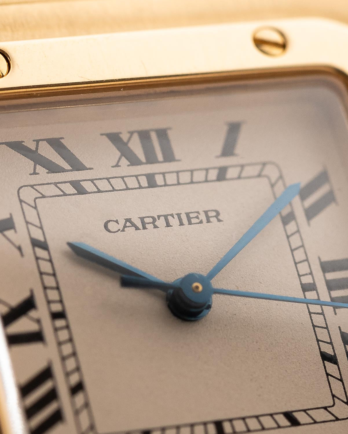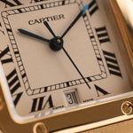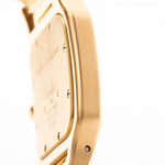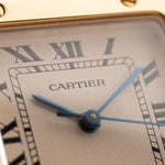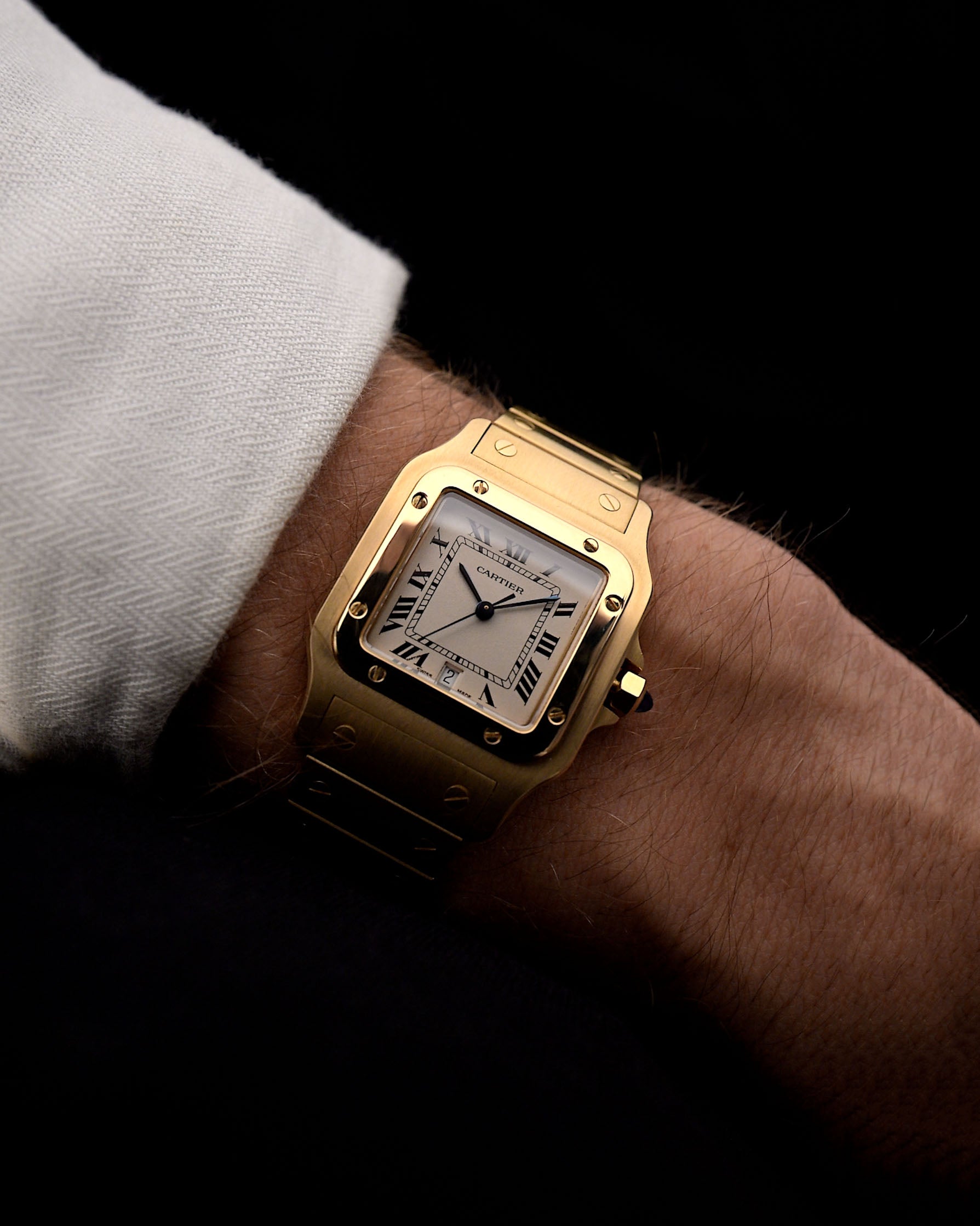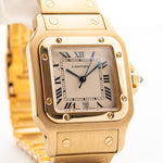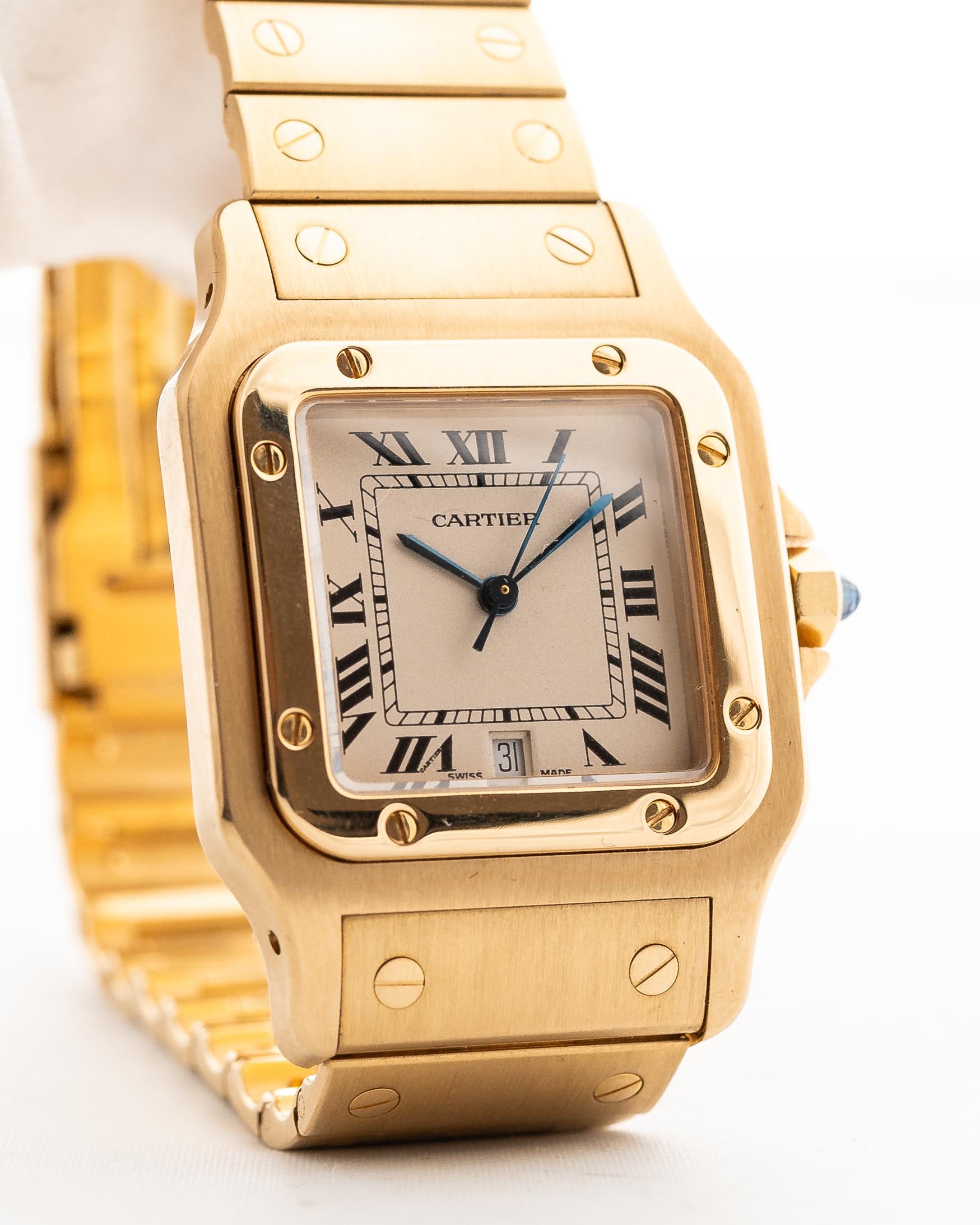 Diese massive Cartier Santos Galbée aus 18 Karat Gelbgold besticht durch ihr klassisches cremefarbenes Cartier-Zifferblatt, die gebläuten Stahlzeiger und natürlich die schwarzen römischen Ziffern.
