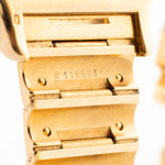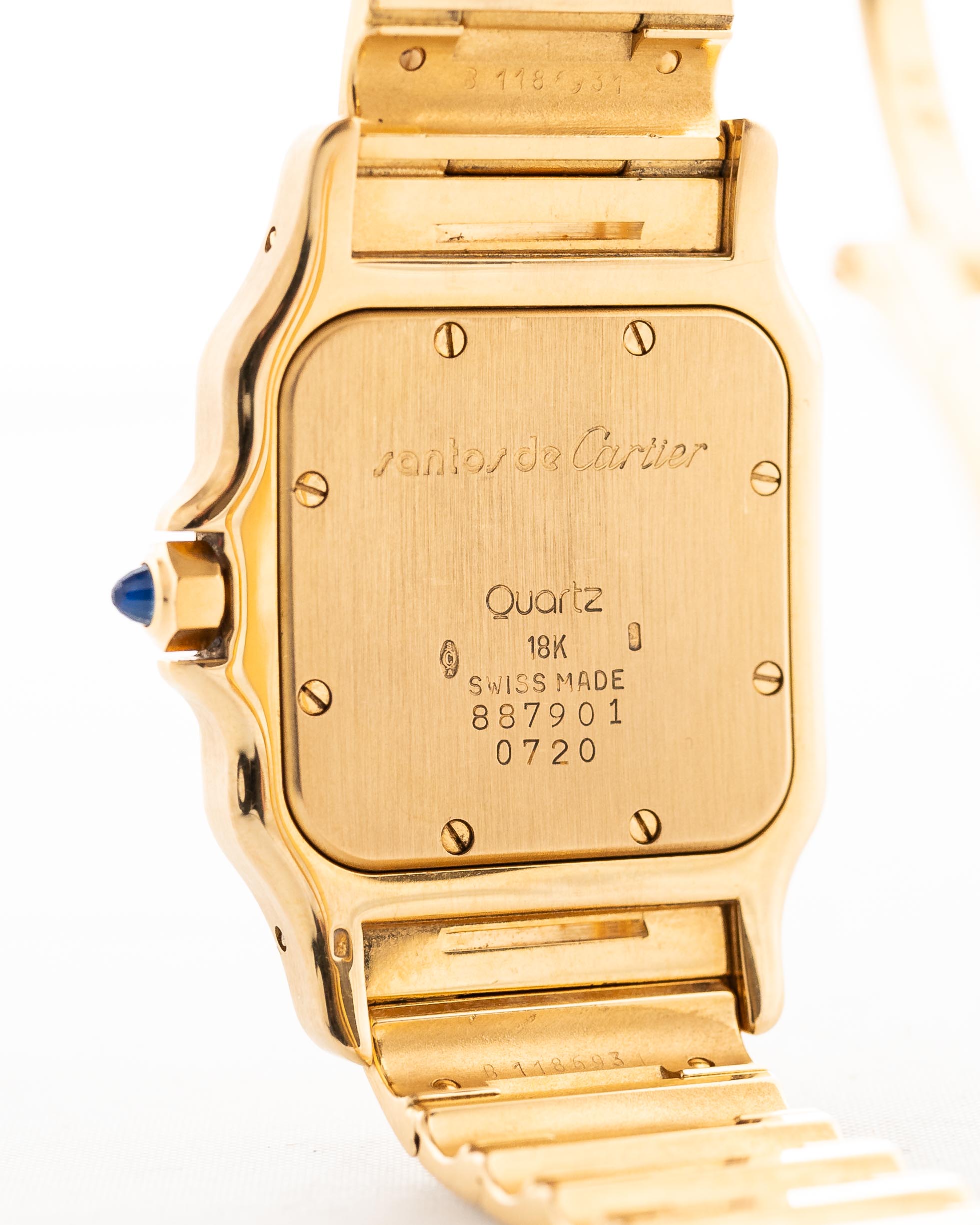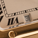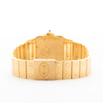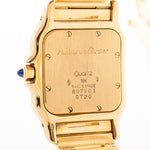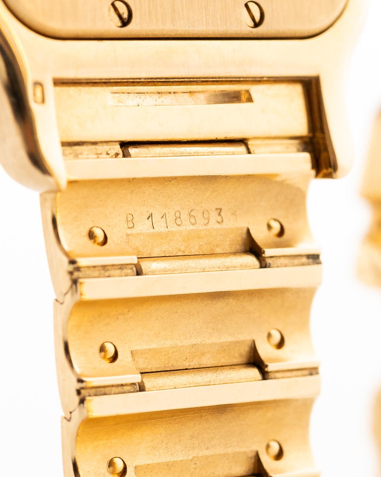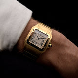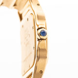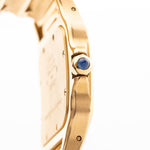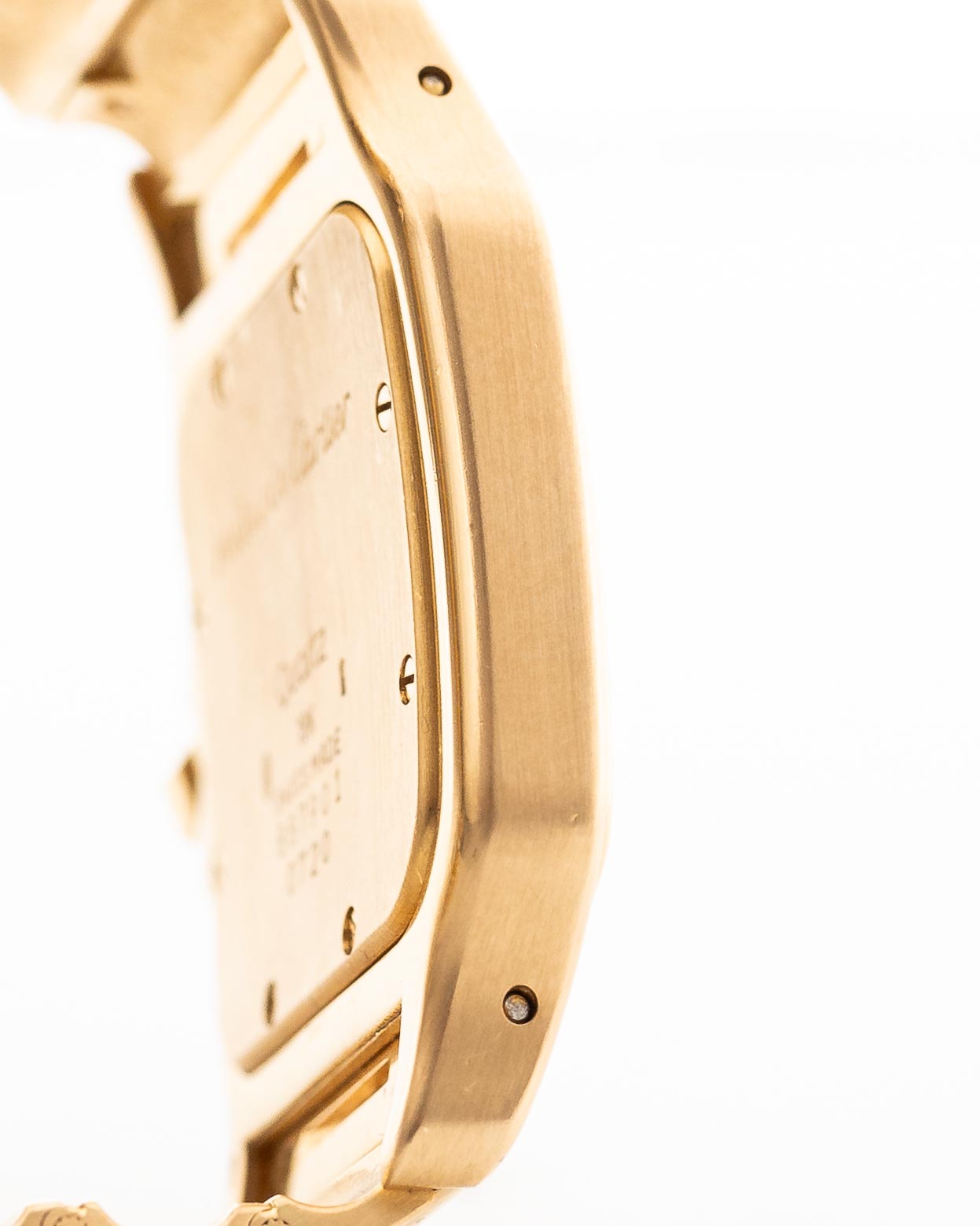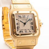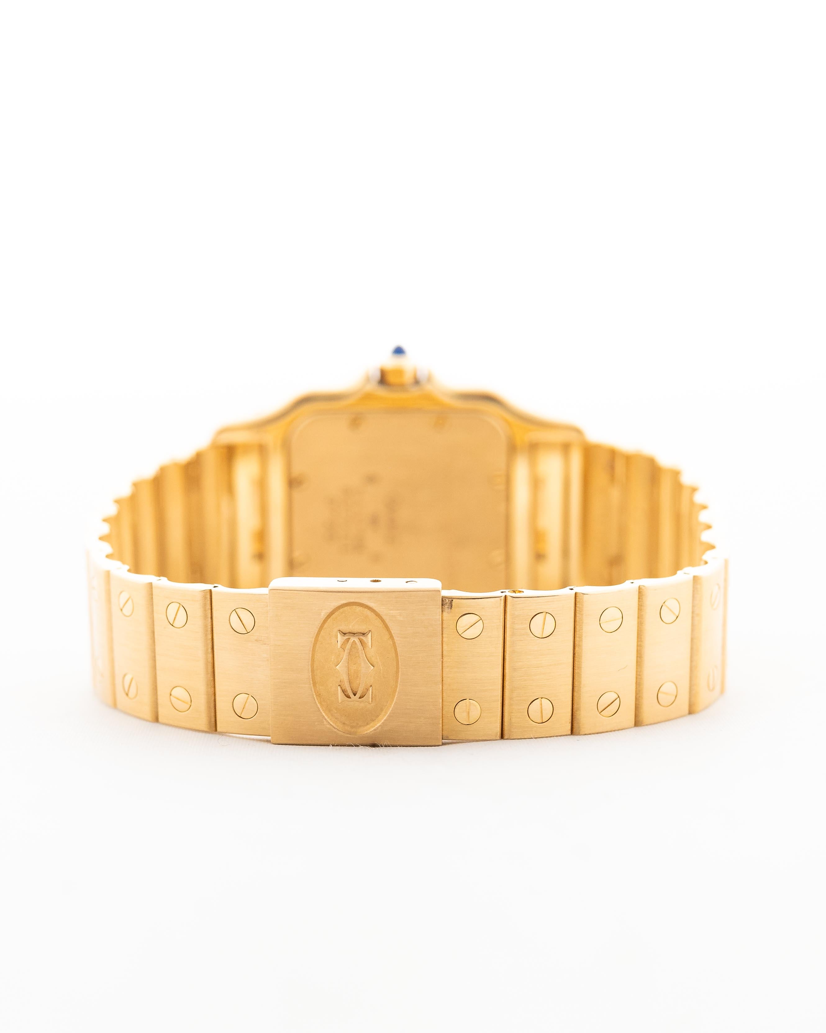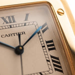 Diese massive Cartier Santos Galbée aus 18 Karat Gelbgold besticht durch ihr klassisches cremefarbenes Cartier-Zifferblatt, die gebläuten Stahlzeiger und natürlich die schwarzen römischen Ziffern.