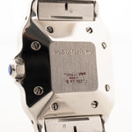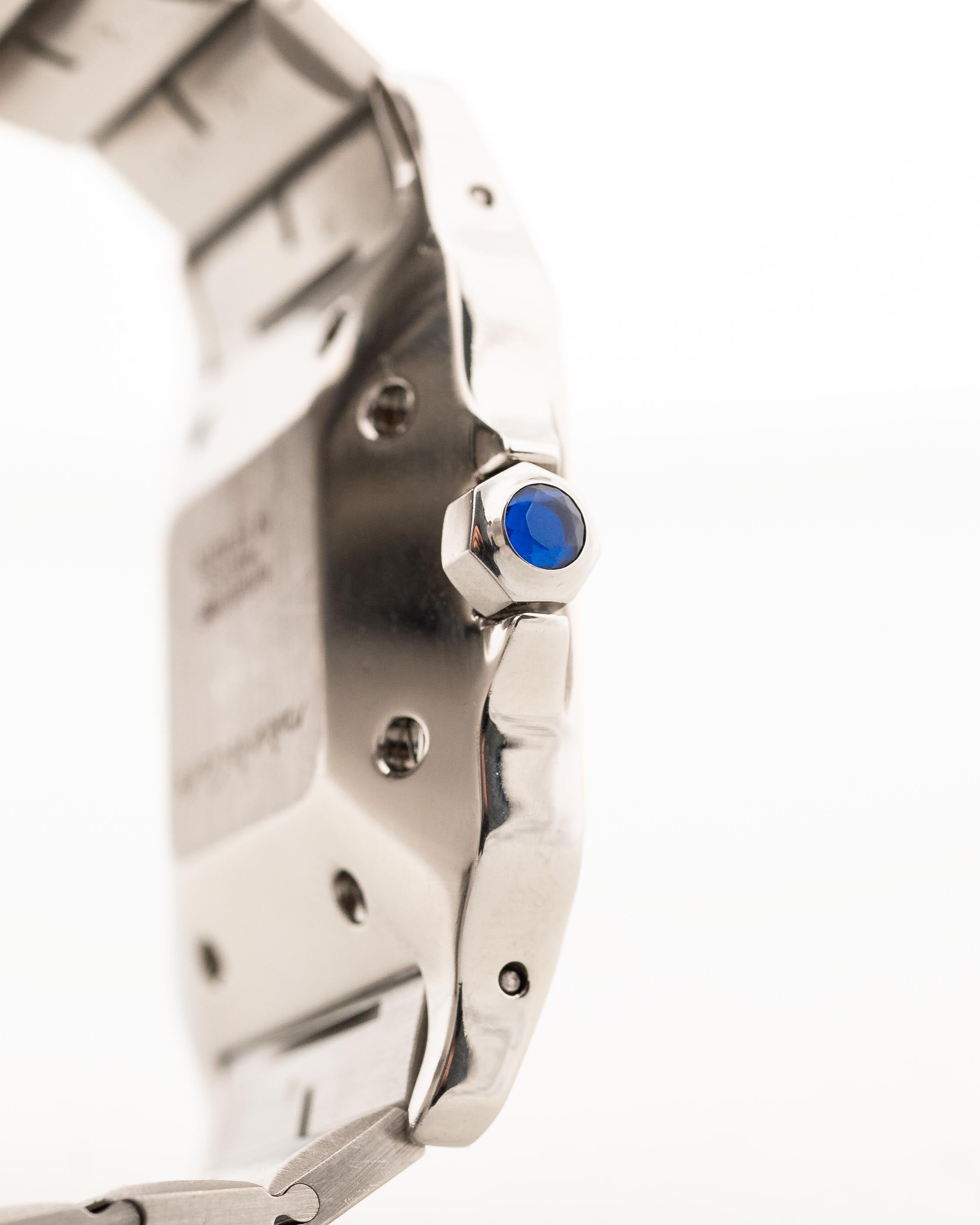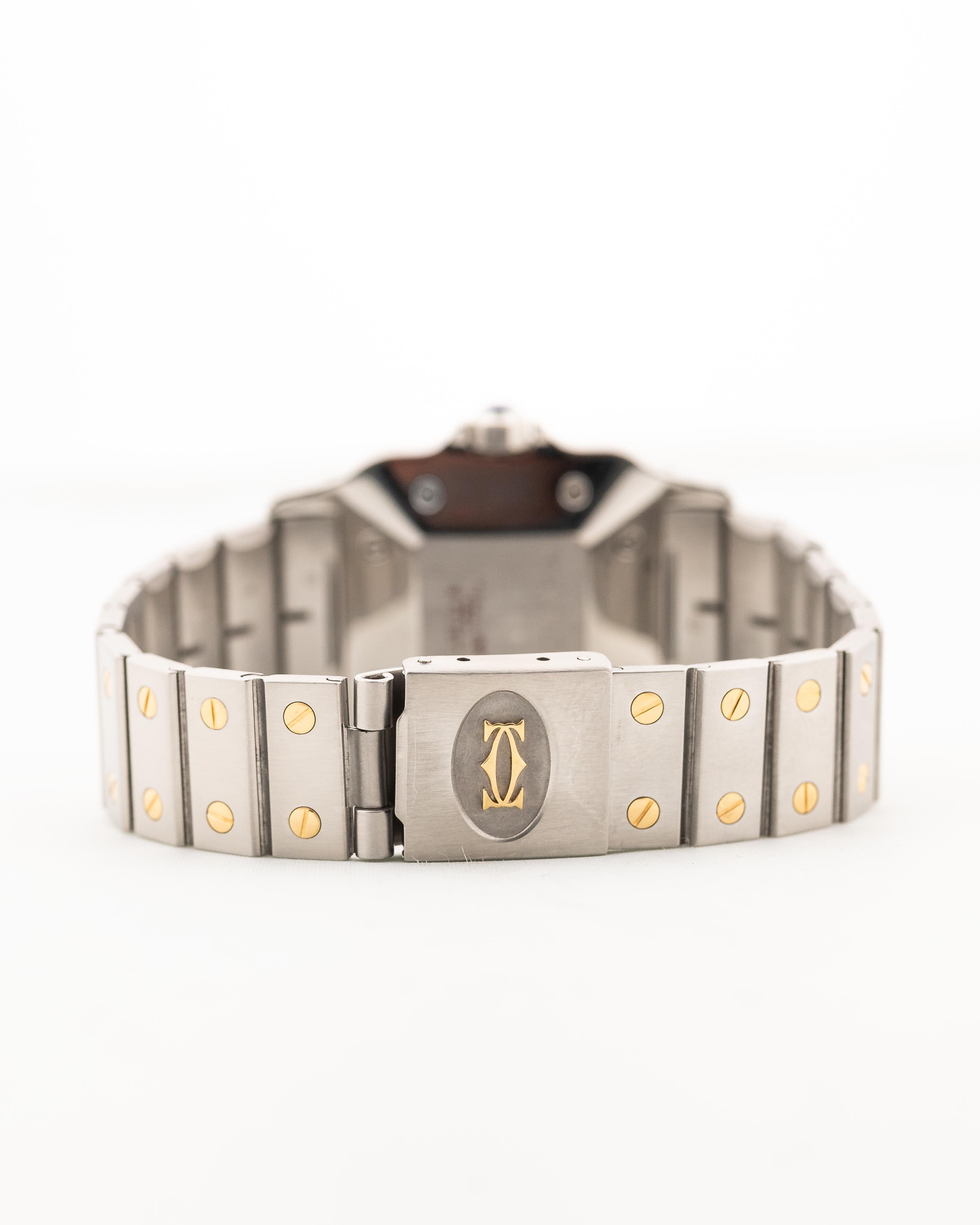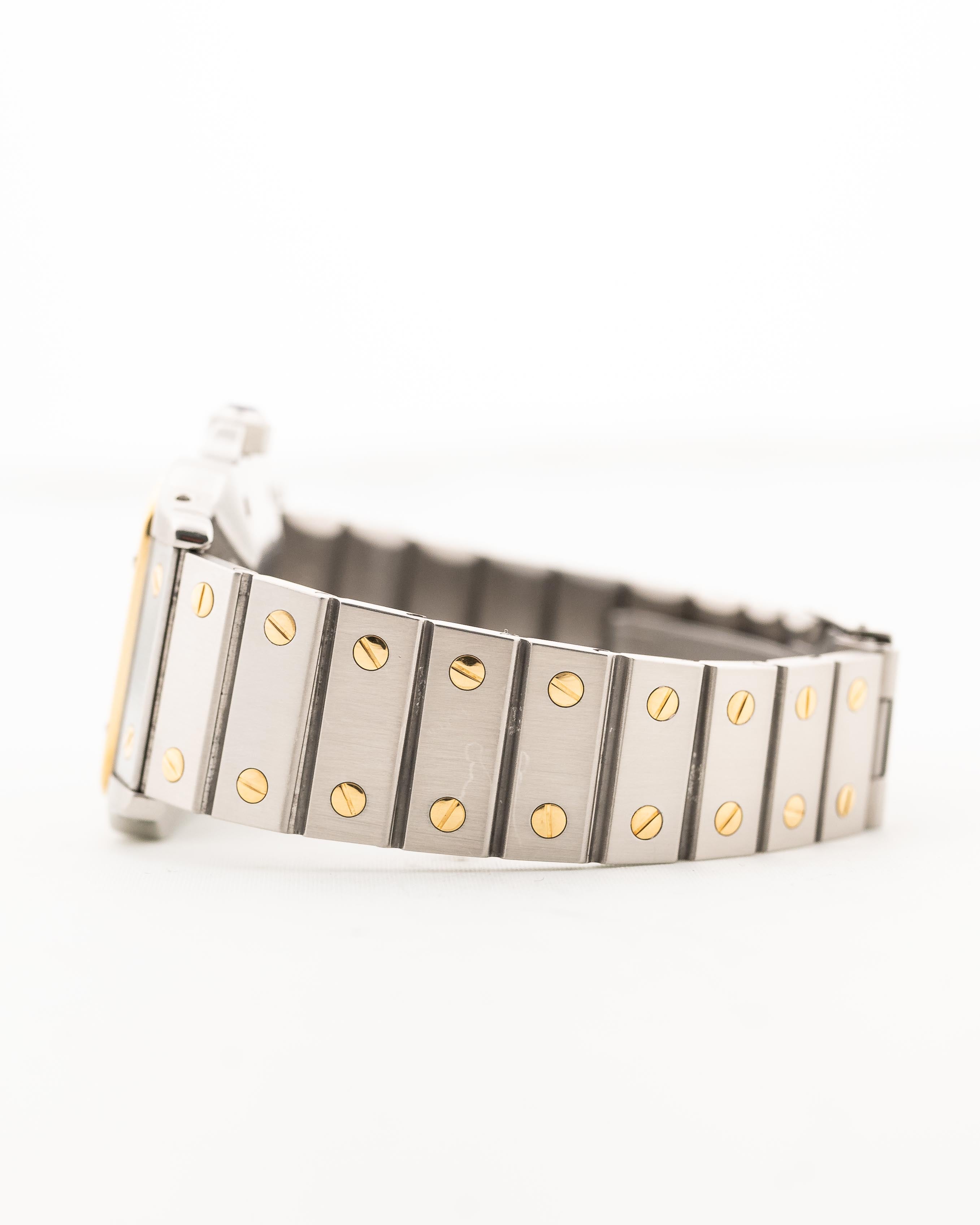 Diese Cartier Santos Carrée aus zweifarbigem Edelstahl besticht durch ihr gebürstetes schiefergraues oder sogenanntes "Geister"-Zifferblatt, die glänzenden goldenen Schwertzeiger und natürlich durch das ikonische Cartier Santos Armband aus Edelstahl mit den goldenen Schrauben. Diese Version ist deutlich seltener, was sie noch begehrenswerter macht.