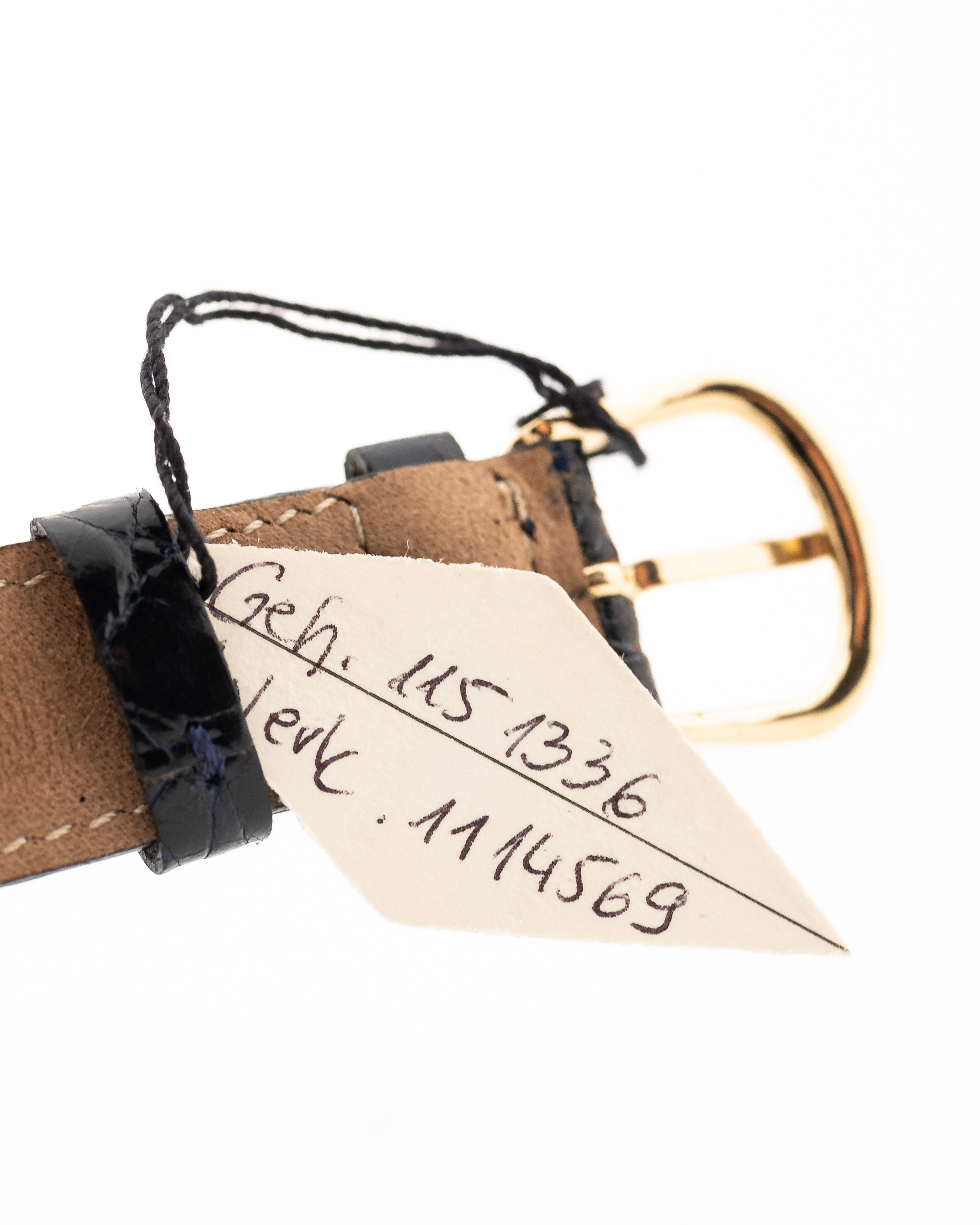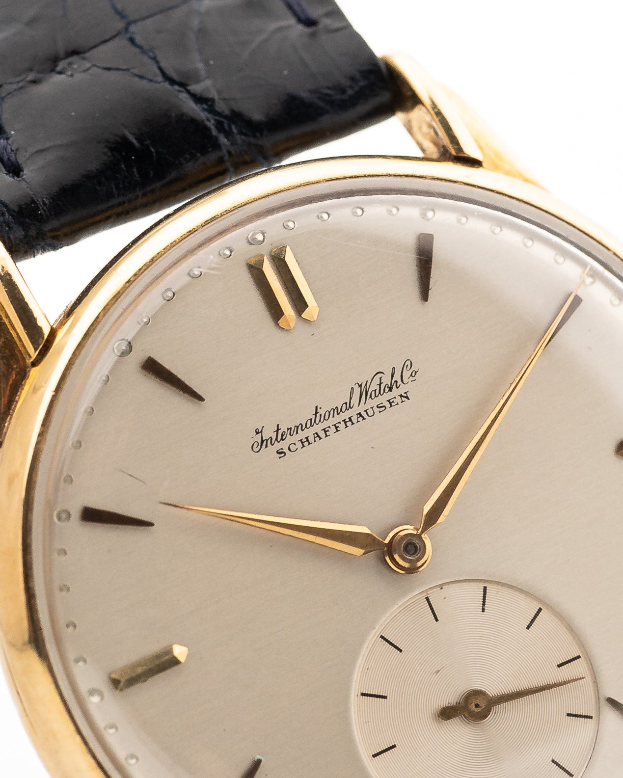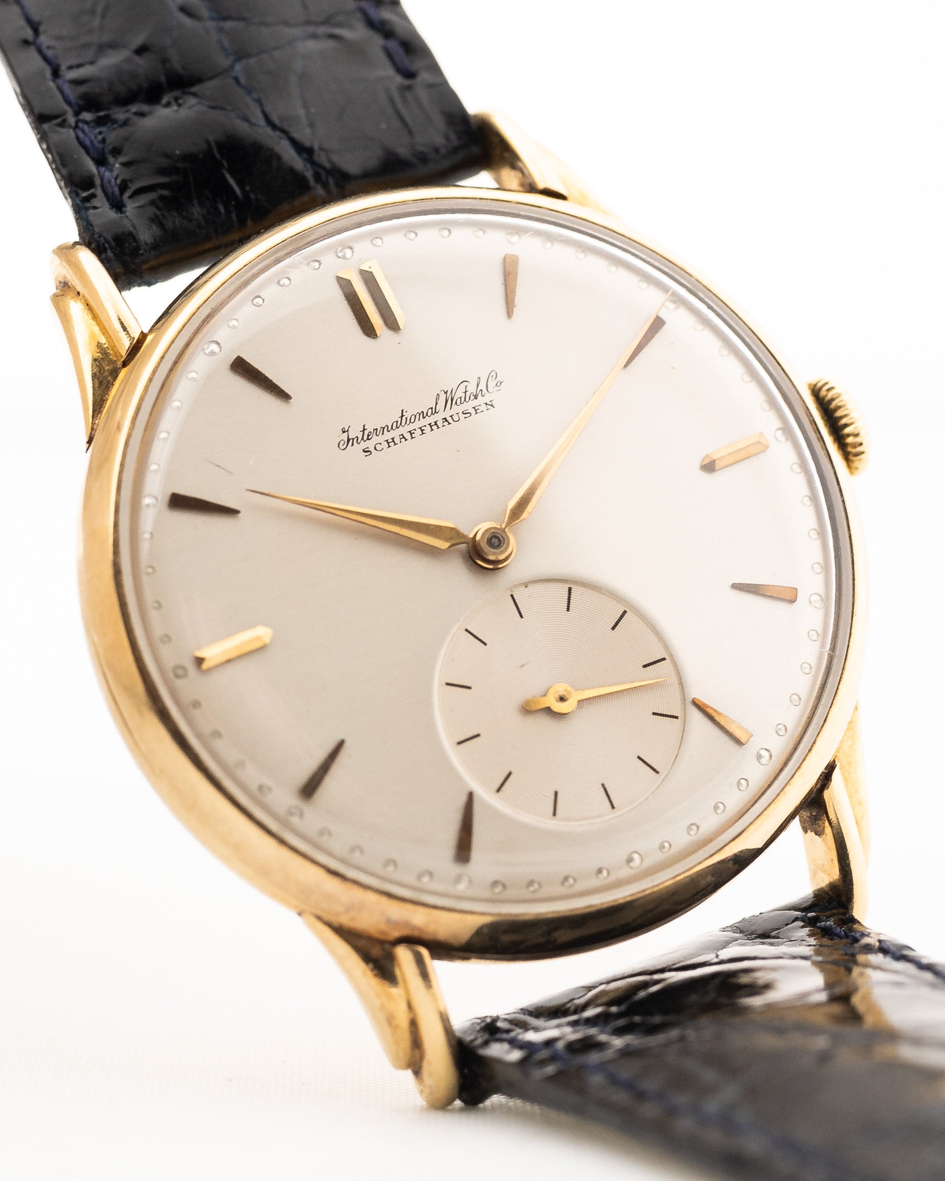IWC hat schon früh eine breite Palette von Armbanduhren hergestellt, die von Kleideruhren bis hin zu Fliegeruhren reichen. Unser Exemplar aus dem Jahr 1946 mit einem Gehäuse aus 18 Karat Gelbgold, abgesetzten Bandanstößen und einem schönen silberfarbenen Zifferblatt mit kleiner Sekunde sollte in keiner Sammlung fehlen, zumal es sich in einem so hervorragenden Zustand befindet.