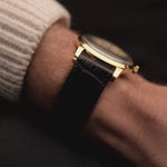 Diese IWC Automatik aus dem Jahr 1952 besticht durch ein für diese Ära übergroßes Gehäuse aus 36,5 mm 18k Gelbgold. Angetrieben von dem legendären IWC-Kaliber 852, einem der angesehensten Automatikwerke der Epoche, strahlt sie zeitlose Raffinesse aus. Das 18-karätige Gelbgoldgehäuse mit sanft nach unten gebogenen Bandanstößen, kombiniert mit Dauphine-Zeigern und -Indexen, sorgt für ein ausgewogenes und elegantes Profil am Handgelenk.
