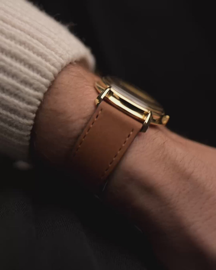 Das goldene Zifferblatt, unberührt und natürlich gealtert mit einer sanften Patina, harmoniert mühelos mit der Wärme des Gehäuses. Diese klassische, seltene und zeitlos elegante Uhr ist ein herausragendes Stück für den anspruchsvollen Sammler - ein Stück, das Vergangenheit und Gegenwart mit ruhigem Vertrauen verbindet.
