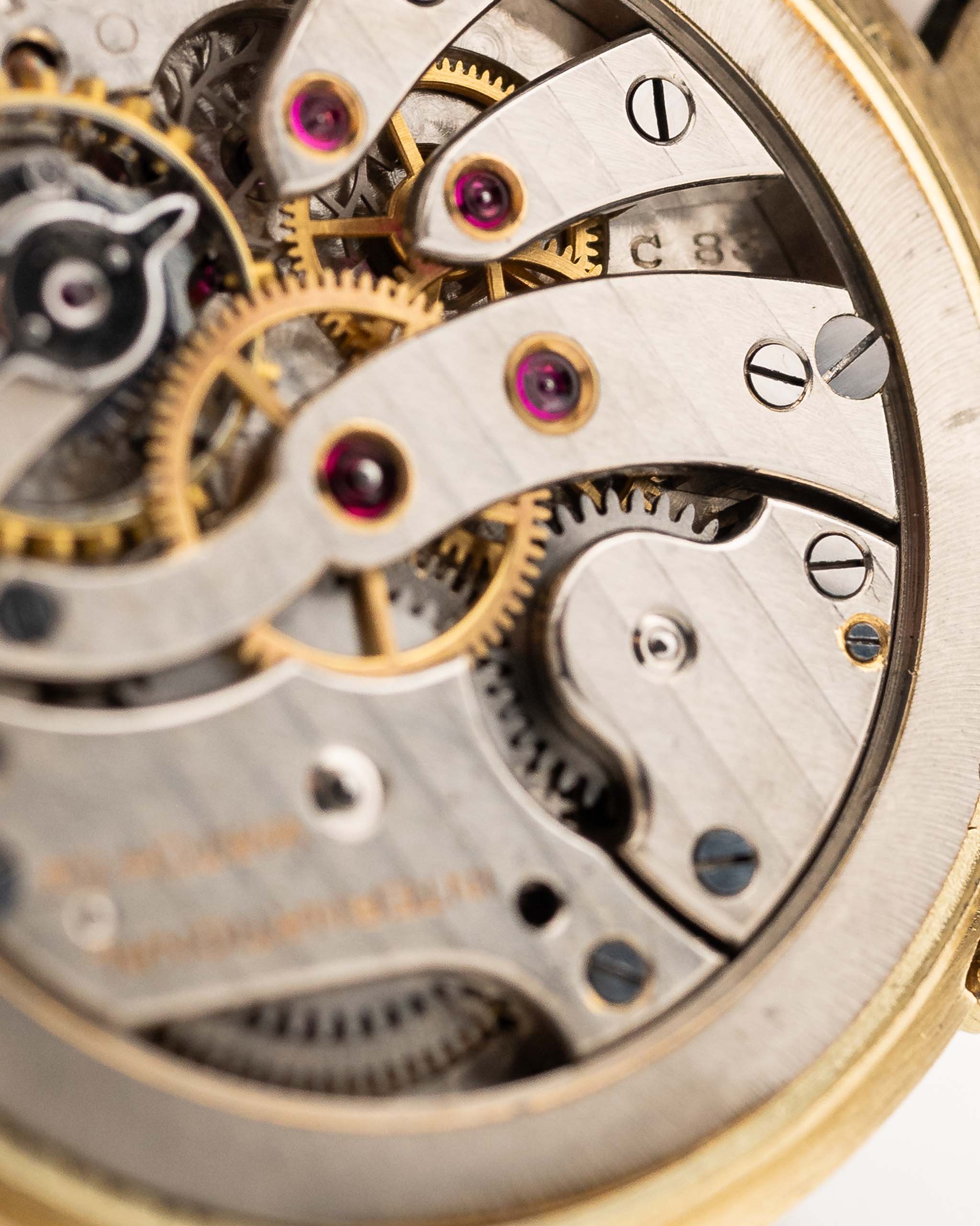 Der Name Hermet steht für die patentierte staub- und feuchtigkeitsbeständige Konstruktion, ein technischer Fortschritt, der seiner Zeit weit voraus war. Unser Modell scheint eine Vorversion der 1938-40 erschienenen Hermet zu sein. Das vergoldete Zifferblatt, unberührt und gleichmäßig gealtert, strahlt mit seinen scharfen arabischen Ziffern und den Originalzeigern, die von einer teilweise versenkten Krone umrahmt werden - eine diskrete Anspielung auf die durchdachte Technik im Inneren - Vintage-Wärme aus.