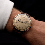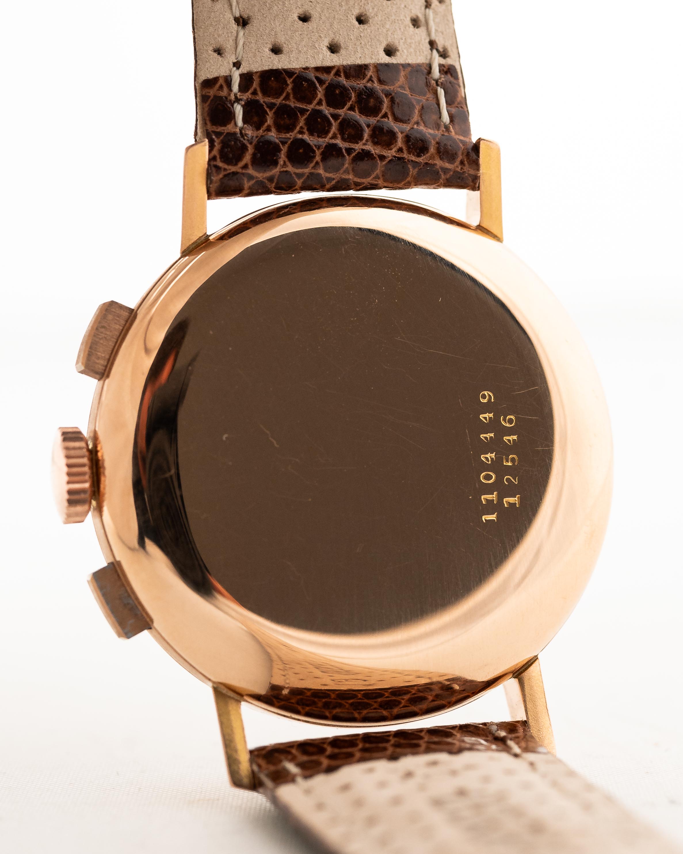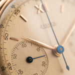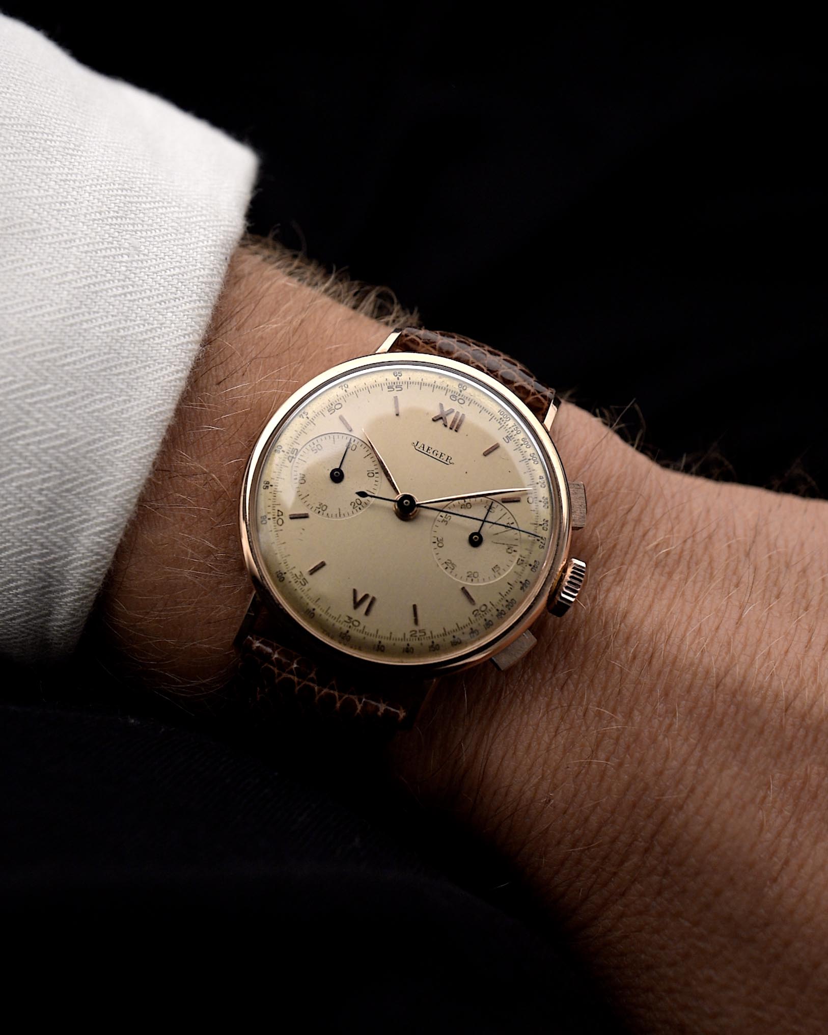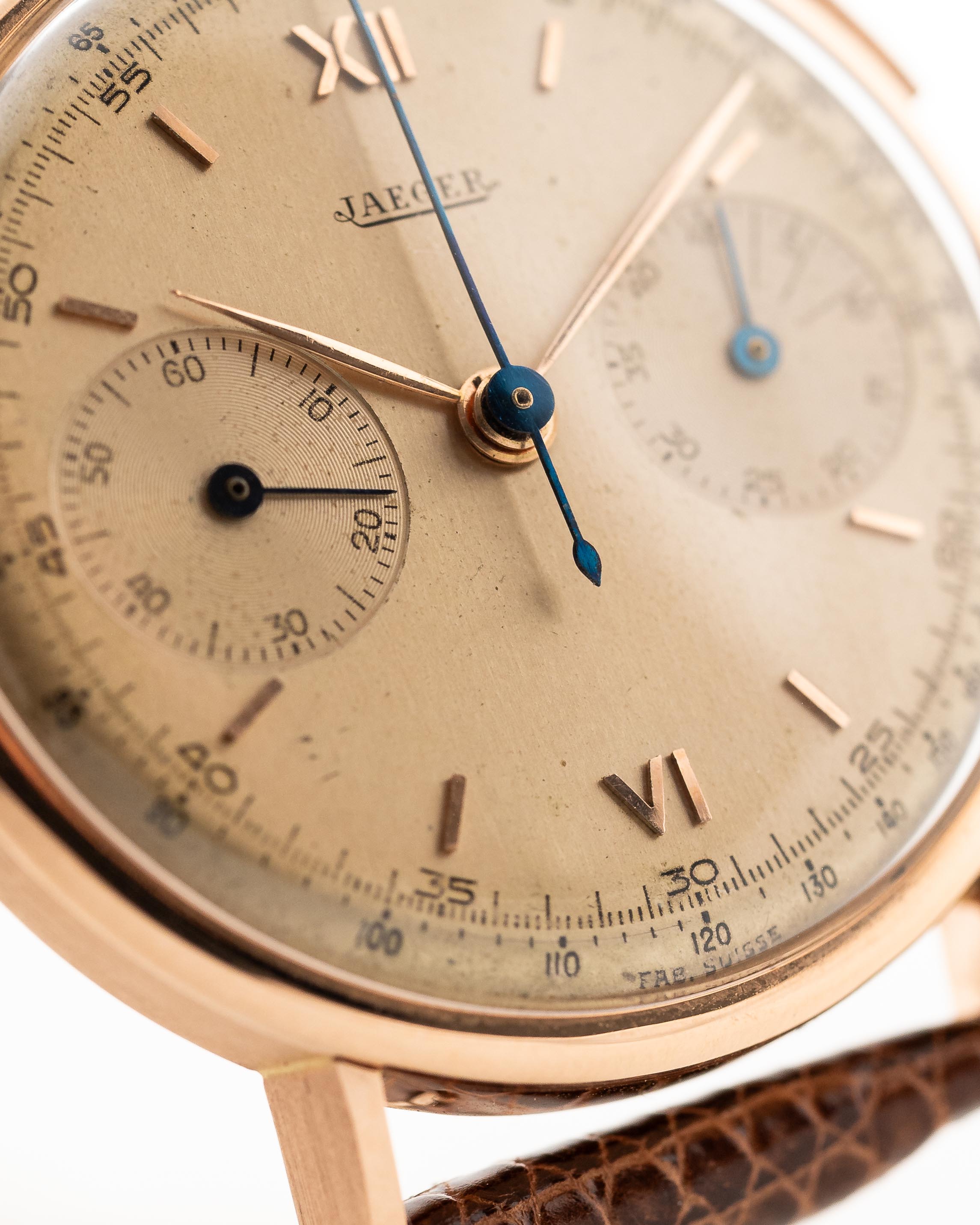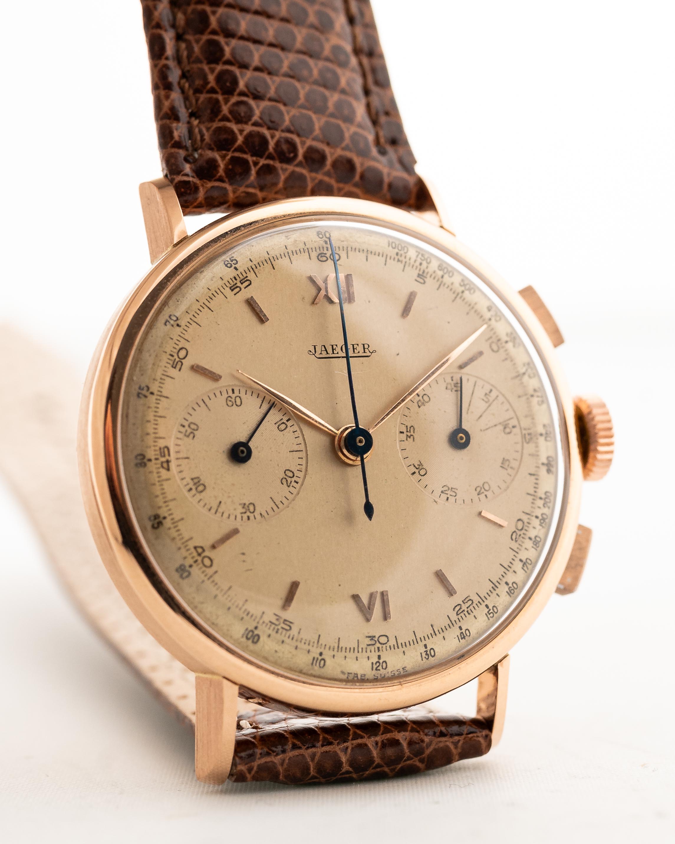 Hier haben wir einen außergewöhnlichen Jaeger Chronographen aus den 1940er Jahren mit einem atemberaubenden 36,5 mm Roségoldgehäuse und einem schönen silber/cremefarbenen Zifferblatt mit herrlichen Roségoldzeigern und -indizes.