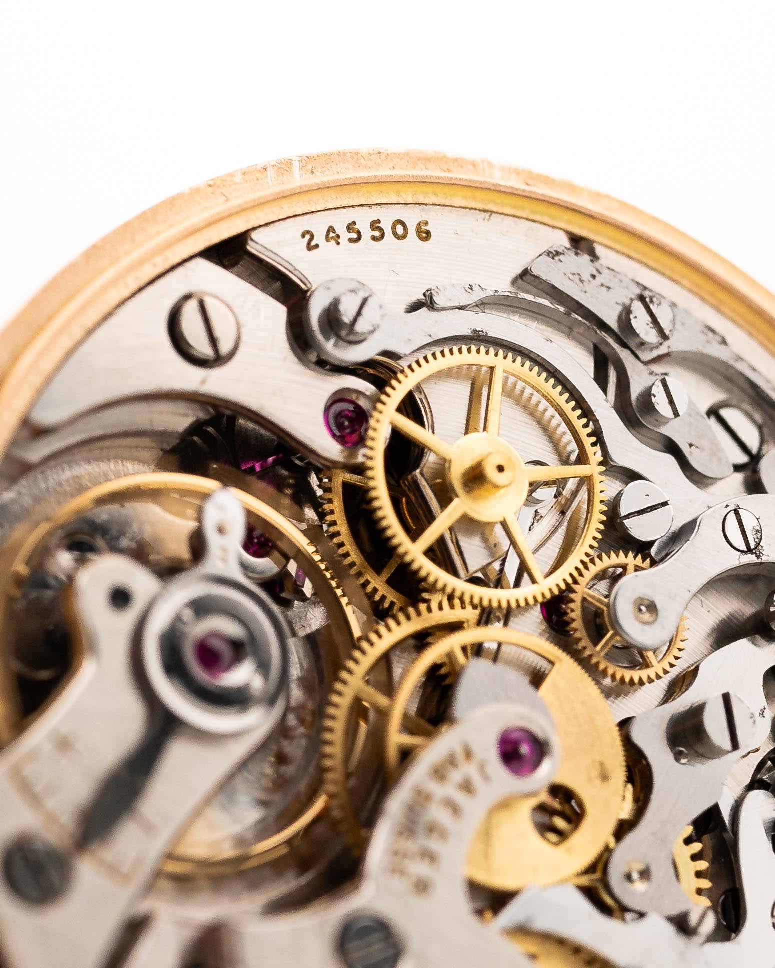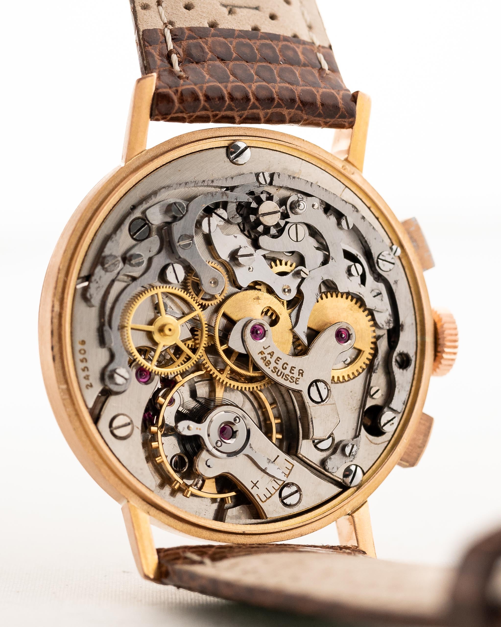 Sie wurde produziert, nachdem Jaeger und LeCoultre 1937 eine formelle Partnerschaft eingegangen waren, aber als fast alle Jaeger-LeCoultre Chronographen noch mit dem Namen Jaeger auf dem Zifferblatt und auf dem Uhrwerk vermarktet wurden. Man findet sie nur selten in einem so guten Originalzustand wie unser Beispiel.